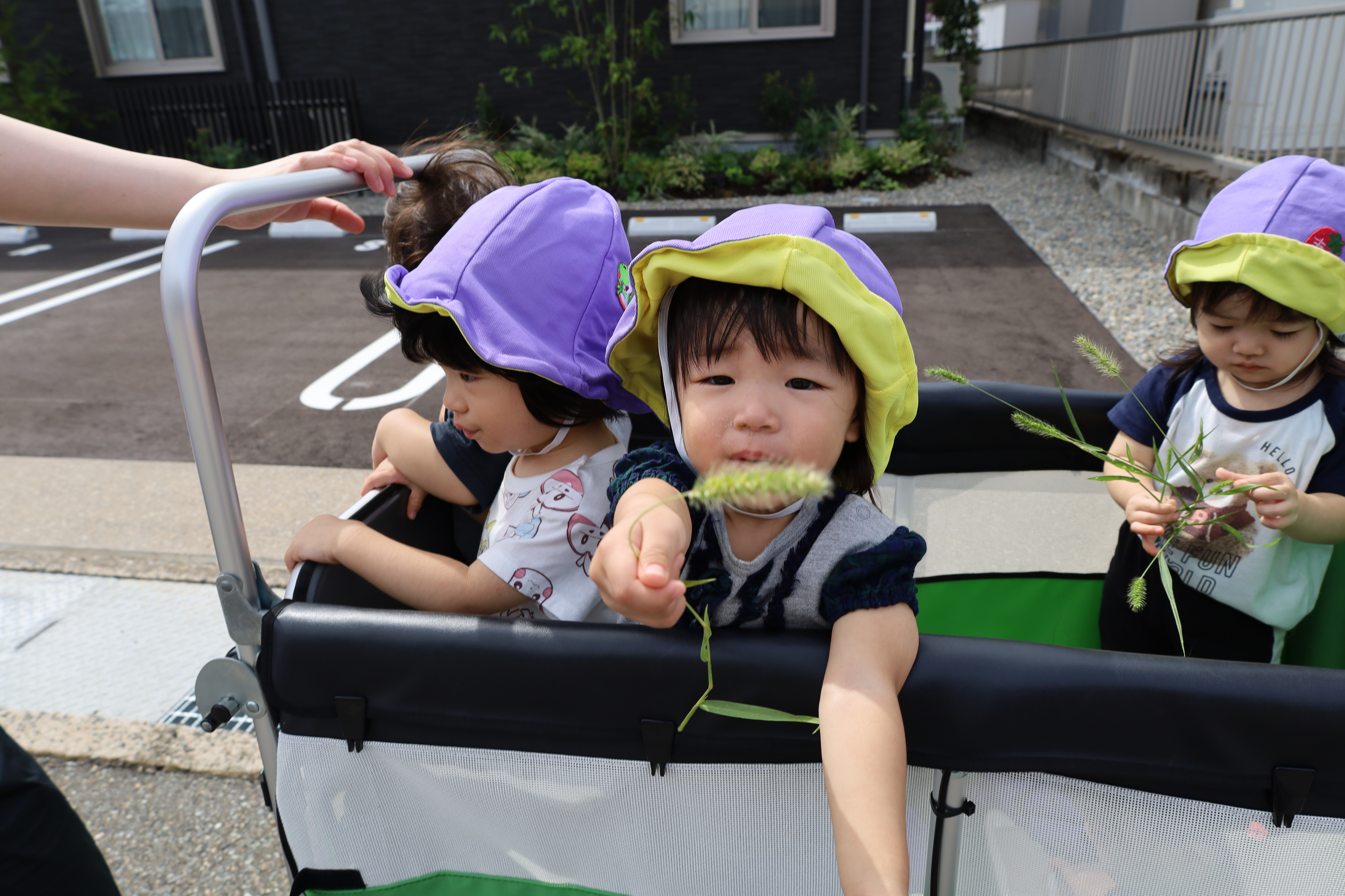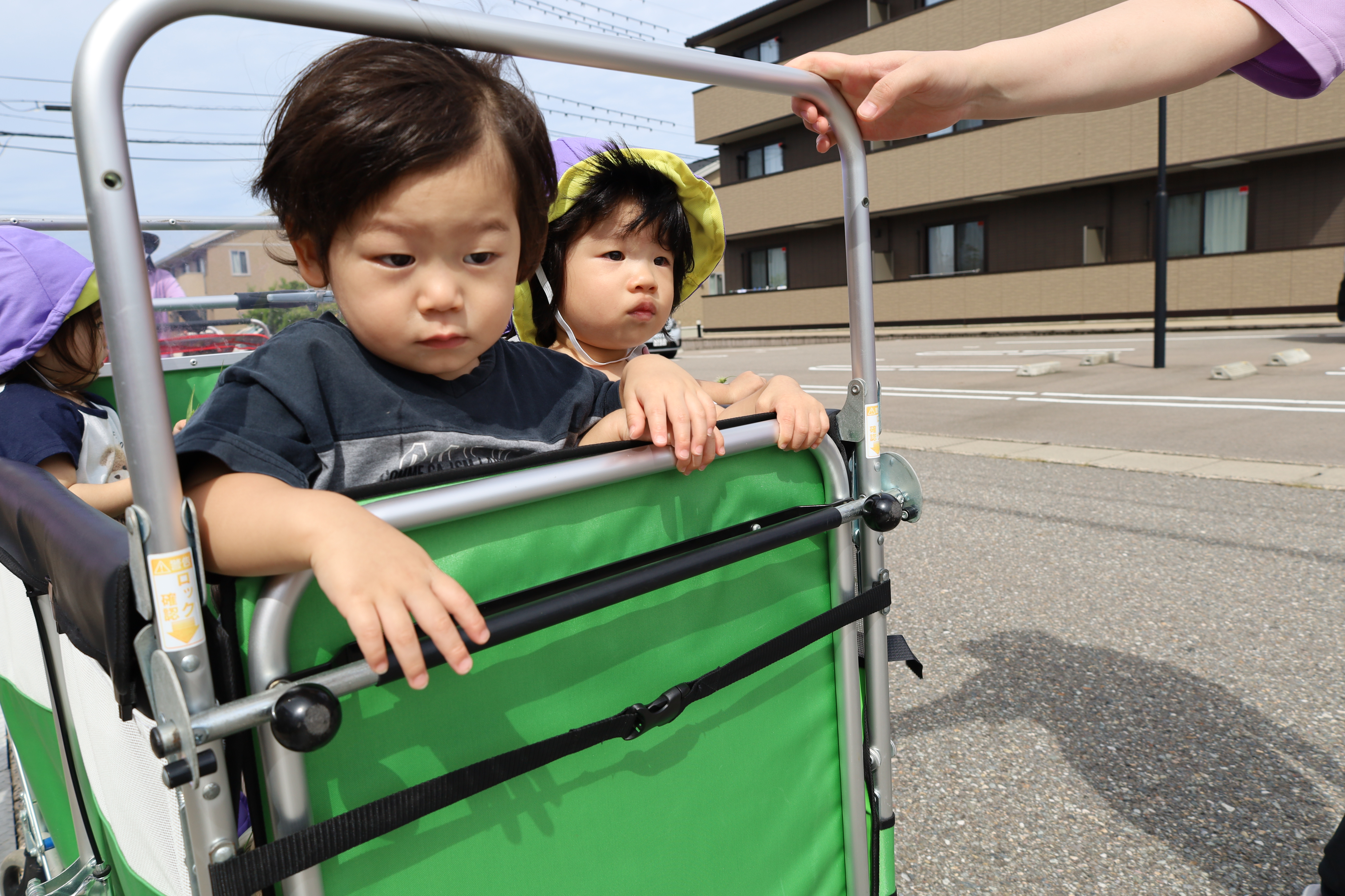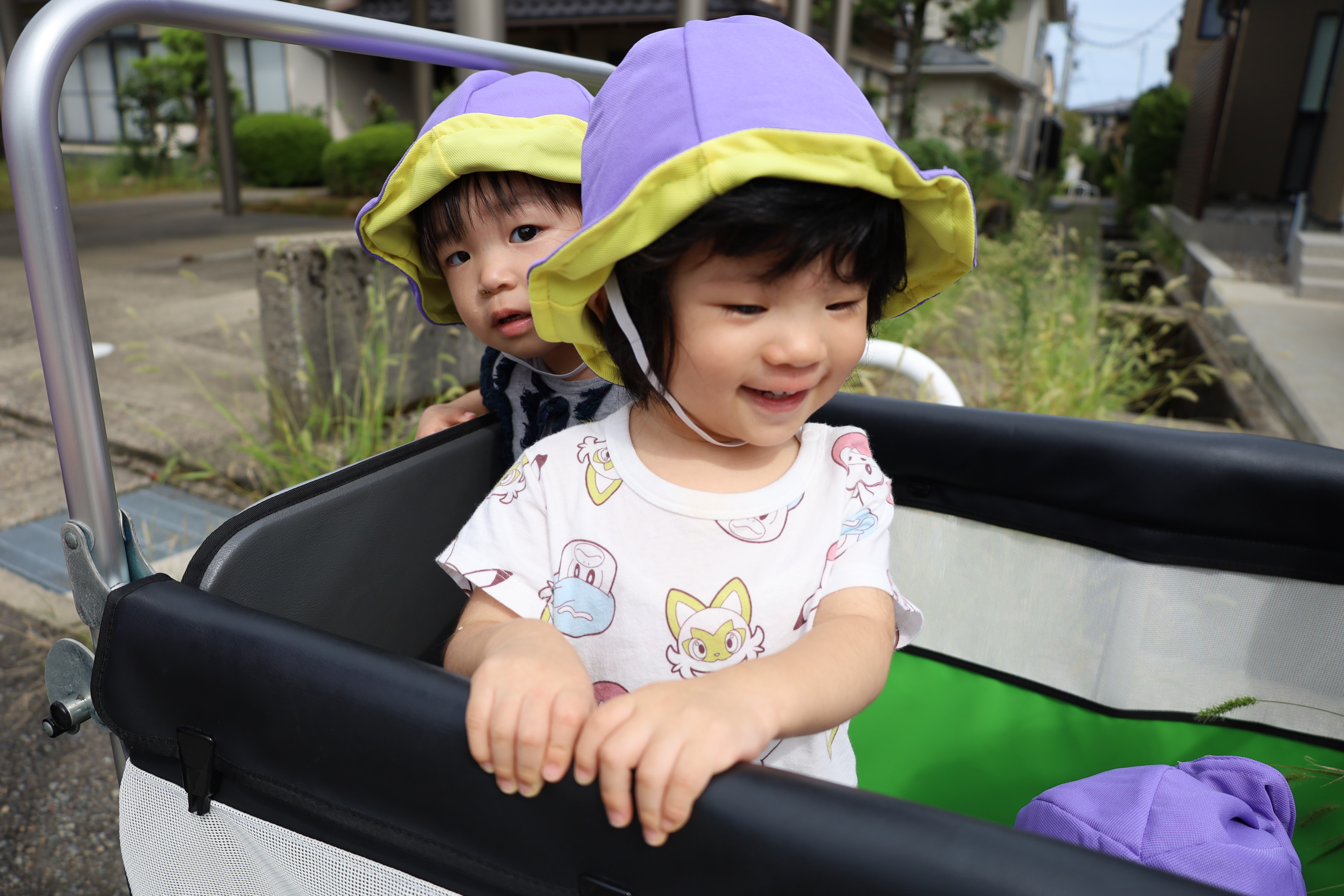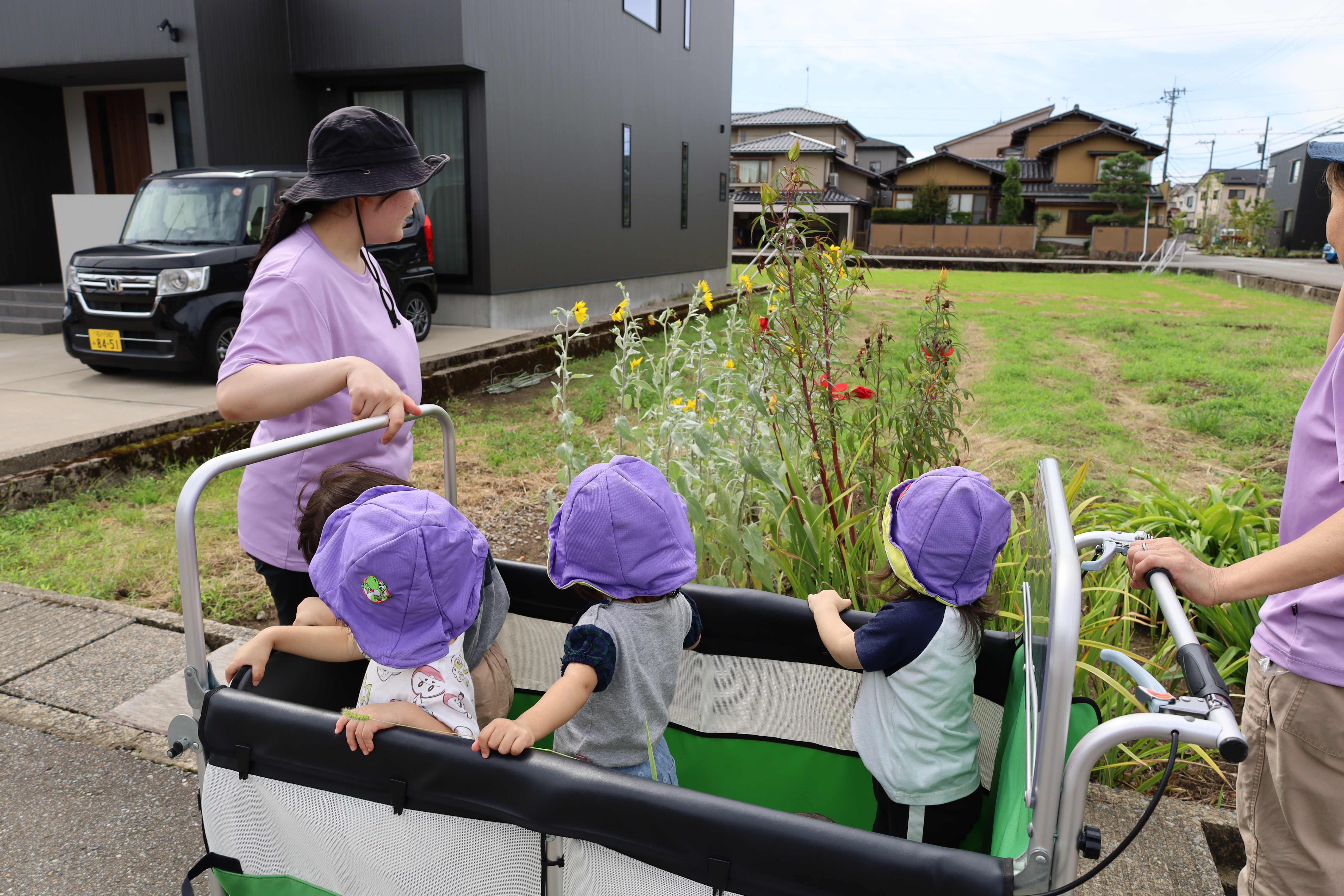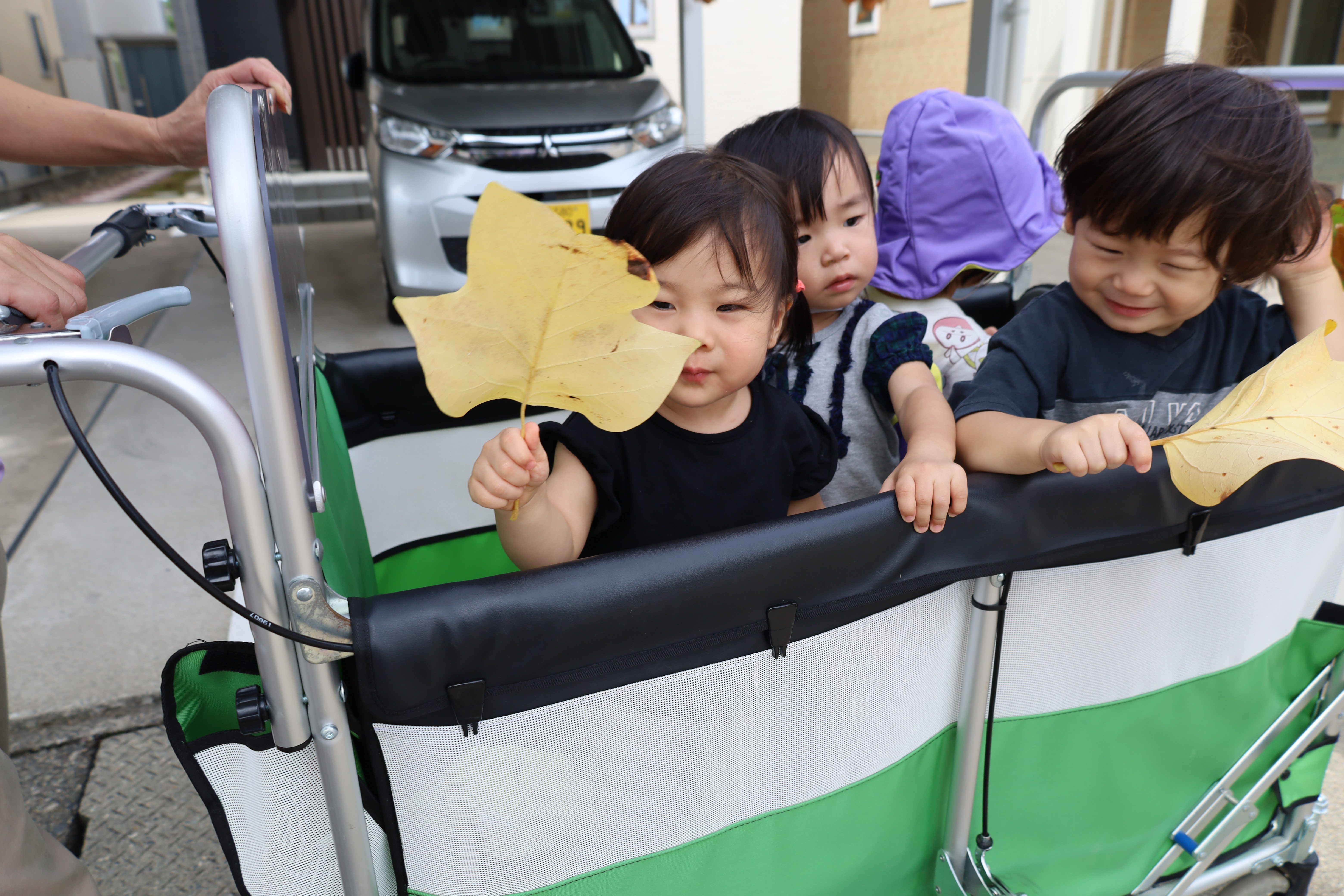 涼しい風を感じながら、カートに乗って一緒にお散歩に出かけました。