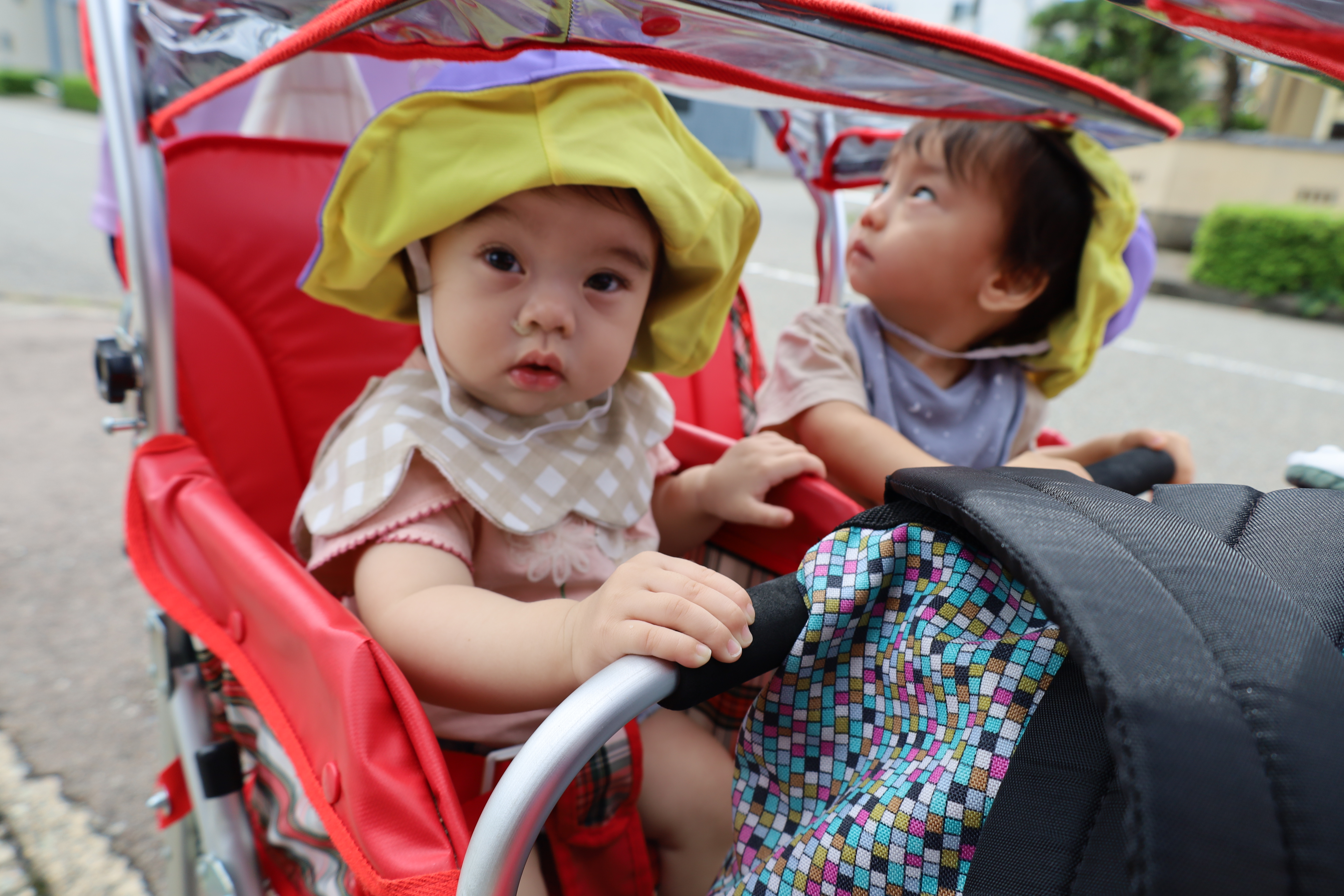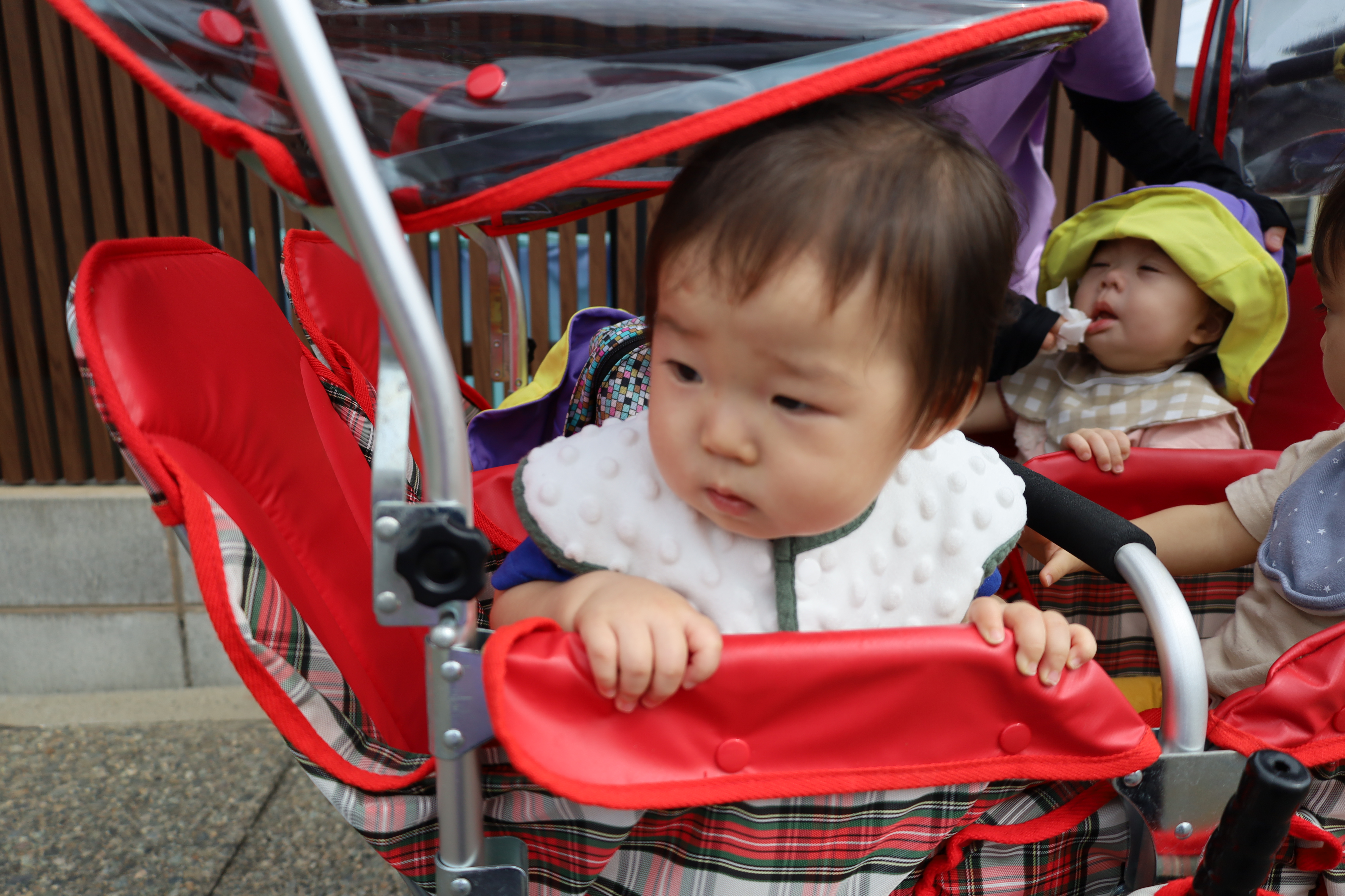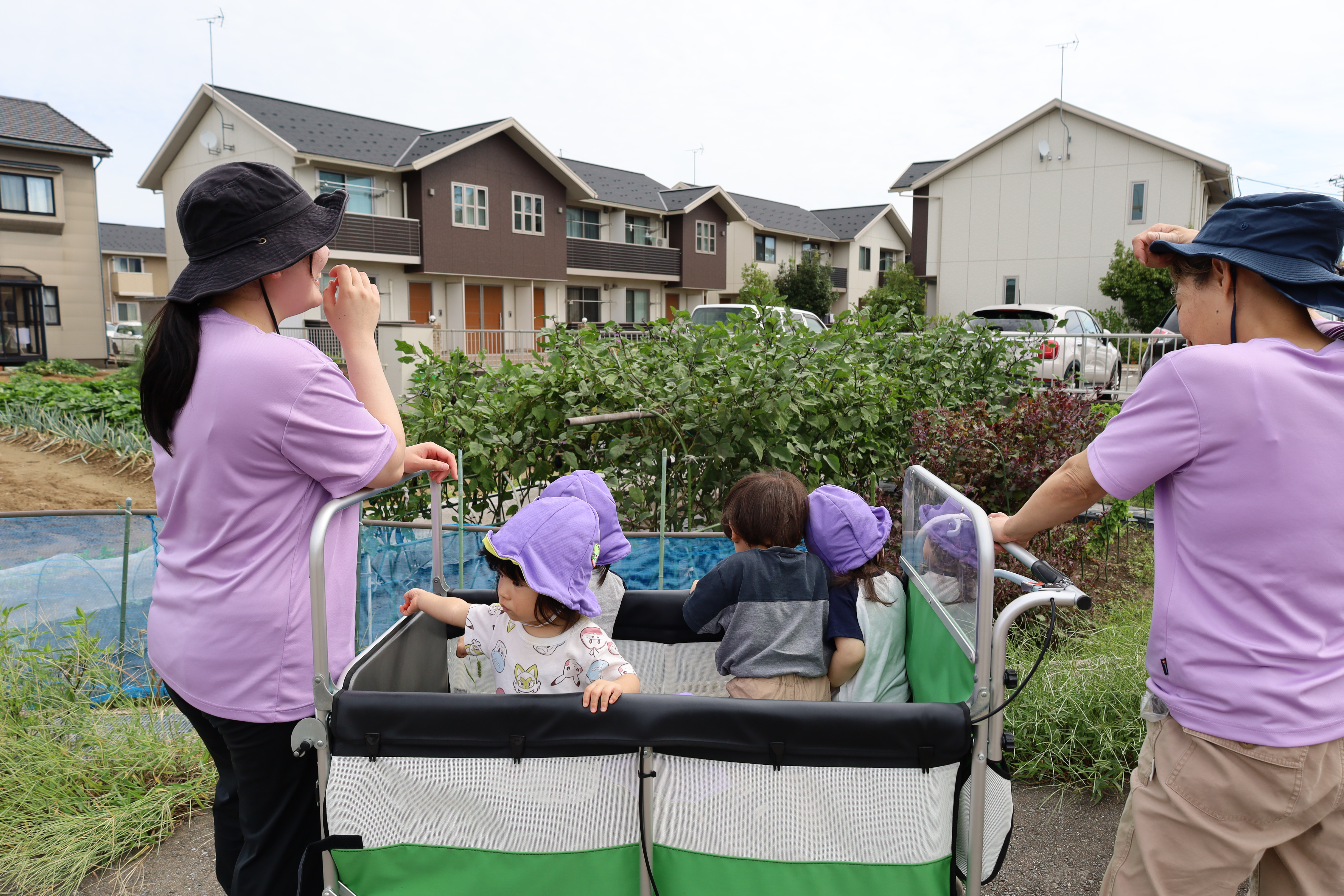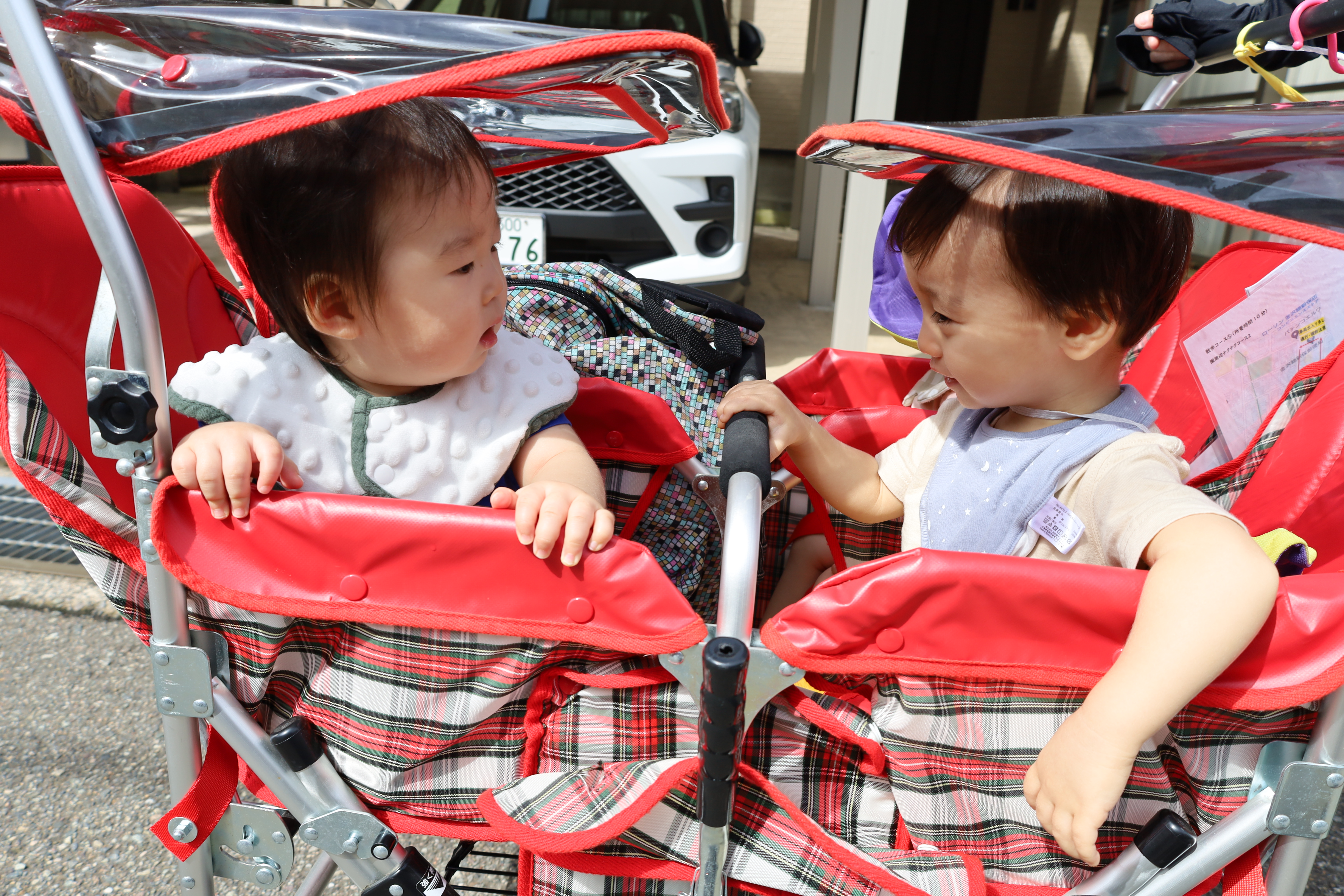 涼しい風を感じながら、カートに乗って一緒にお散歩に出かけました。
