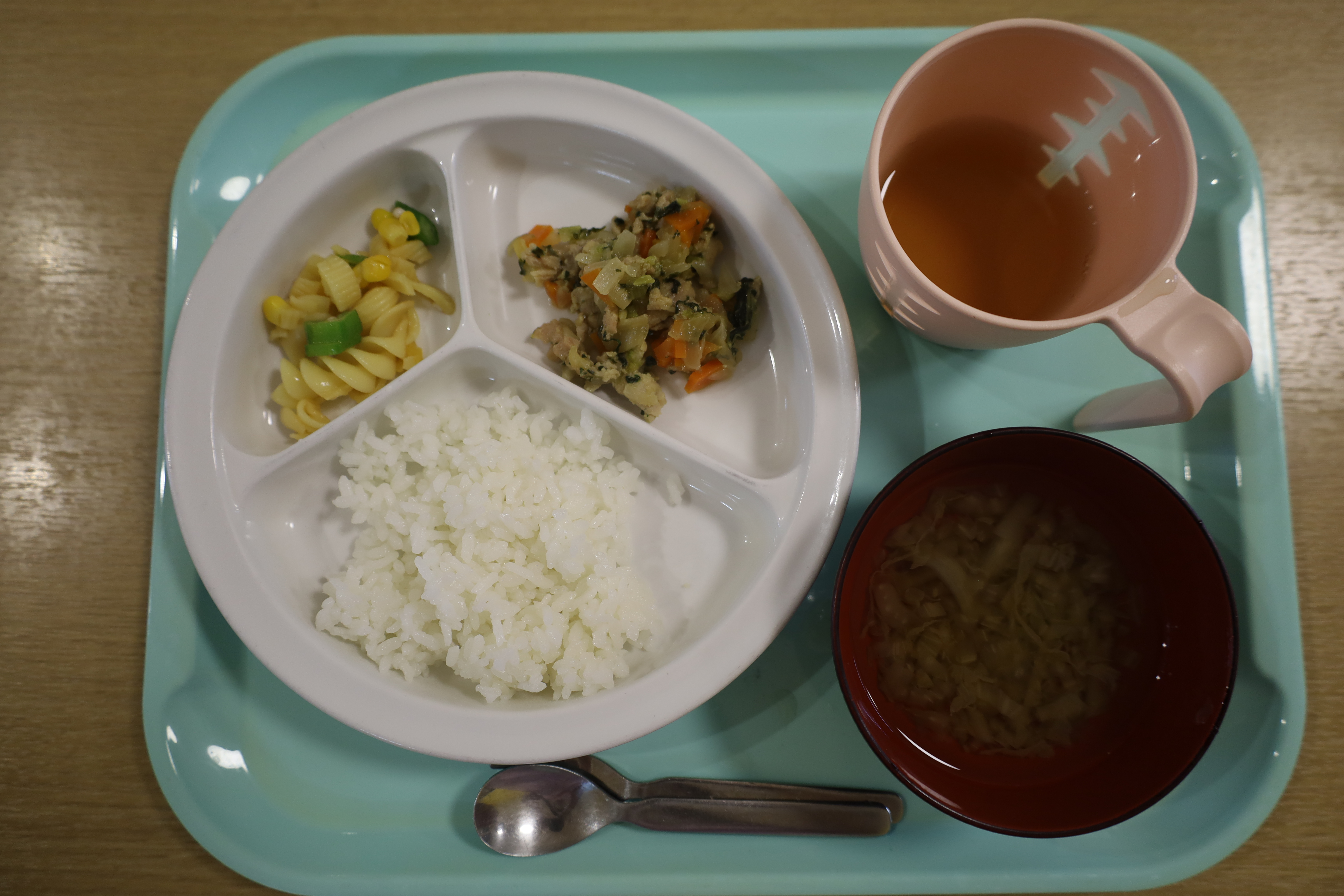 ご飯・鶏肉と野菜の中華炒め・マカロニサラダ・スープ(白菜・ごぼう)