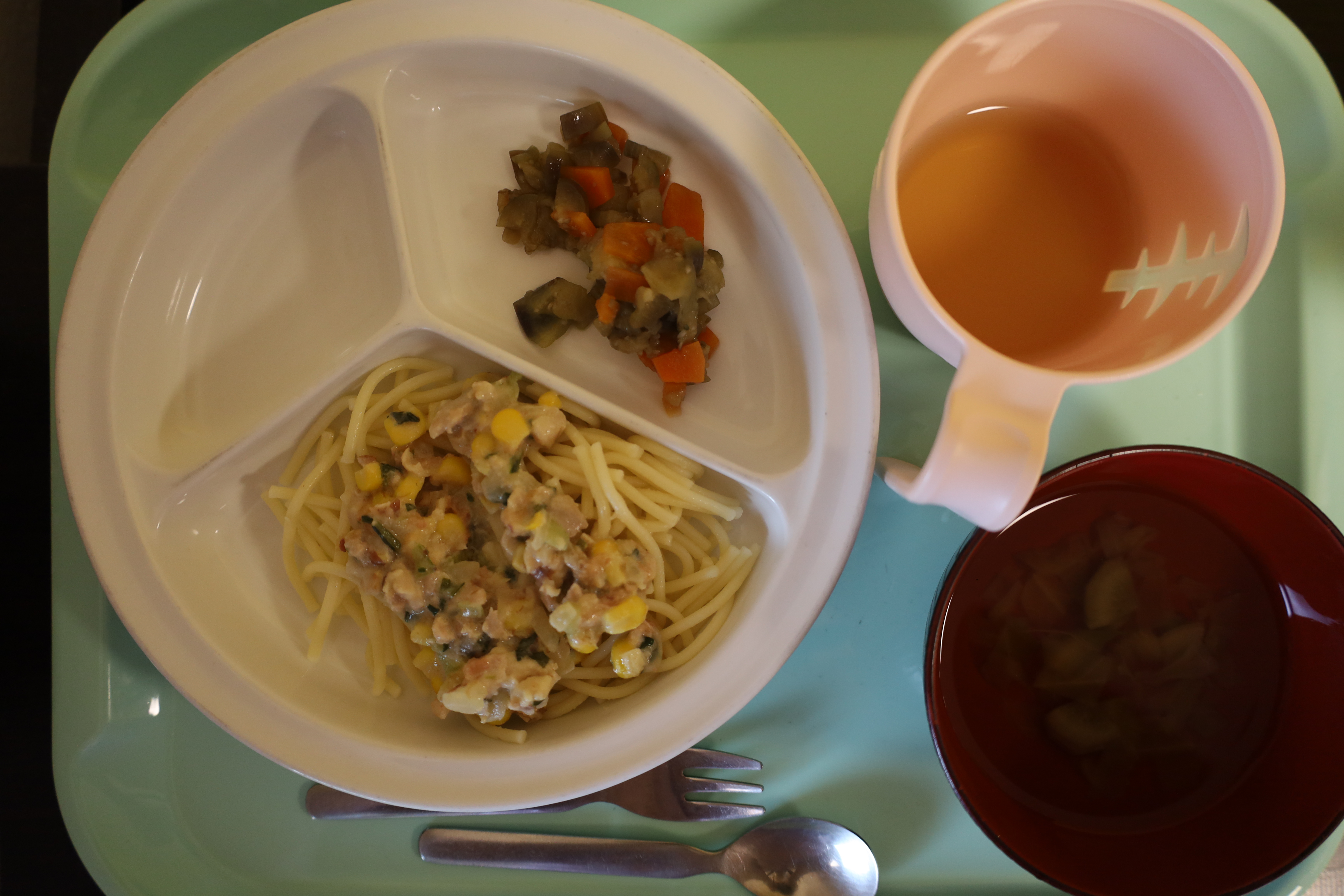 鶏肉の和豆乳ソースかけスパゲティ・ ナスと人参のさっぱり炒め・スープ(キャベツ・ごぼう)