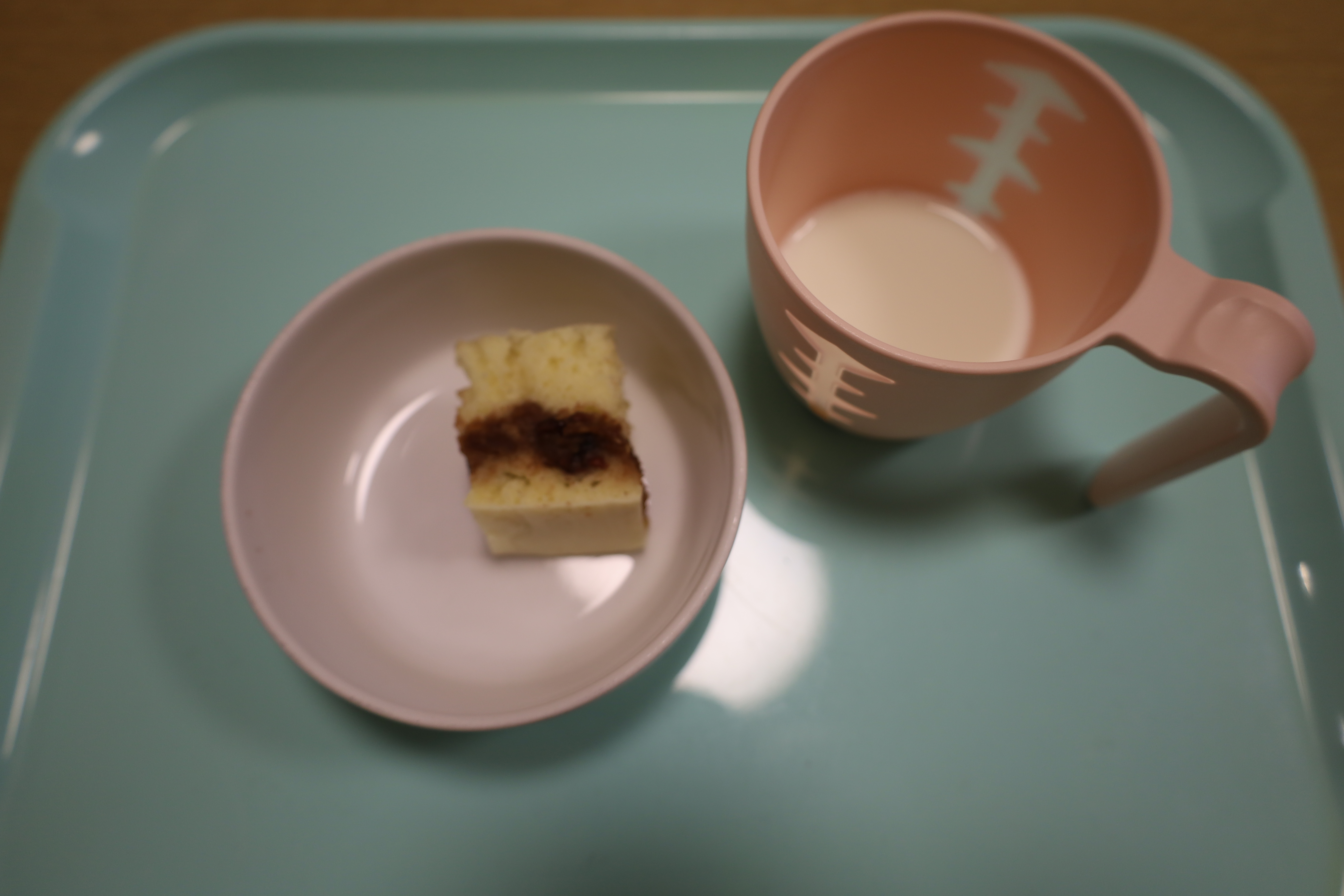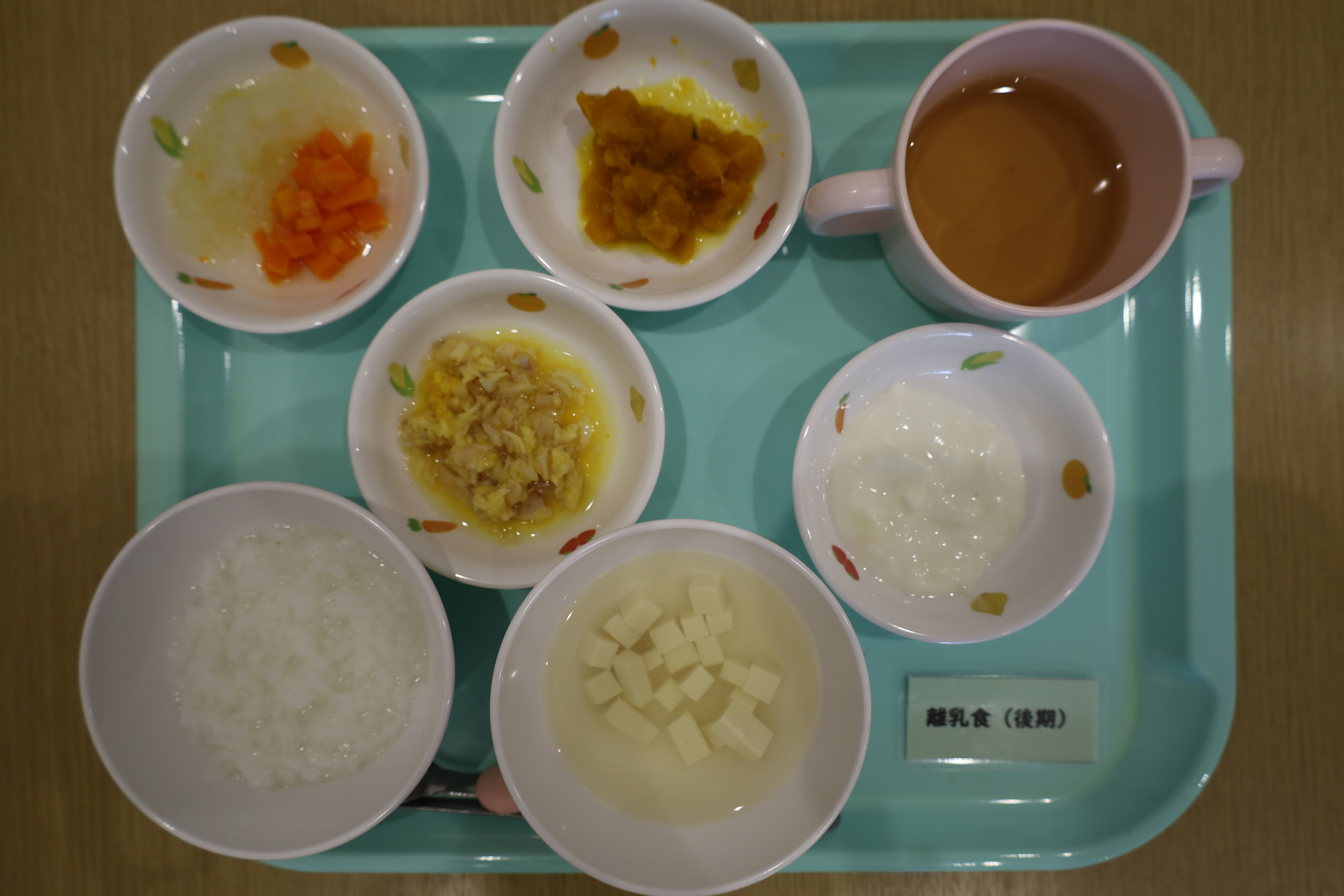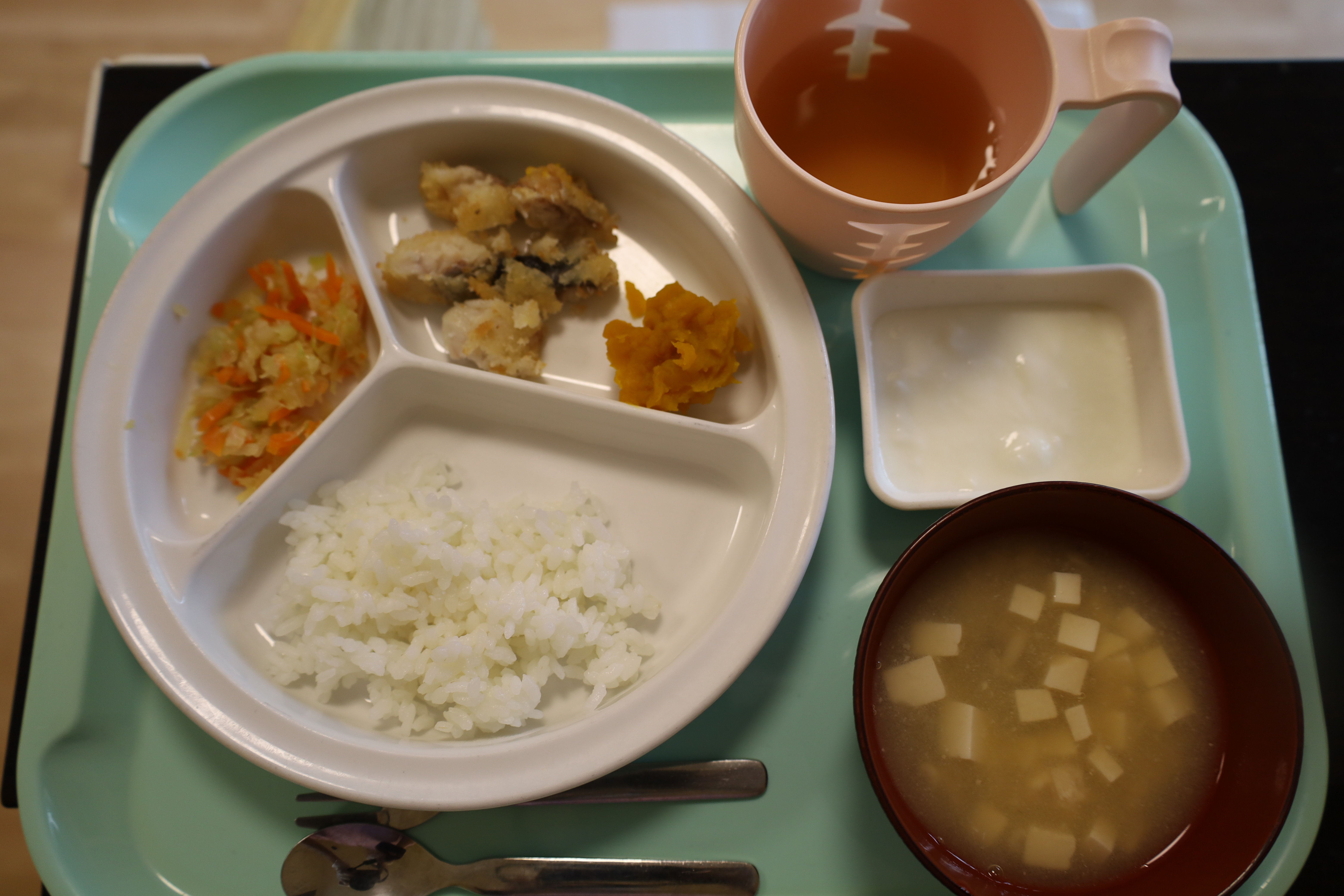 かゆ・白糸タラとカボチャのホクホク煮・キャベツと人参のだし煮・味噌汁・ヨーグルト