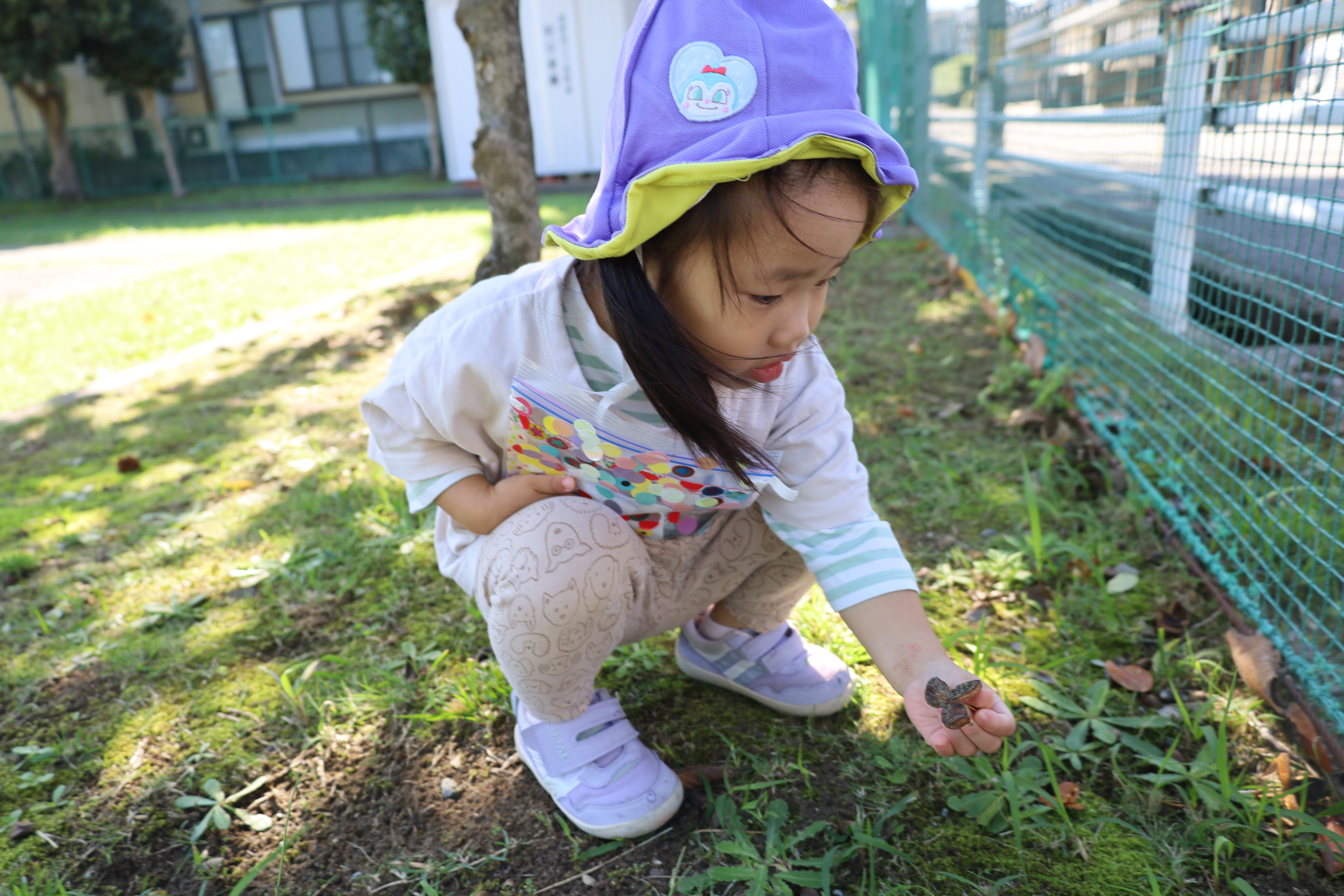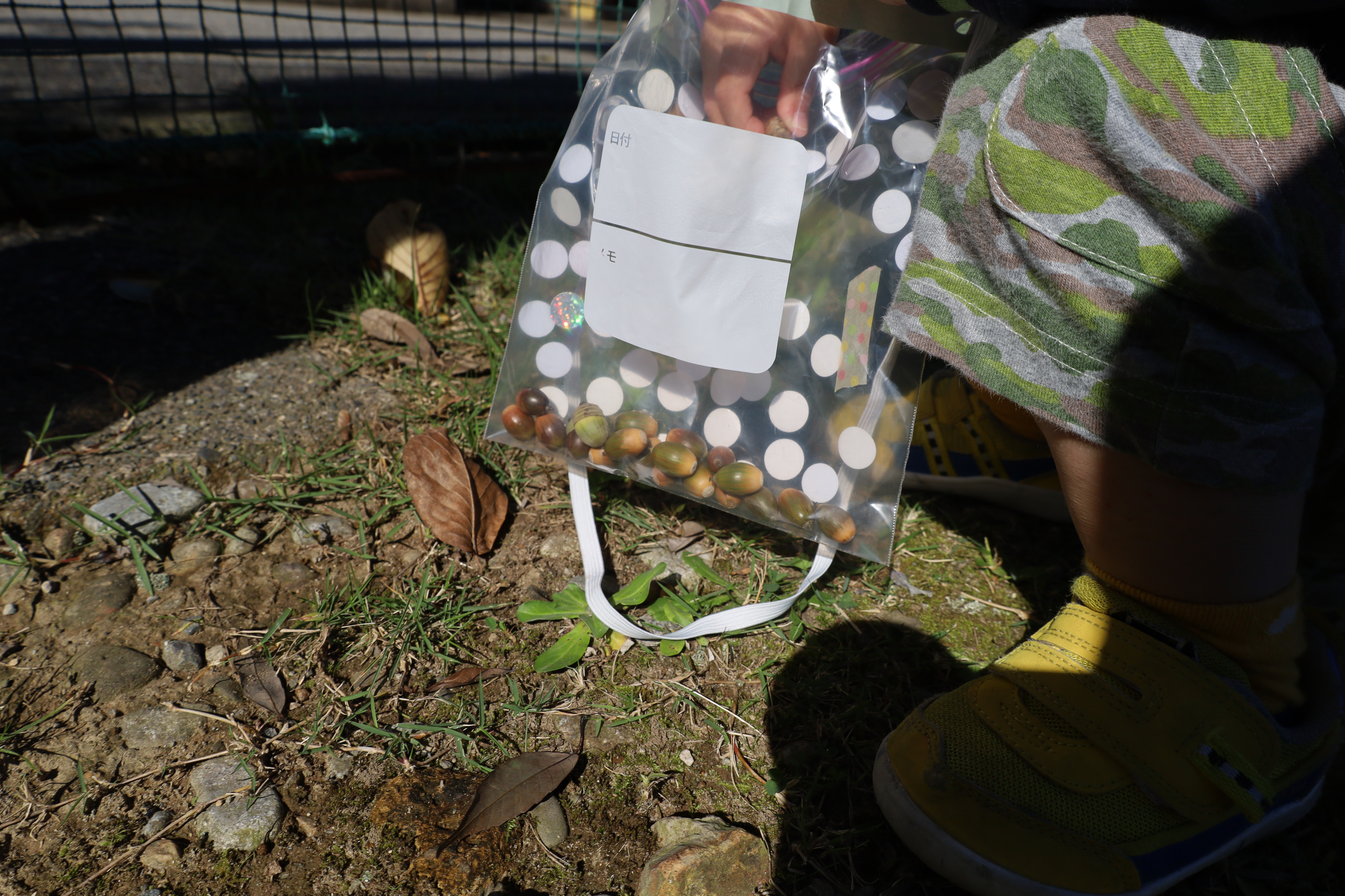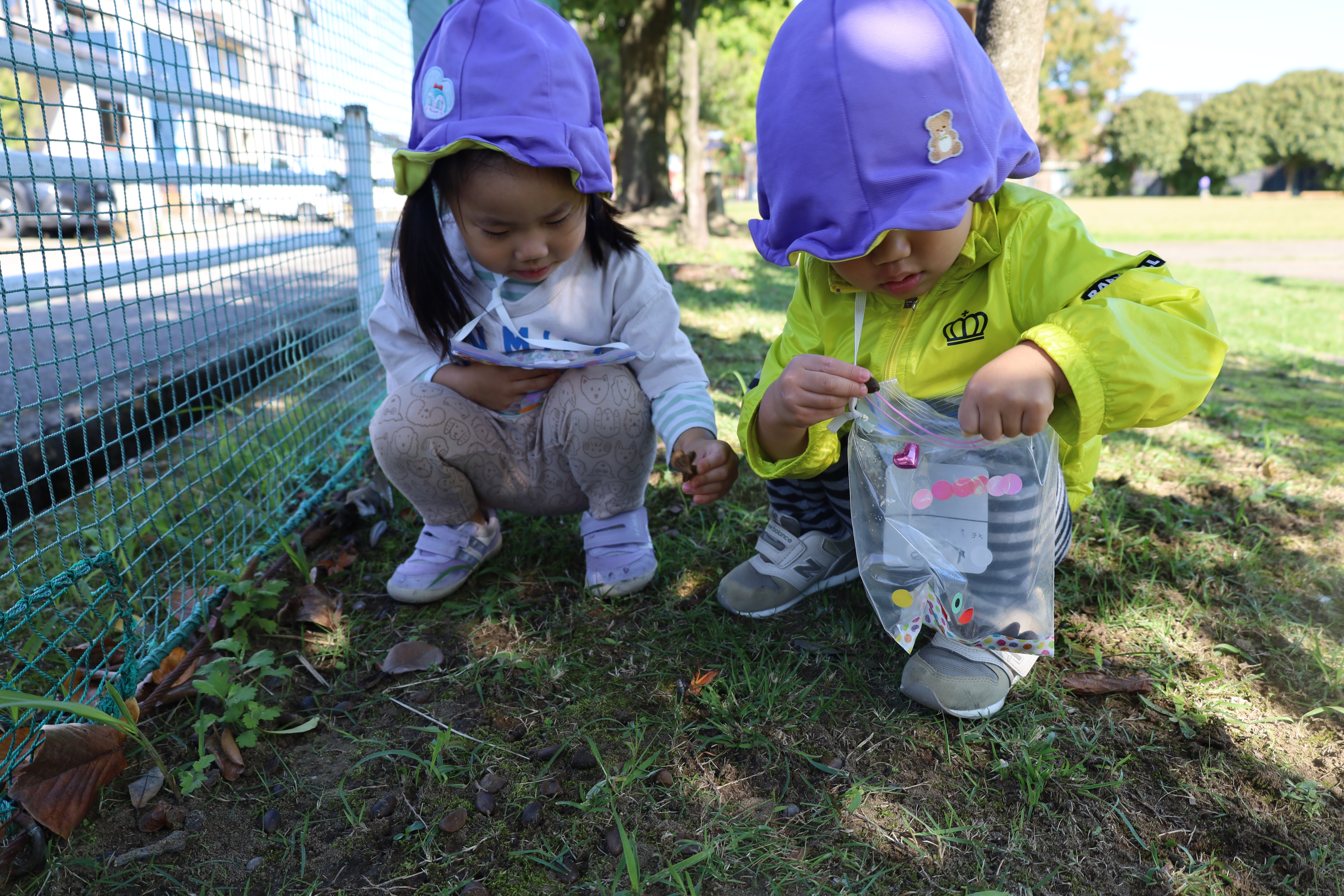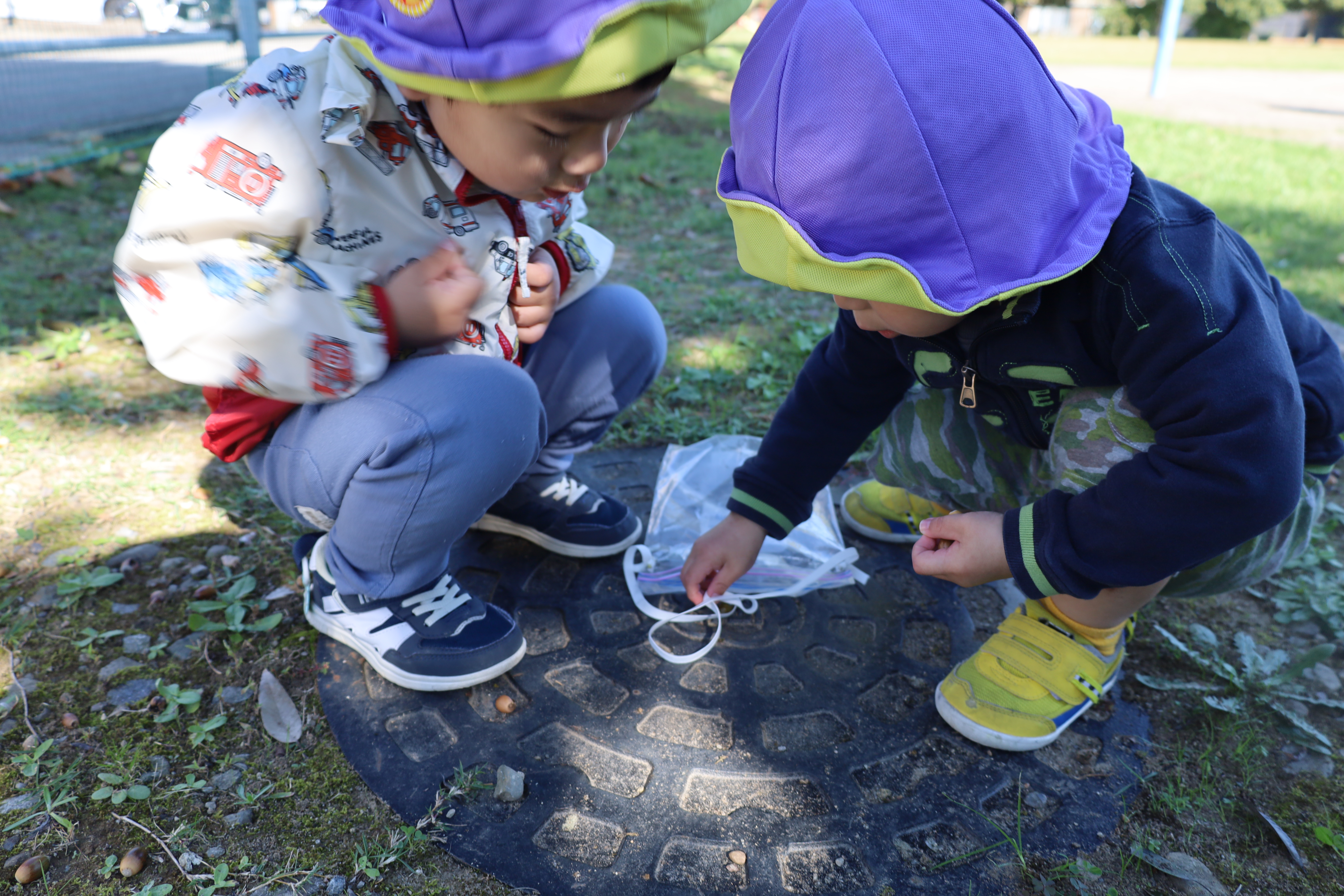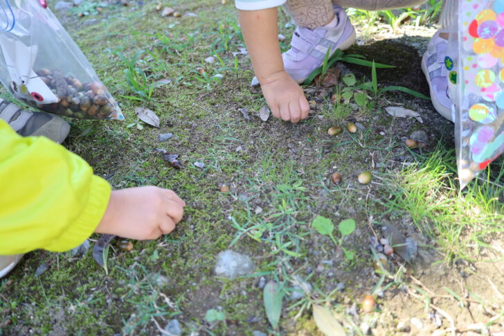 2025.10.23 はなえみhoujikai 2025/10/23 ドングリ集め ツイート シェア はてブ 送る Pocket みのりぐみ とってもいいお天気。大好きな公園にやってきました。 今日は何を見つけるのかな? キレイなお花!! どんぐりみいつけた! みいつけた。 かわいいね。 広い公園のあちらこちらにたくさんドングリが落ちています。みんな早速集め始めました。 こんなトコにもあったよ。 忘れず拾おう。 木の幹についているコレはなんだろう・・・? ここにはたくさん落ちている。 やった!ゲットした! ここにもあったよ。 たくさん、拾おう! 真剣な眼差し。まるで、収穫作業をしている農家さんのようです。 うん、これはいいな~。 お散歩バックに大量のドングリ。 どんぐりいっぱい、大収穫!! 大好きな公園、また来るね。まっててね。 10月23日 今日の給食 離乳食・後期 かゆ・鶏肉と野菜のやわらか煮(人参スティック)・白菜サラダ・スープ・フルーツ(オレンジ) 幼児食 ハヤシライス・白菜のコーン和え・スープ(大根・ワカメ)フルーツ(オレンジ) 幼児食・午後おやつ 牛乳・しらすのハッシュポテト・スティック野菜
