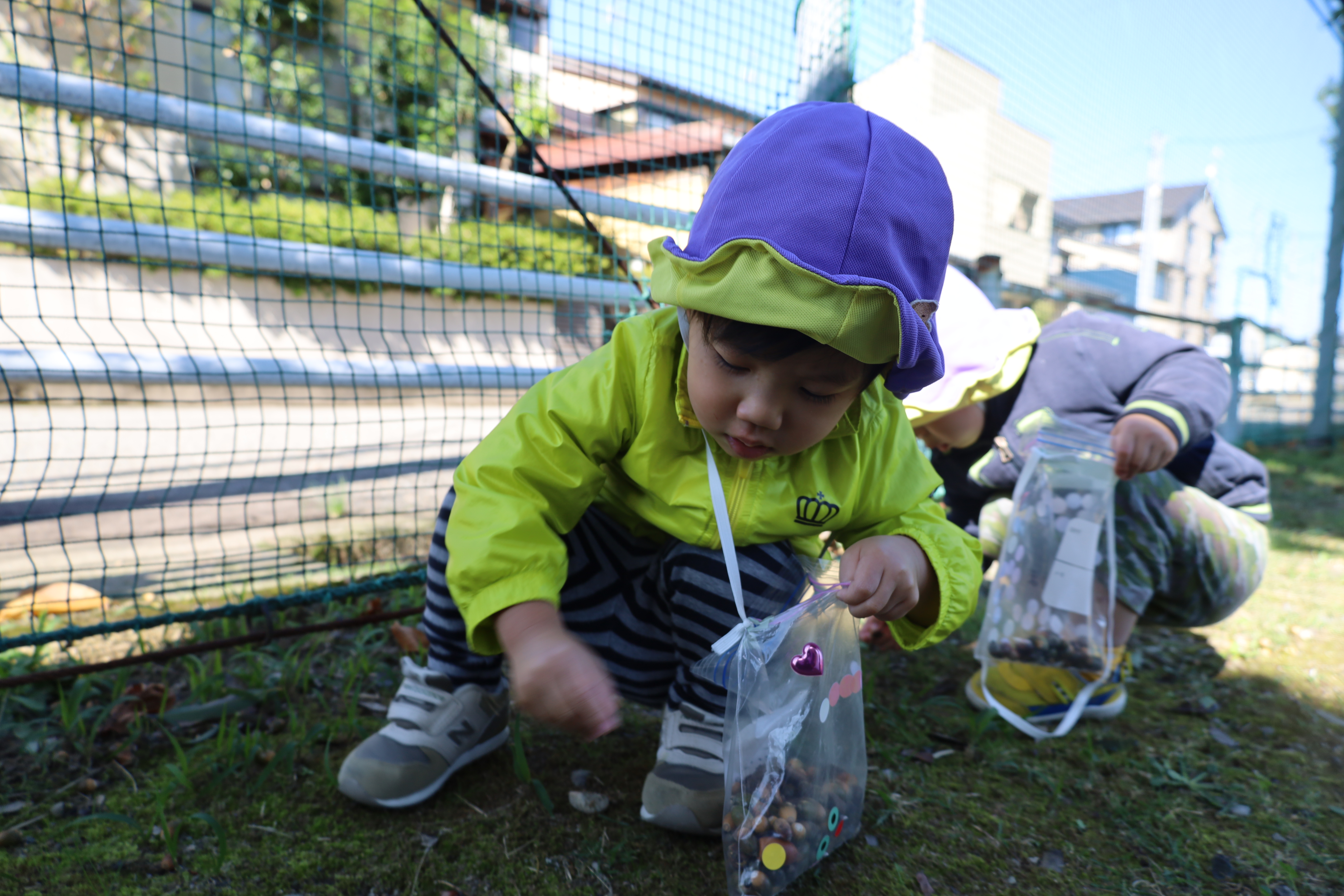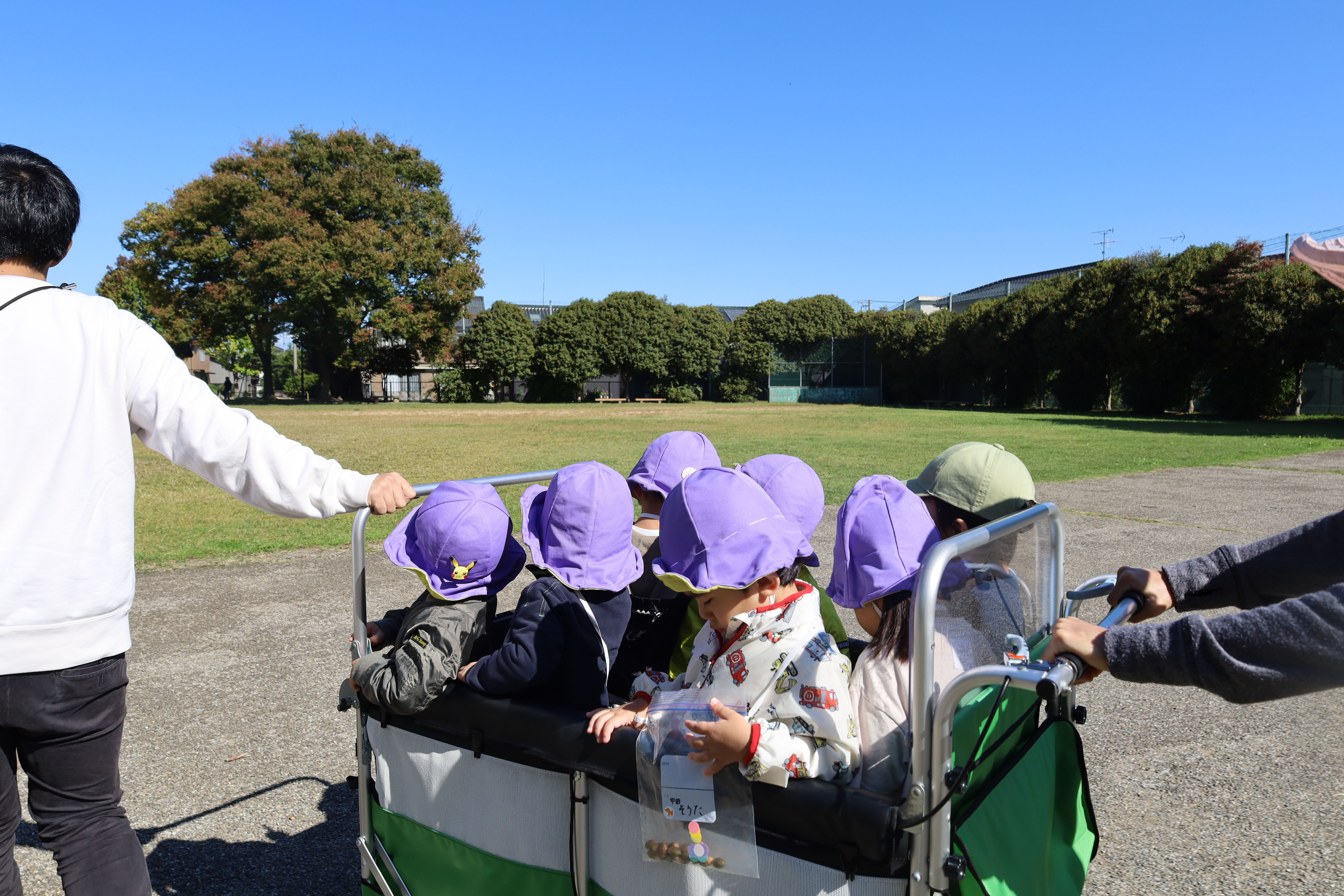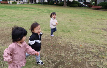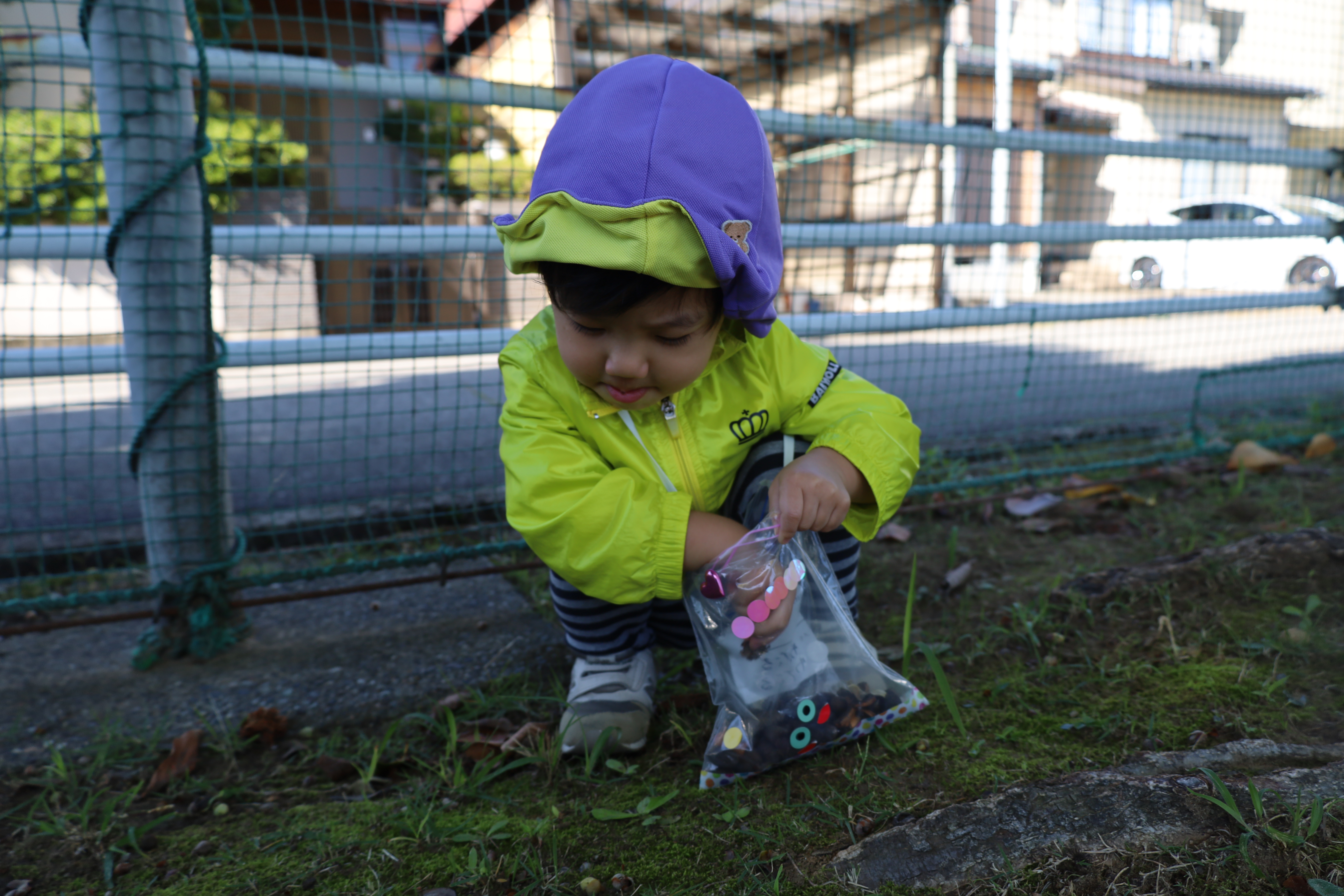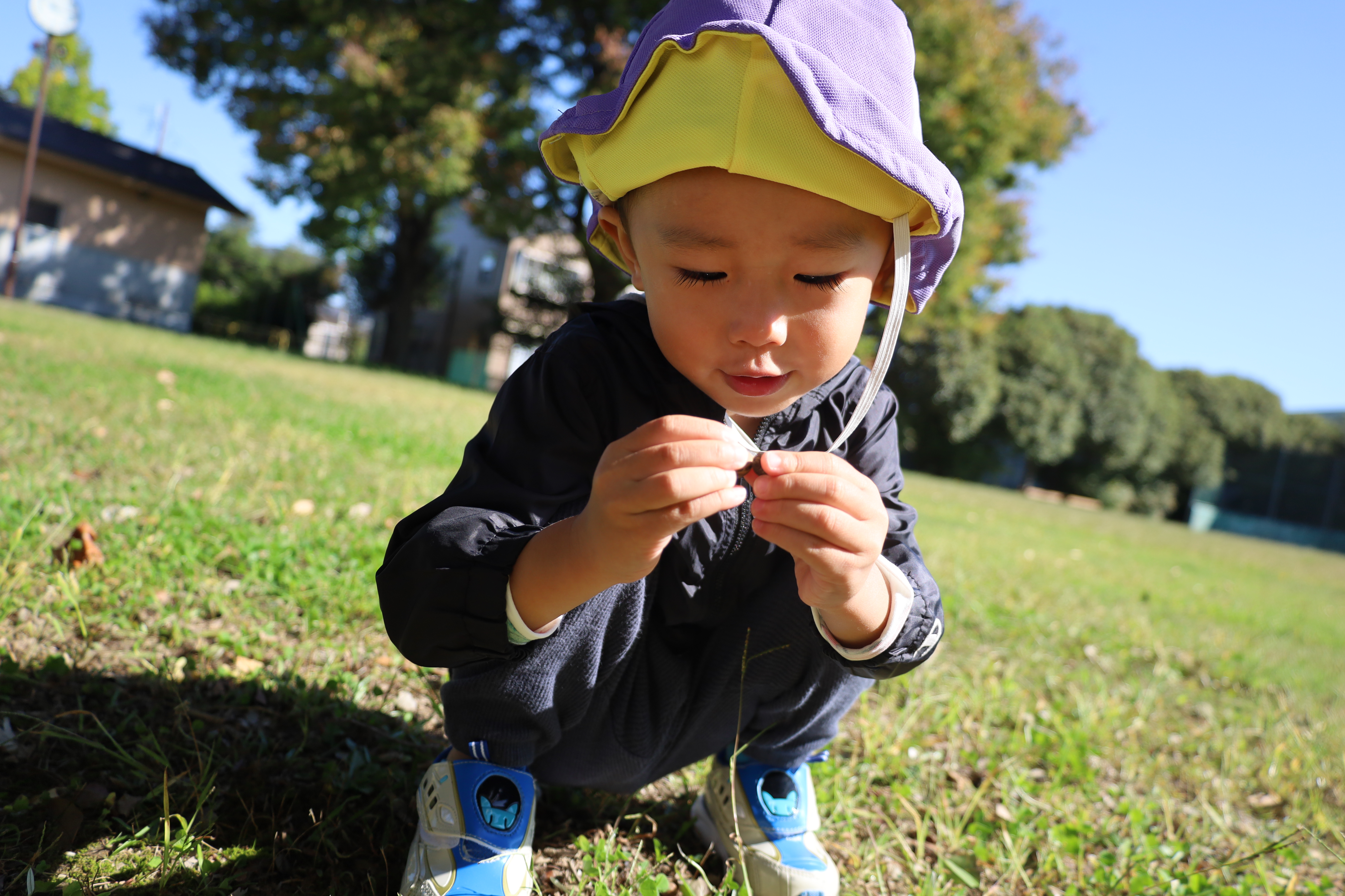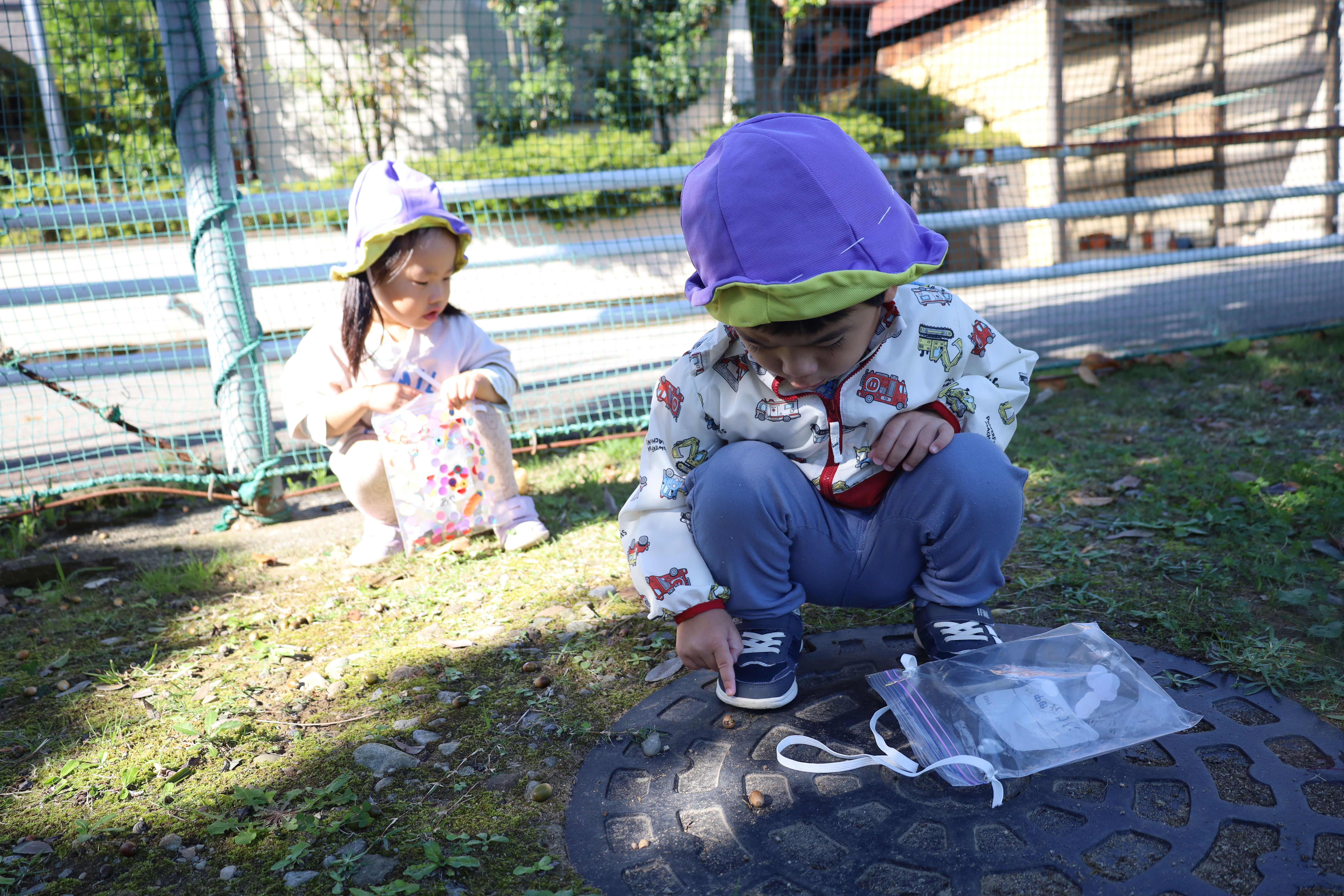 2025.10.23 はなえみhoujikai 2025/10/23 ドングリ集め ツイート シェア はてブ 送る Pocket みのりぐみ とってもいいお天気。大好きな公園にやってきました。 今日は何を見つけるのかな? キレイなお花!! どんぐりみいつけた! みいつけた。 かわいいね。 広い公園のあちらこちらにたくさんドングリが落ちています。みんな早速集め始めました。 こんなトコにもあったよ。 忘れず拾おう。 木の幹についているコレはなんだろう・・・? ここにはたくさん落ちている。 やった!ゲットした! ここにもあったよ。 たくさん、拾おう! 真剣な眼差し。まるで、収穫作業をしている農家さんのようです。 うん、これはいいな~。 お散歩バックに大量のドングリ。 どんぐりいっぱい、大収穫!! 大好きな公園、また来るね。まっててね。 10月23日 今日の給食 離乳食・後期 かゆ・鶏肉と野菜のやわらか煮(人参スティック)・白菜サラダ・スープ・フルーツ(オレンジ) 幼児食 ハヤシライス・白菜のコーン和え・スープ(大根・ワカメ)フルーツ(オレンジ) 幼児食・午後おやつ 牛乳・しらすのハッシュポテト・スティック野菜