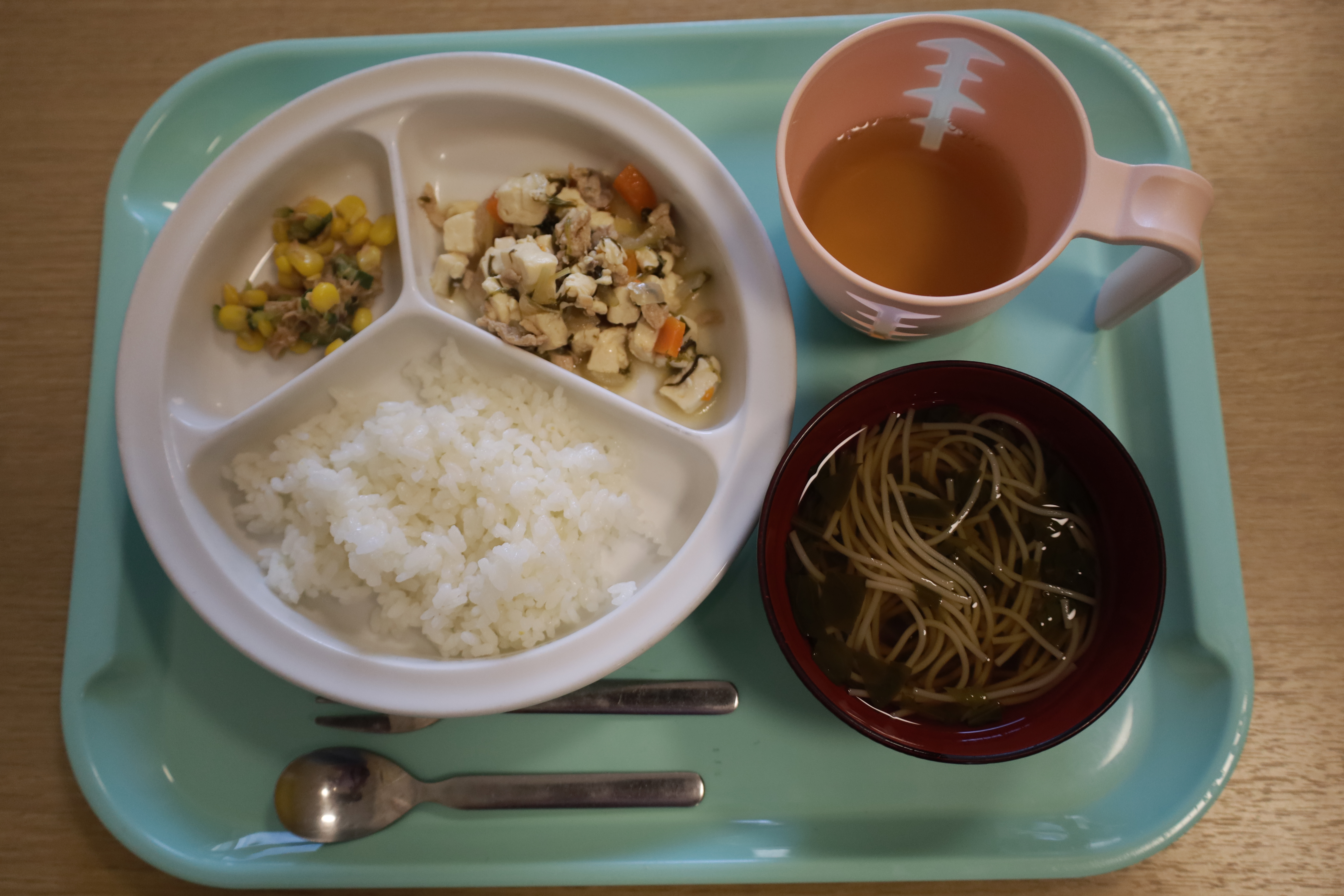 ご飯・豆腐と鶏肉の味噌煮・きゅうりとコーンのツナサラダ・すまし汁(ほうれん草・ソーメン)