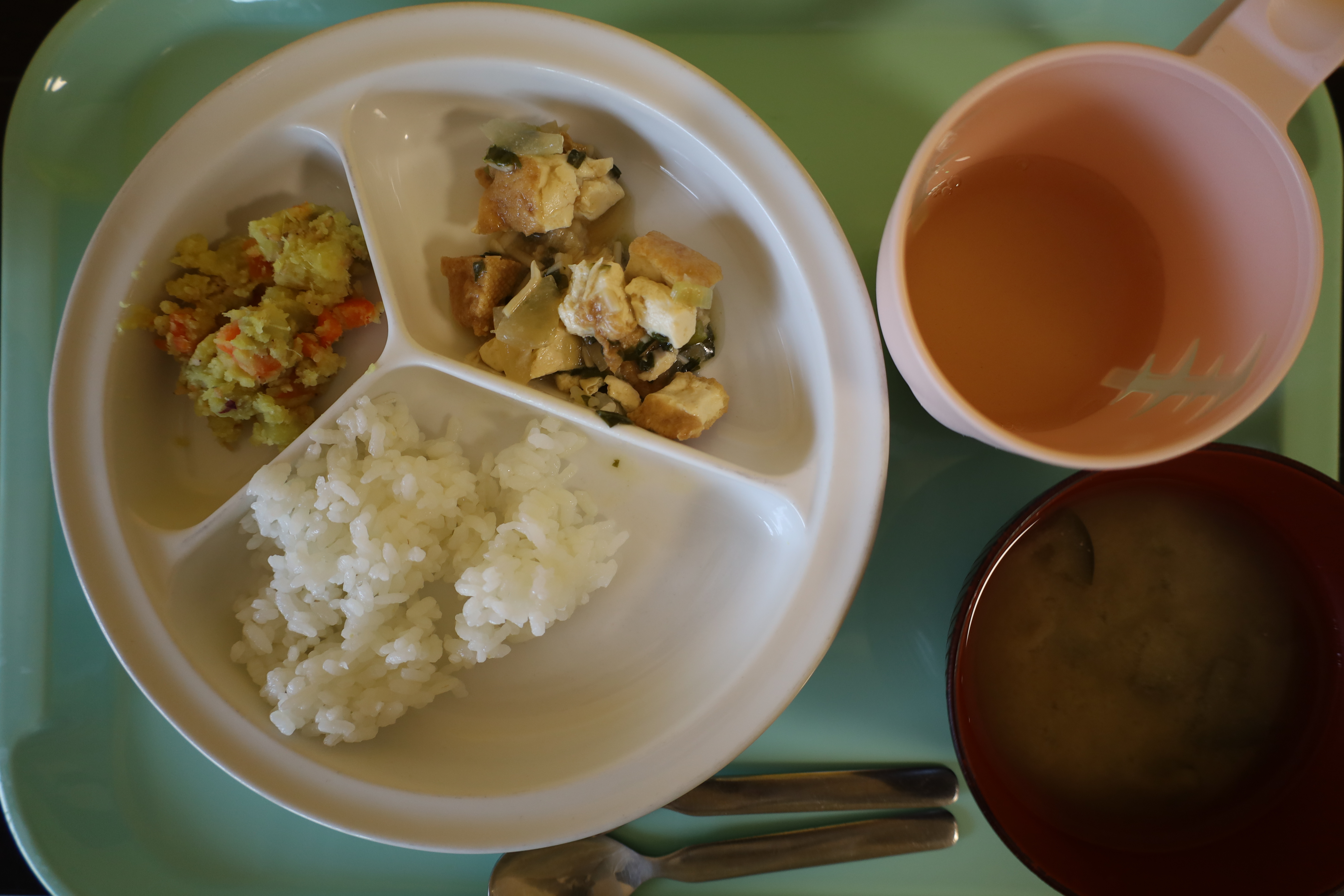 ご飯・厚揚げと鶏肉のきのこ煮・さつま芋と人参のごまサラダ・味噌汁(なす・ごぼう)