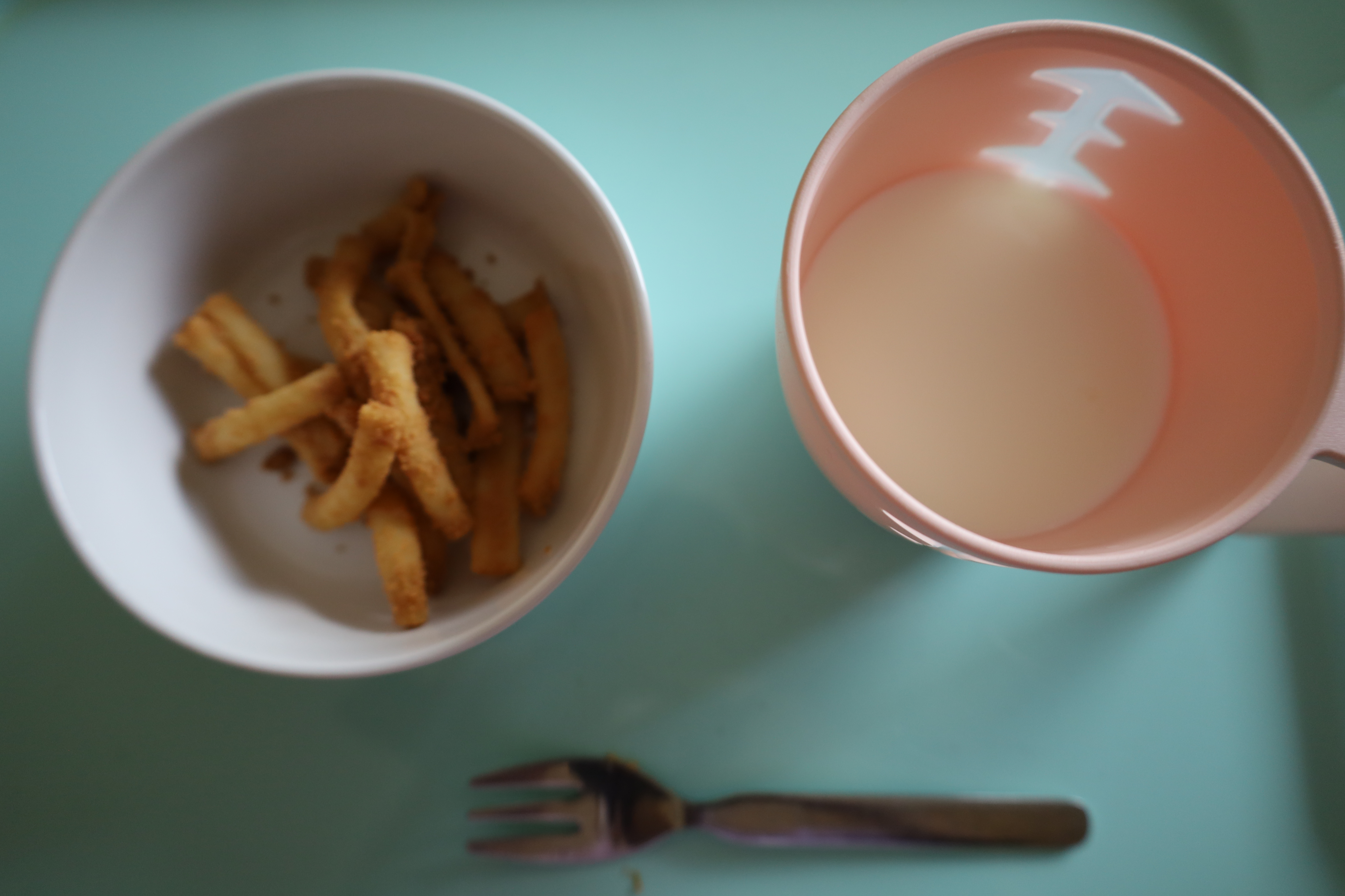 牛乳・マカロニきな粉・フルーツ(オレンジ写真なし)