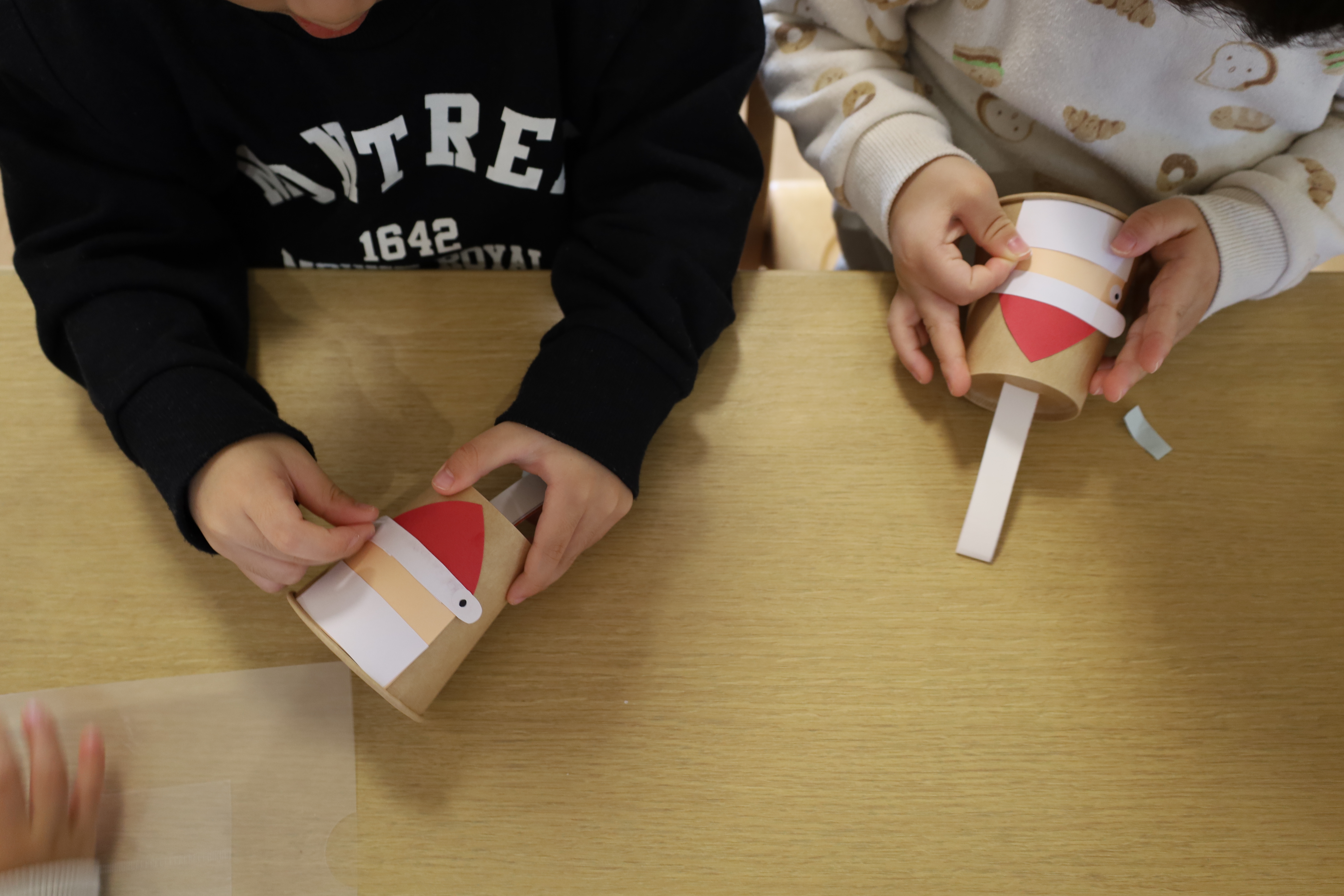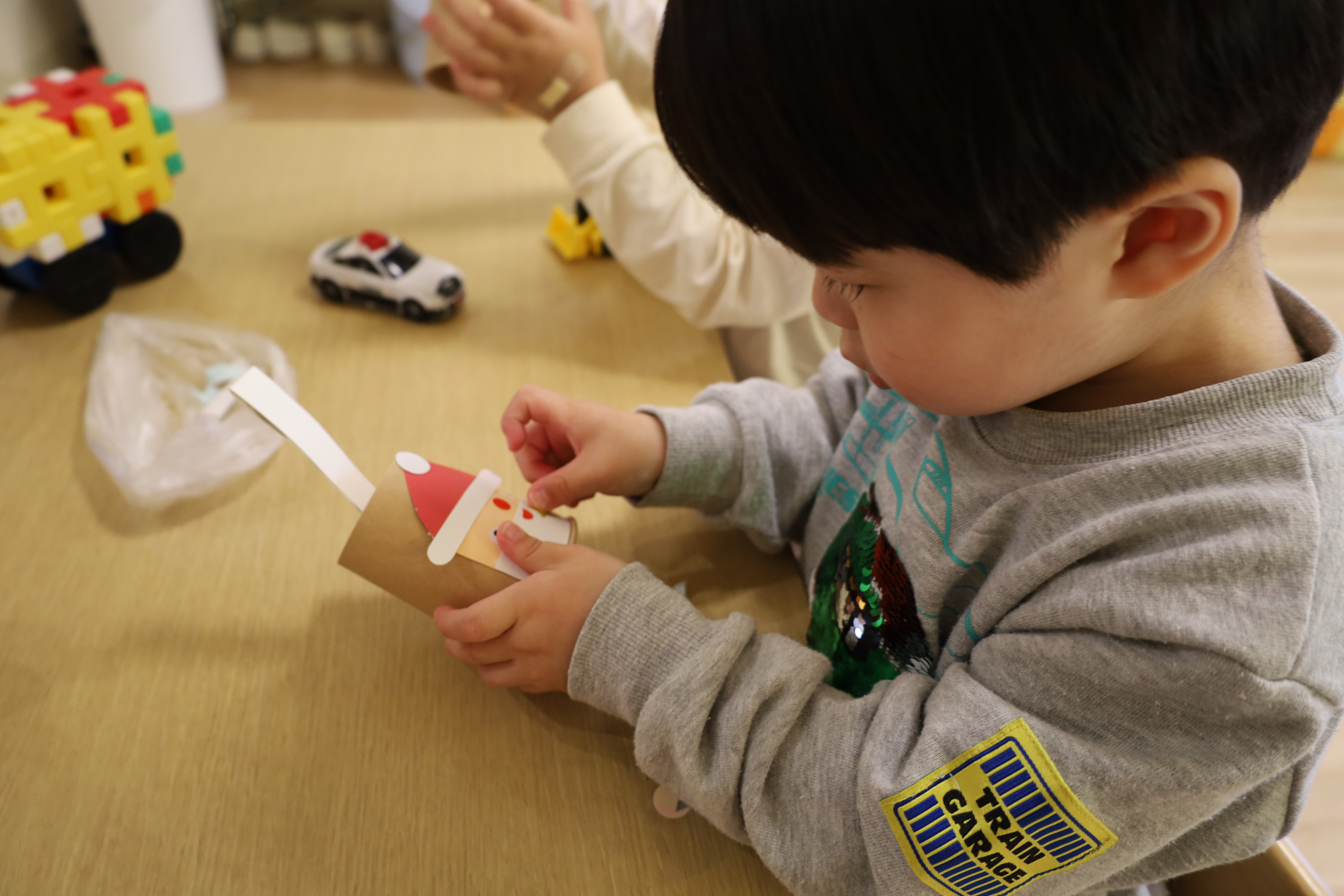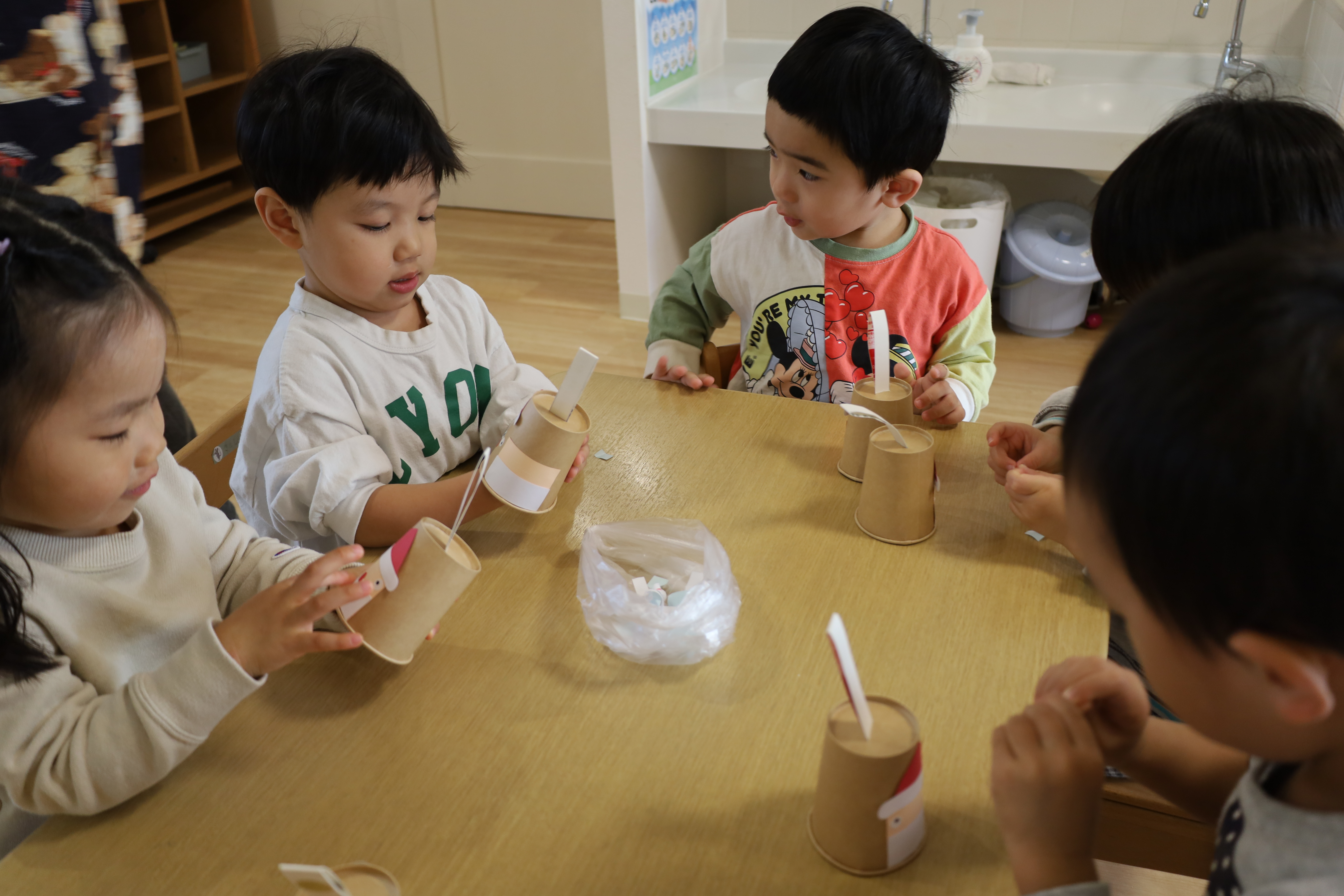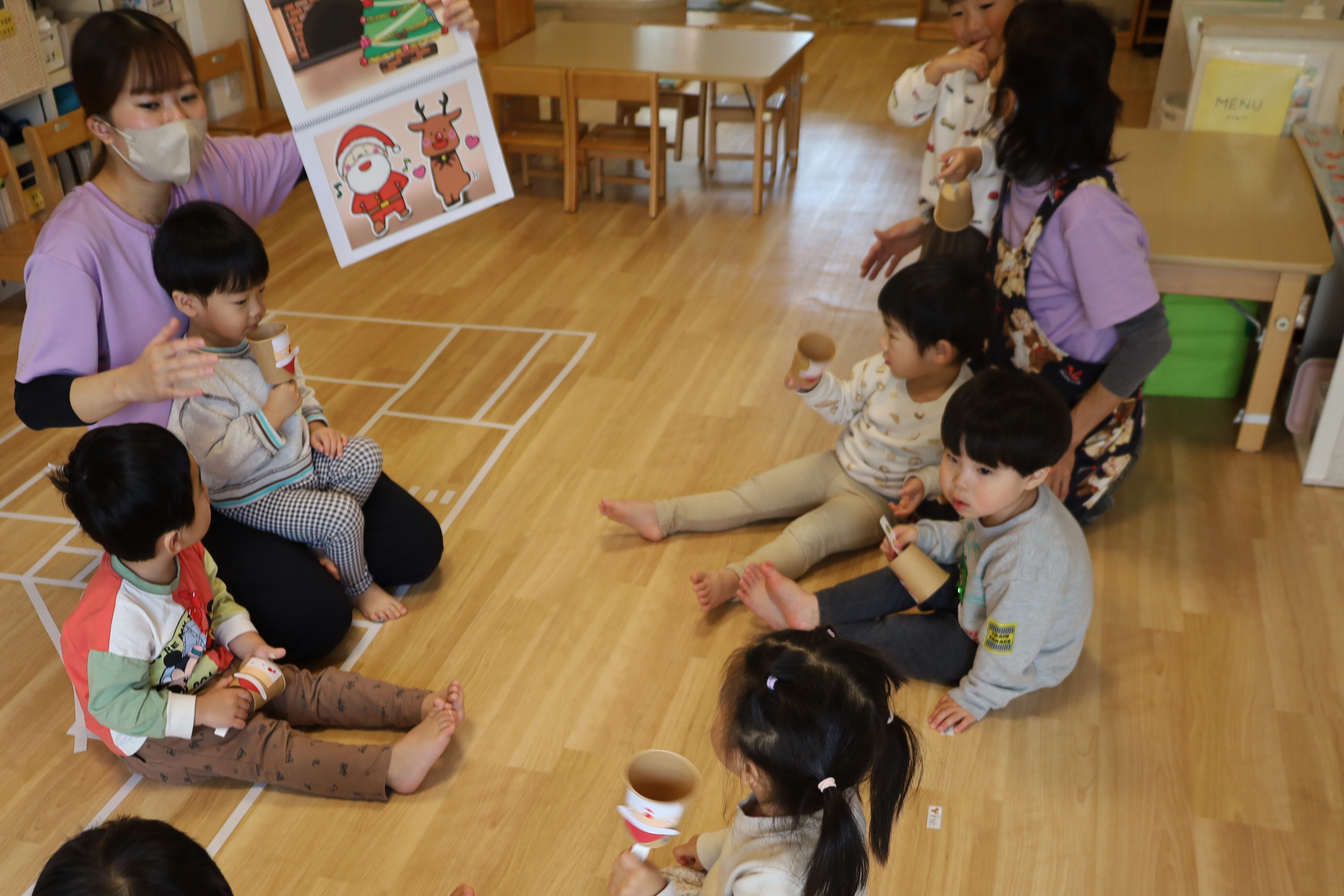 2025.12.18 はなえみhoujikai 2025/12/18 リンリンリン鈴が鳴る ツイート シェア はてブ 送る Pocket みのりぐみ 12月も半ばを過ぎて、もうすぐみんなが待ってるクリスマス。 クリスマスのベルを作ってみます。 紙コップにサンタさんのお顔 小さなシールでお顔を作ります。 細かな小さなシールも 自分で台紙から剥がして、 よく見て、 丁寧に 貼っています。 友だちのようすを見て、 自分もやってみる。 「○〇のかわいいでしょ。」「ボクのここに貼ったよ!」会話も弾みます。 みんなのクリスマスベル 中に鈴が入っていて、振るとリンリンと音がします。 ♪あわてんぼのサンタクロース♬鈴を鳴らして、みんなで歌おうね! 12月17日 今日の給食 離乳食・後期 かゆ・鶏肉とチンゲン菜のとろとろ煮・玉ねぎのしらす煮・味噌汁・フルーツ(りんこ) 幼児食 ご飯・しらすのかき揚げ・野菜とひき肉のとろとろ煮・味噌汁(さつま芋・ごぼう)フルーツ(リンゴ) 幼児食・午後おやつ 牛乳・チーズスコーン