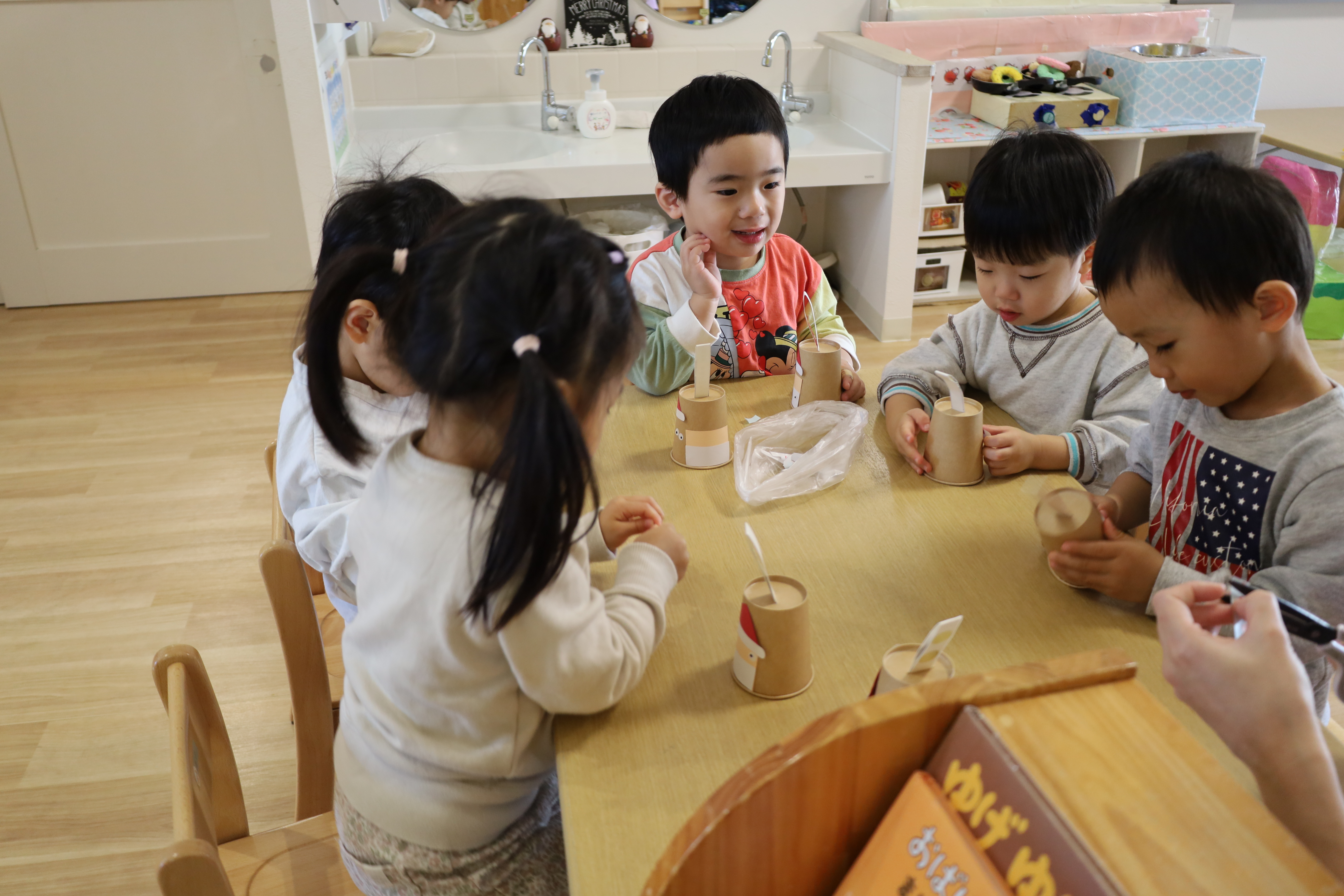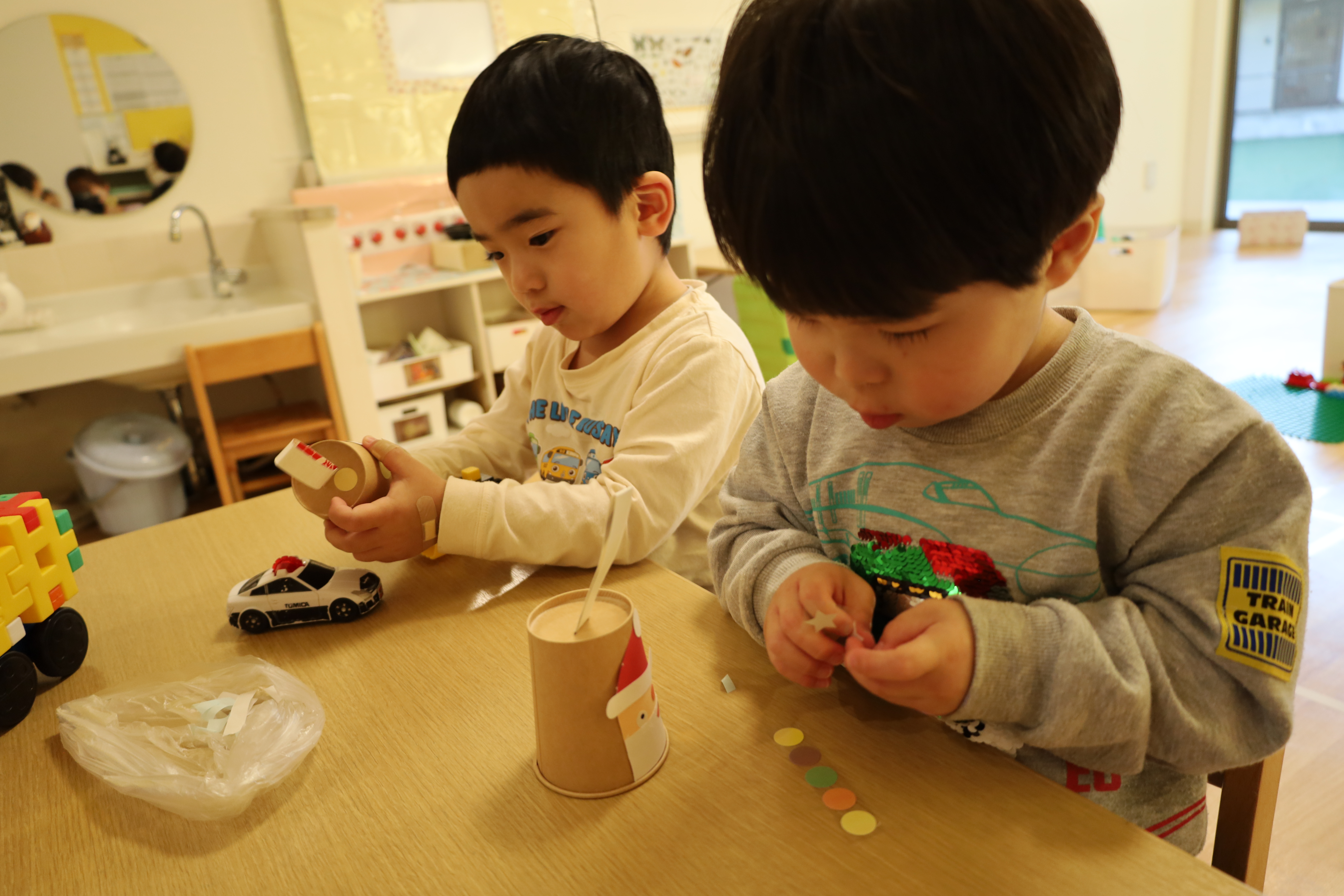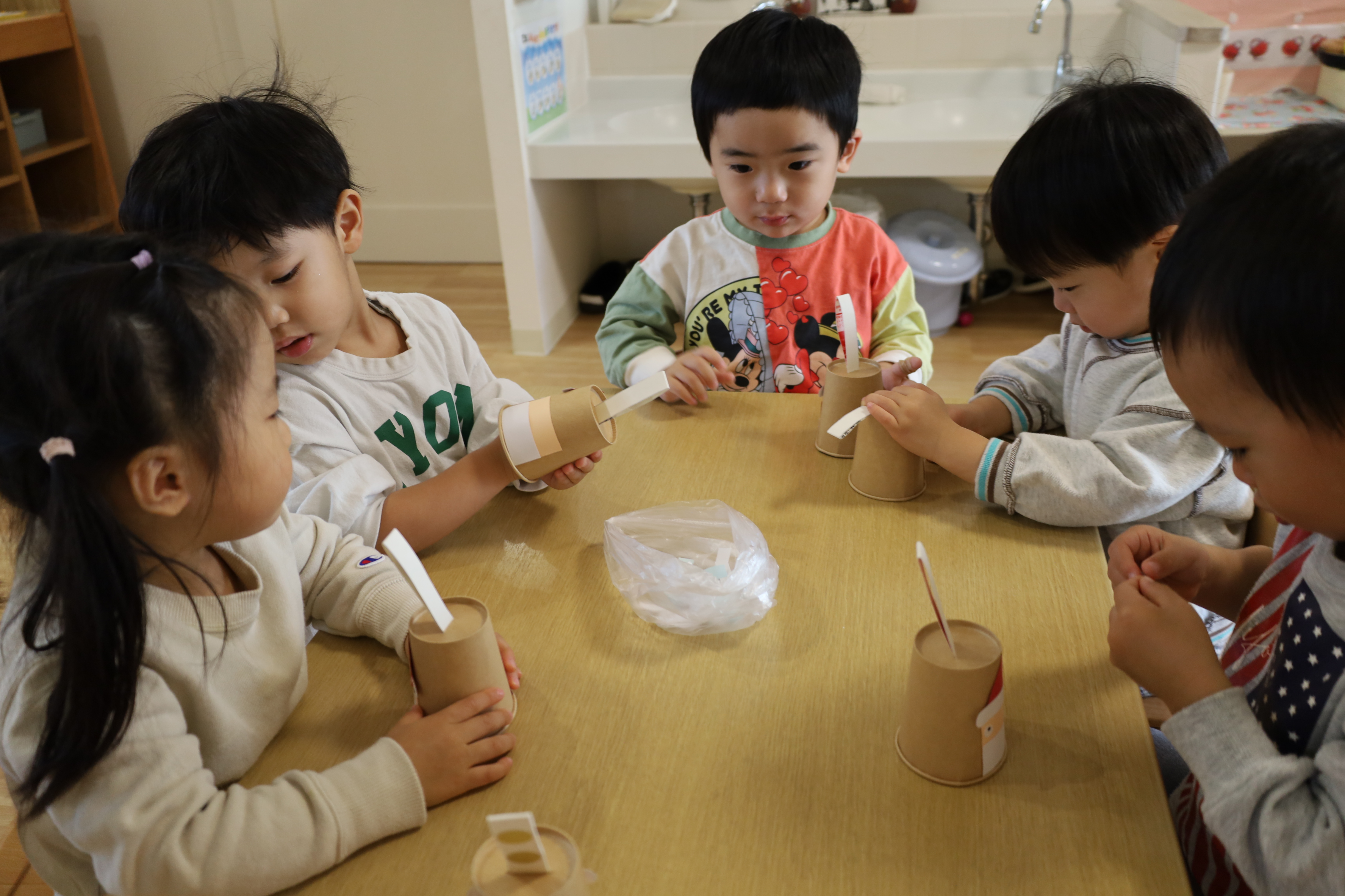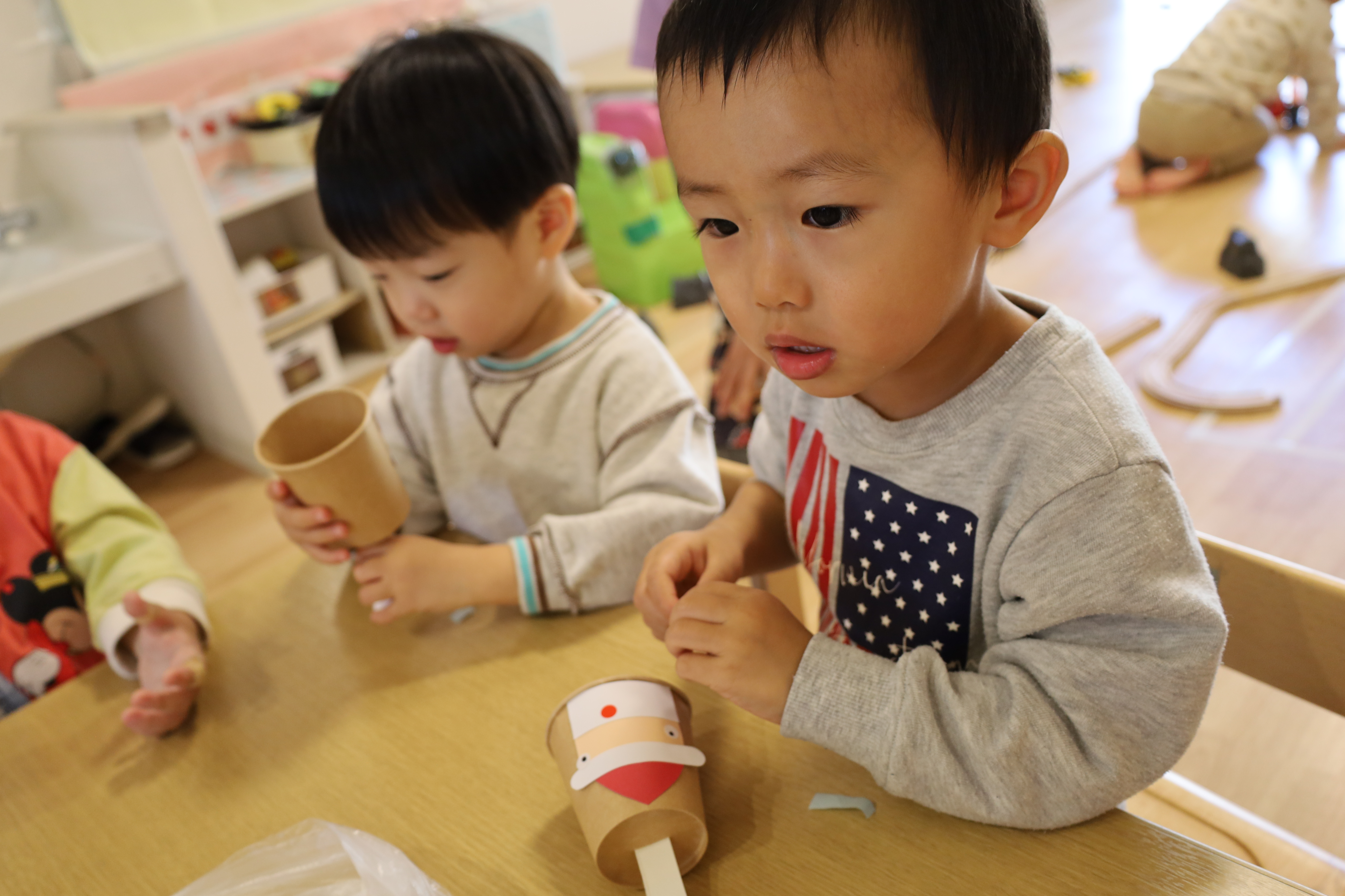 2025.12.18 はなえみhoujikai 2025/12/18 リンリンリン鈴が鳴る ツイート シェア はてブ 送る Pocket みのりぐみ 12月も半ばを過ぎて、もうすぐみんなが待ってるクリスマス。 クリスマスのベルを作ってみます。 紙コップにサンタさんのお顔 小さなシールでお顔を作ります。 細かな小さなシールも 自分で台紙から剥がして、 よく見て、 丁寧に 貼っています。 友だちのようすを見て、 自分もやってみる。 「○〇のかわいいでしょ。」「ボクのここに貼ったよ!」会話も弾みます。 みんなのクリスマスベル 中に鈴が入っていて、振るとリンリンと音がします。 ♪あわてんぼのサンタクロース♬鈴を鳴らして、みんなで歌おうね! 12月17日 今日の給食 離乳食・後期 かゆ・鶏肉とチンゲン菜のとろとろ煮・玉ねぎのしらす煮・味噌汁・フルーツ(りんこ) 幼児食 ご飯・しらすのかき揚げ・野菜とひき肉のとろとろ煮・味噌汁(さつま芋・ごぼう)フルーツ(リンゴ) 幼児食・午後おやつ 牛乳・チーズスコーン