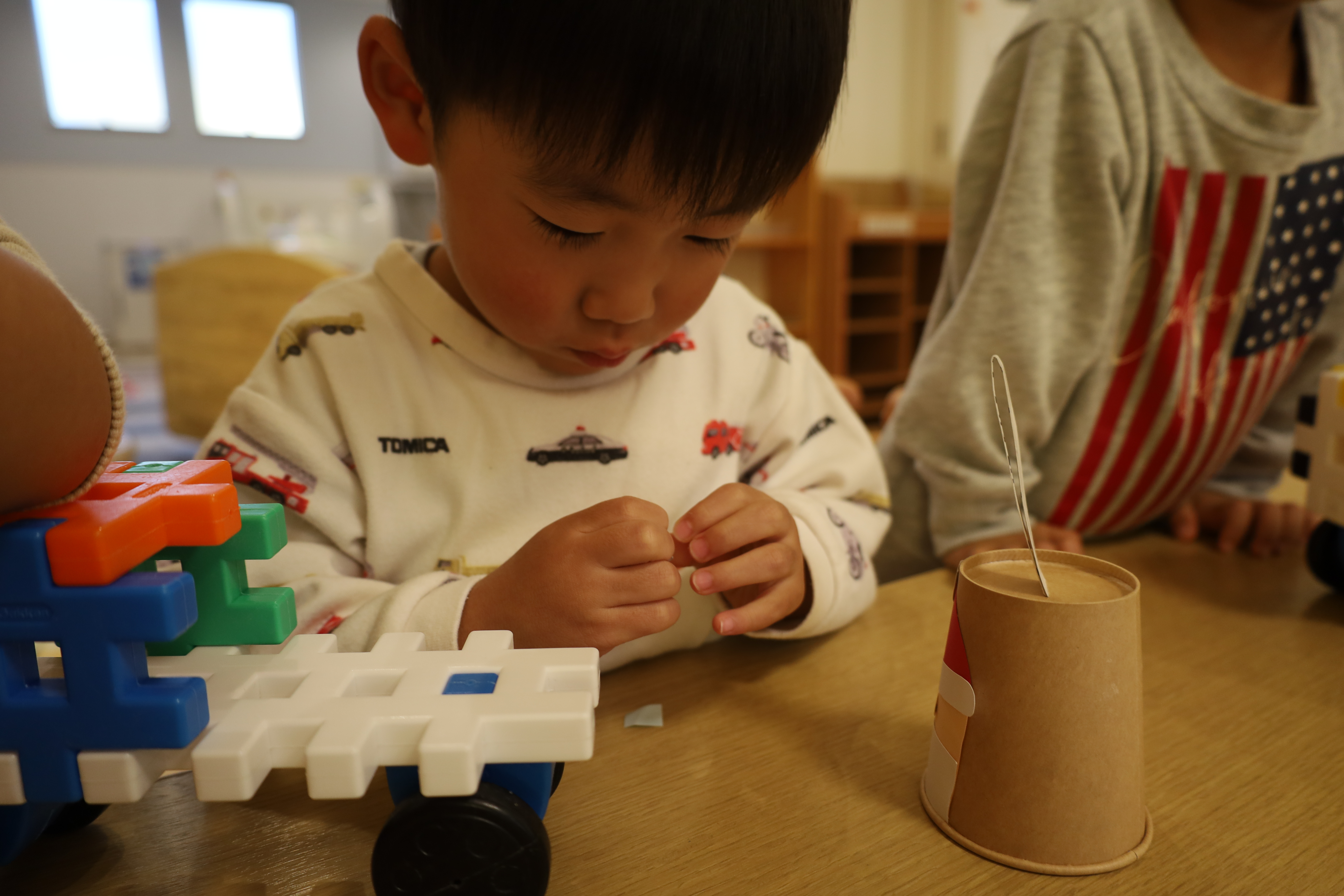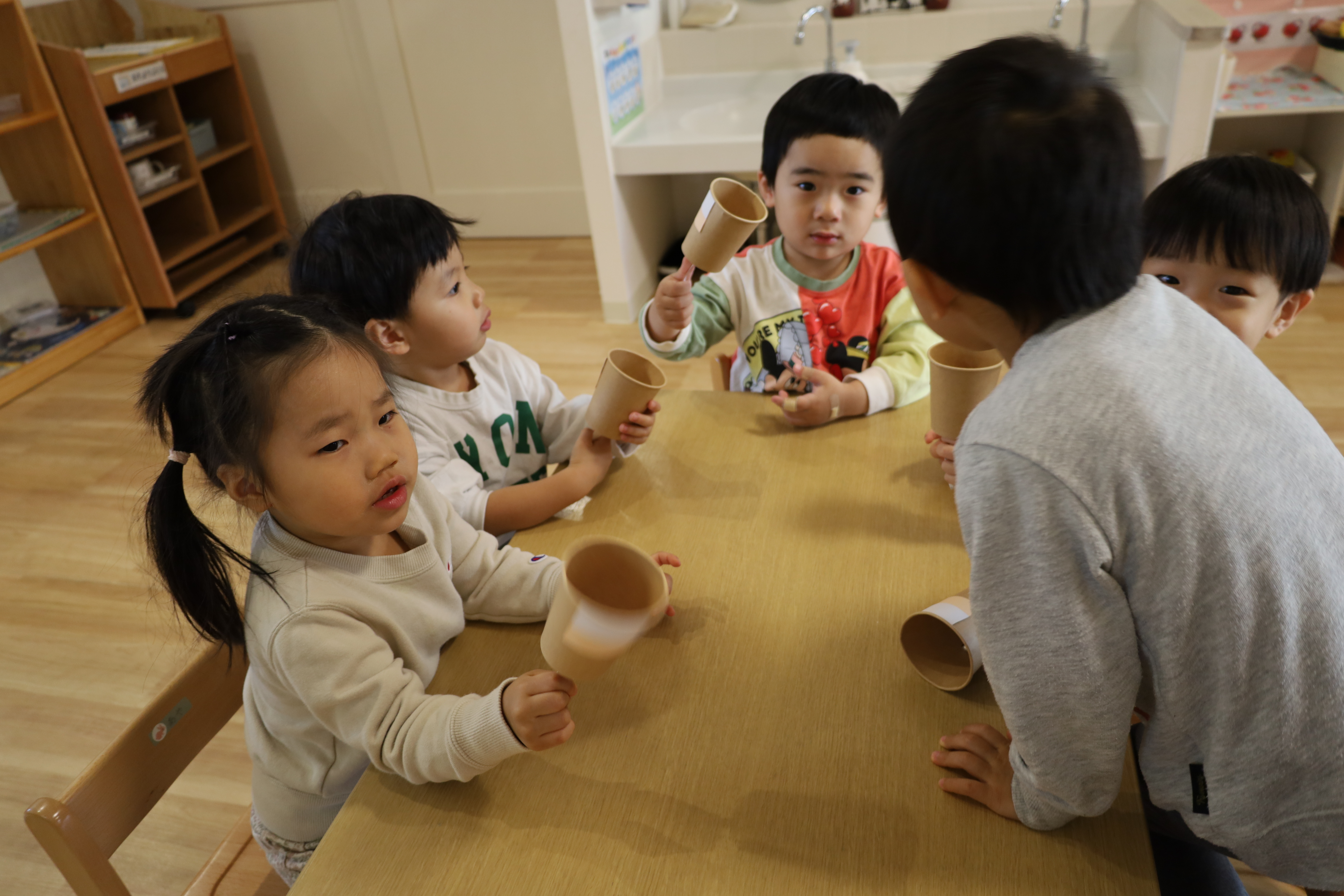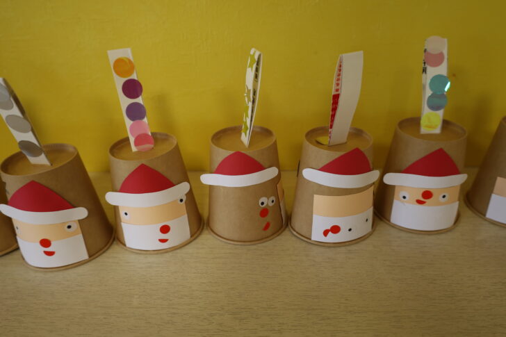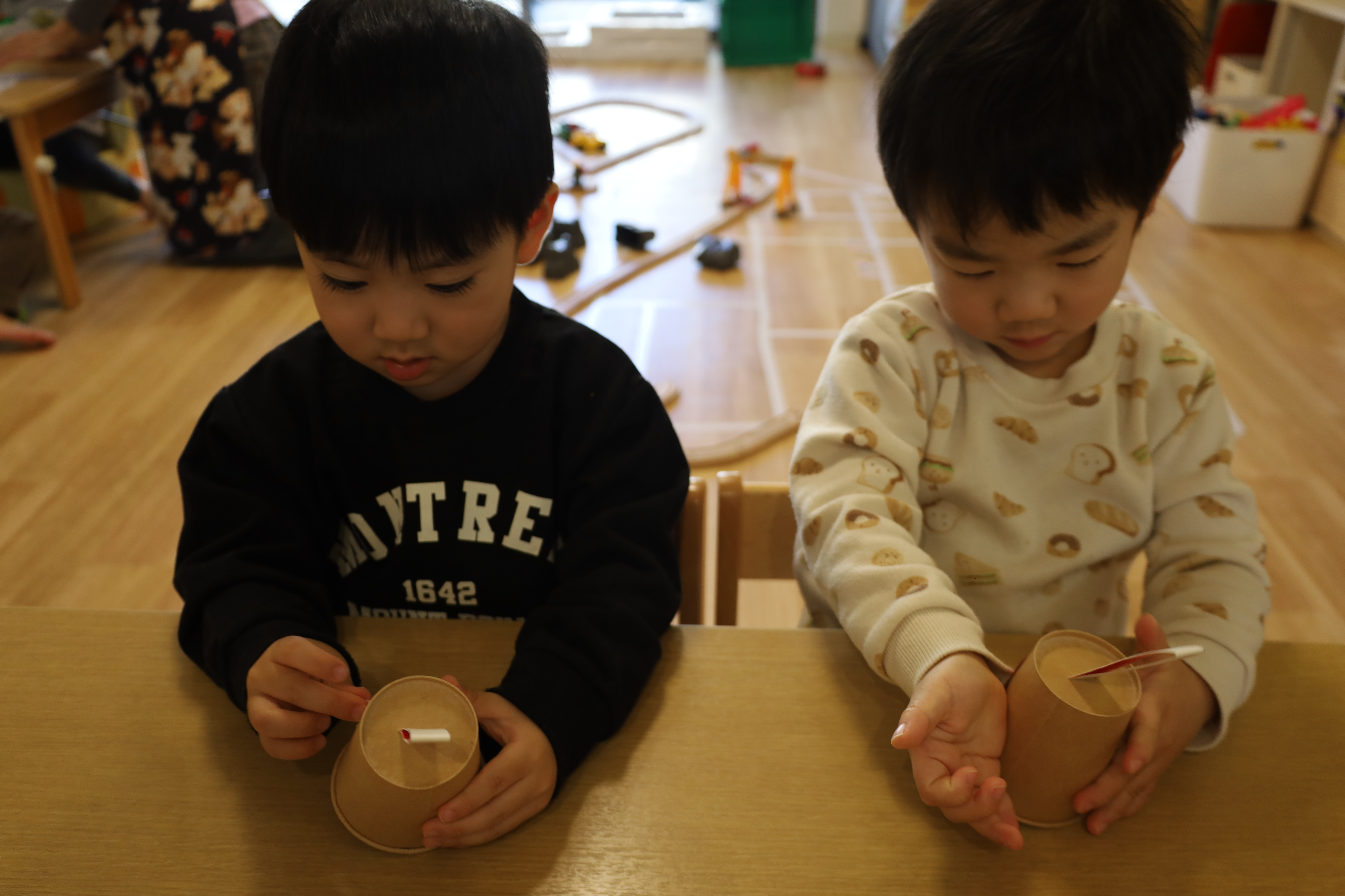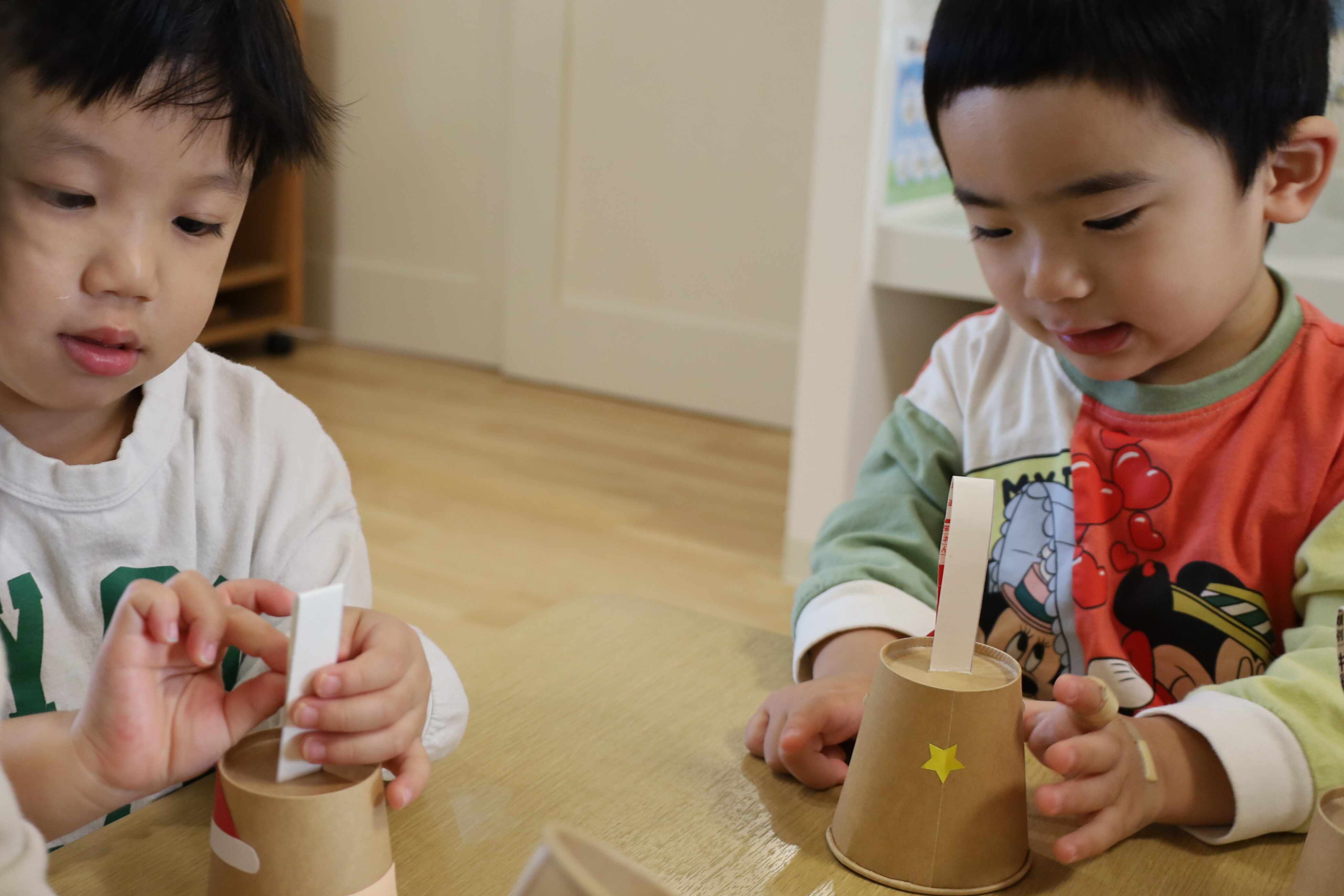2025.12.18 はなえみhoujikai 2025/12/18 リンリンリン鈴が鳴る ツイート シェア はてブ 送る Pocket みのりぐみ 12月も半ばを過ぎて、もうすぐみんなが待ってるクリスマス。 クリスマスのベルを作ってみます。 紙コップにサンタさんのお顔 小さなシールでお顔を作ります。 細かな小さなシールも 自分で台紙から剥がして、 よく見て、 丁寧に 貼っています。 友だちのようすを見て、 自分もやってみる。 「○〇のかわいいでしょ。」「ボクのここに貼ったよ!」会話も弾みます。 みんなのクリスマスベル 中に鈴が入っていて、振るとリンリンと音がします。 ♪あわてんぼのサンタクロース♬鈴を鳴らして、みんなで歌おうね! 12月17日 今日の給食 離乳食・後期 かゆ・鶏肉とチンゲン菜のとろとろ煮・玉ねぎのしらす煮・味噌汁・フルーツ(りんこ) 幼児食 ご飯・しらすのかき揚げ・野菜とひき肉のとろとろ煮・味噌汁(さつま芋・ごぼう)フルーツ(リンゴ) 幼児食・午後おやつ 牛乳・チーズスコーン