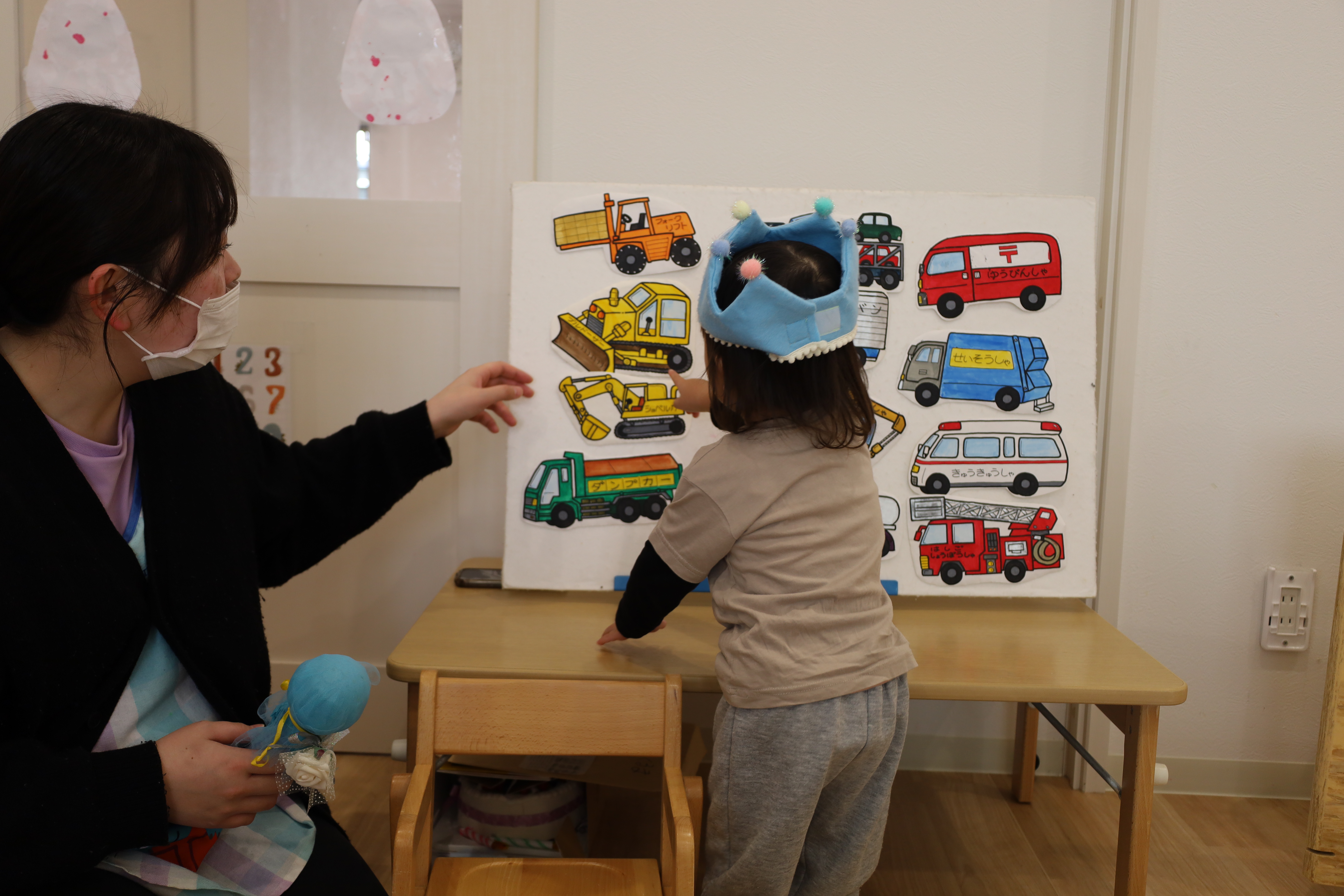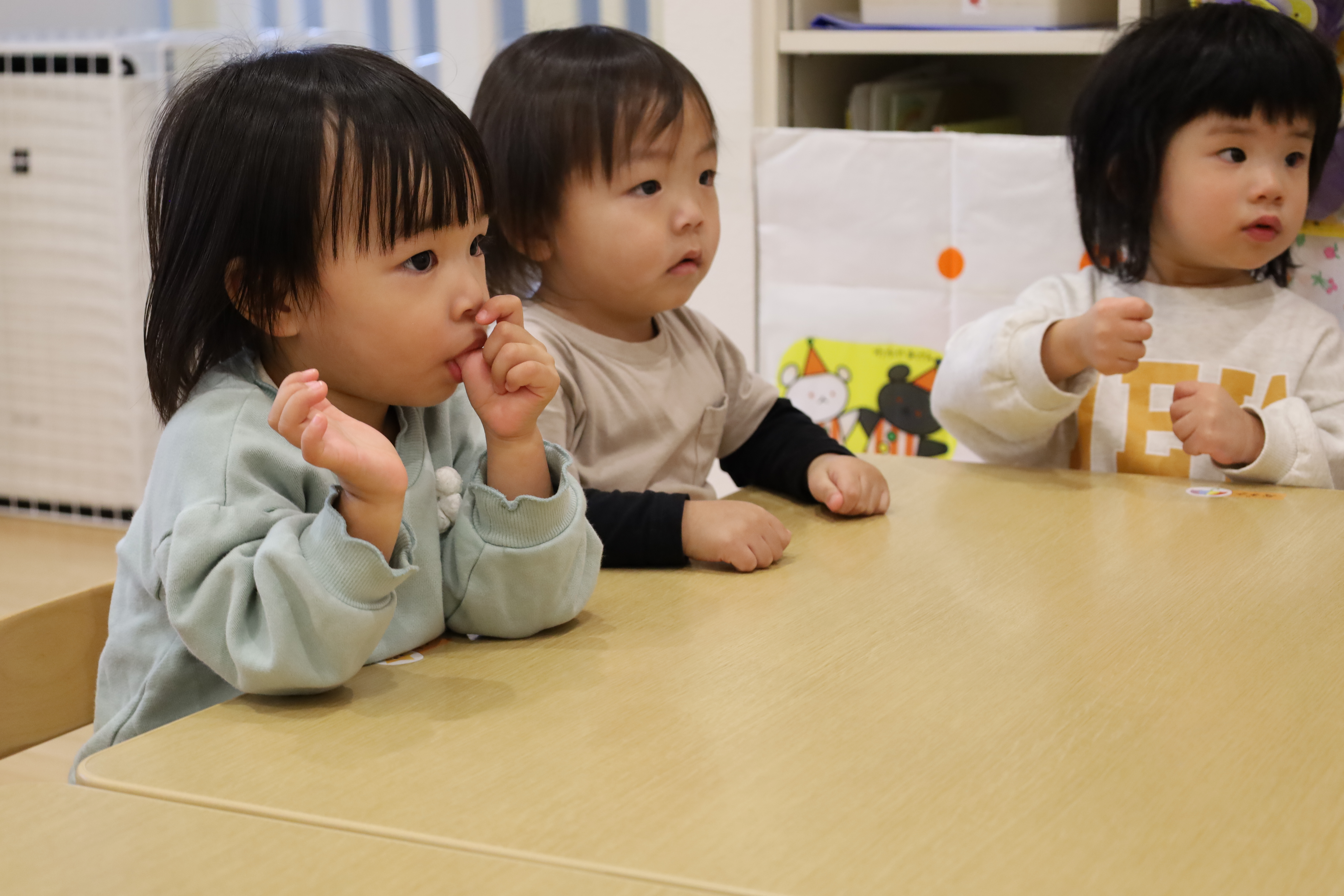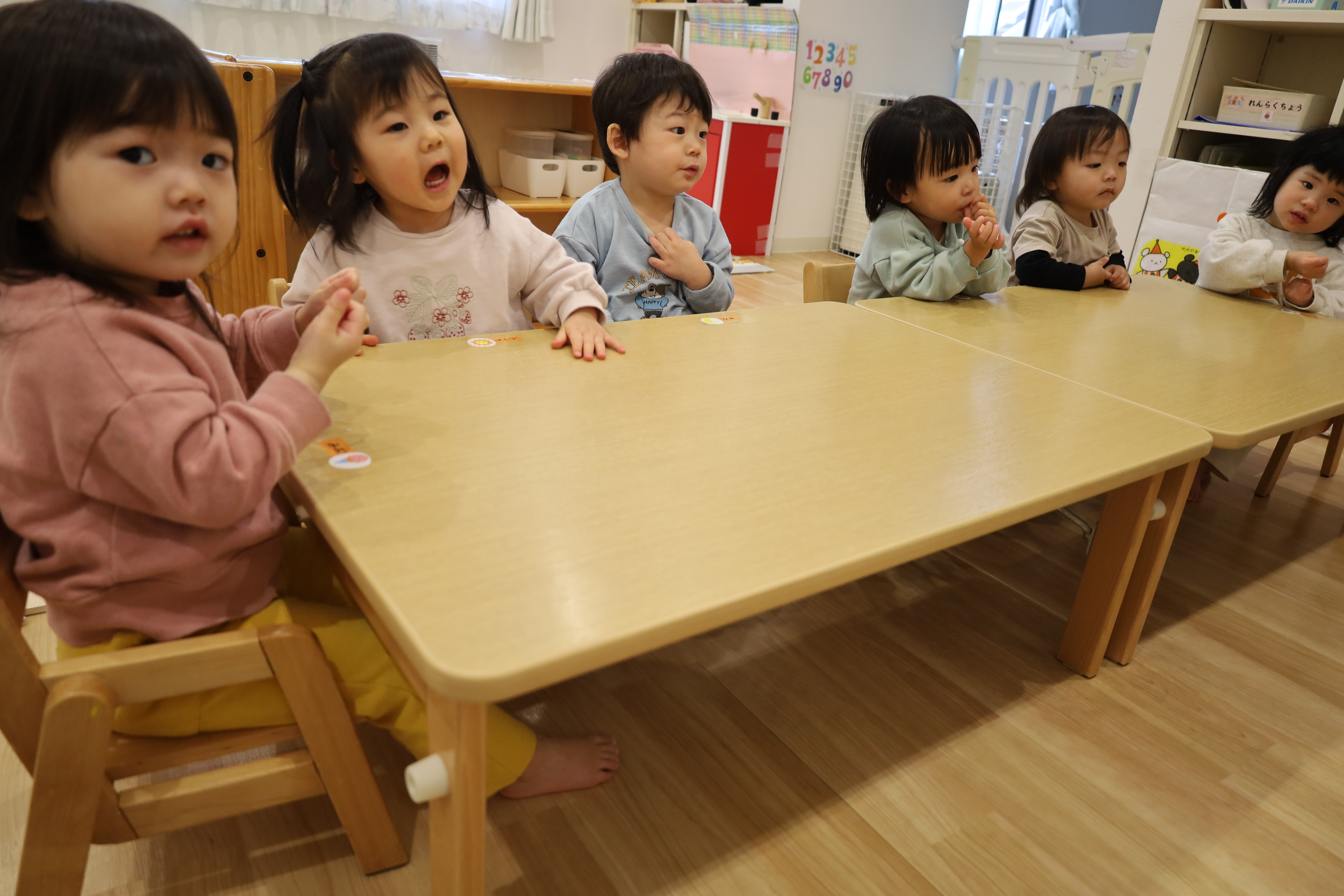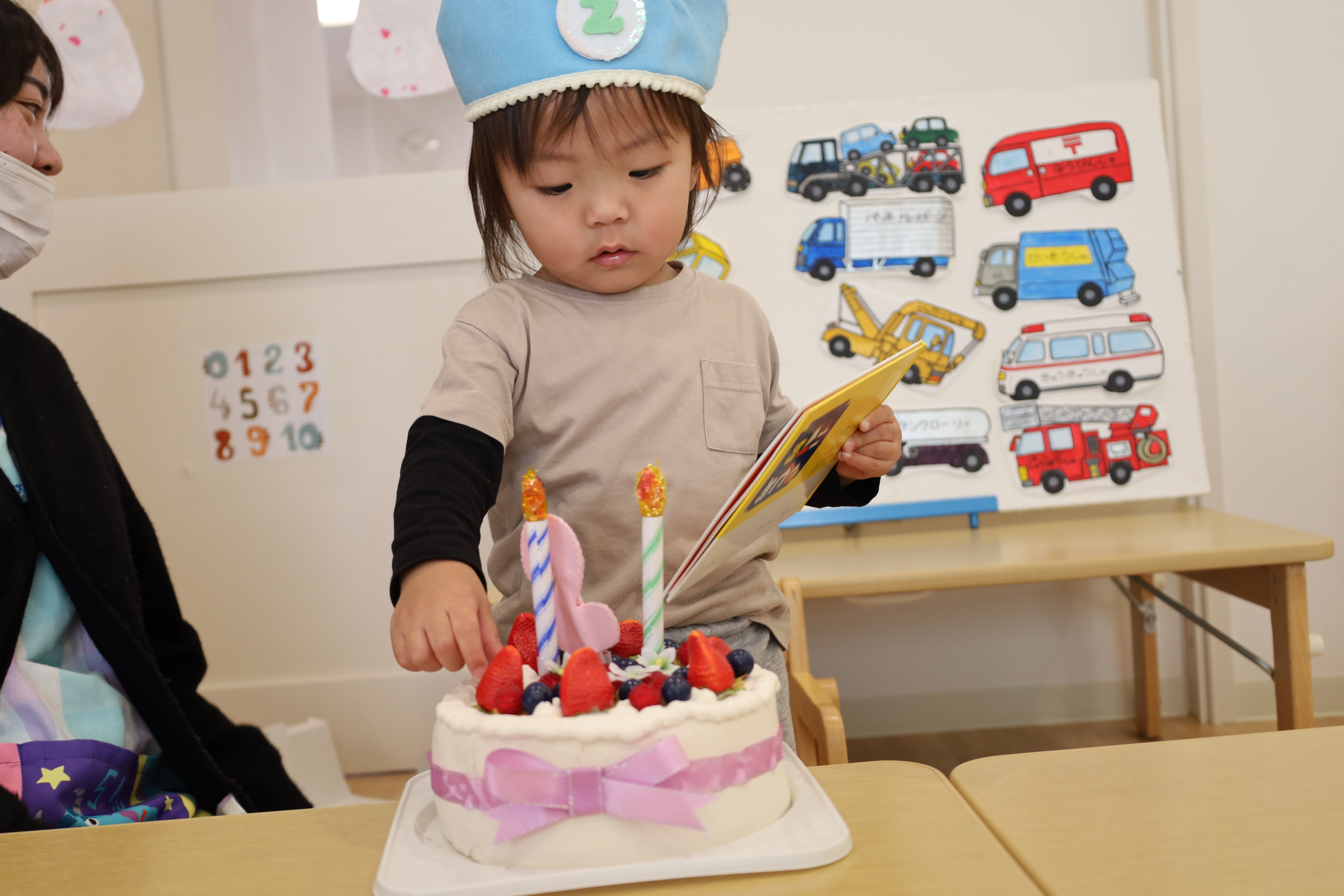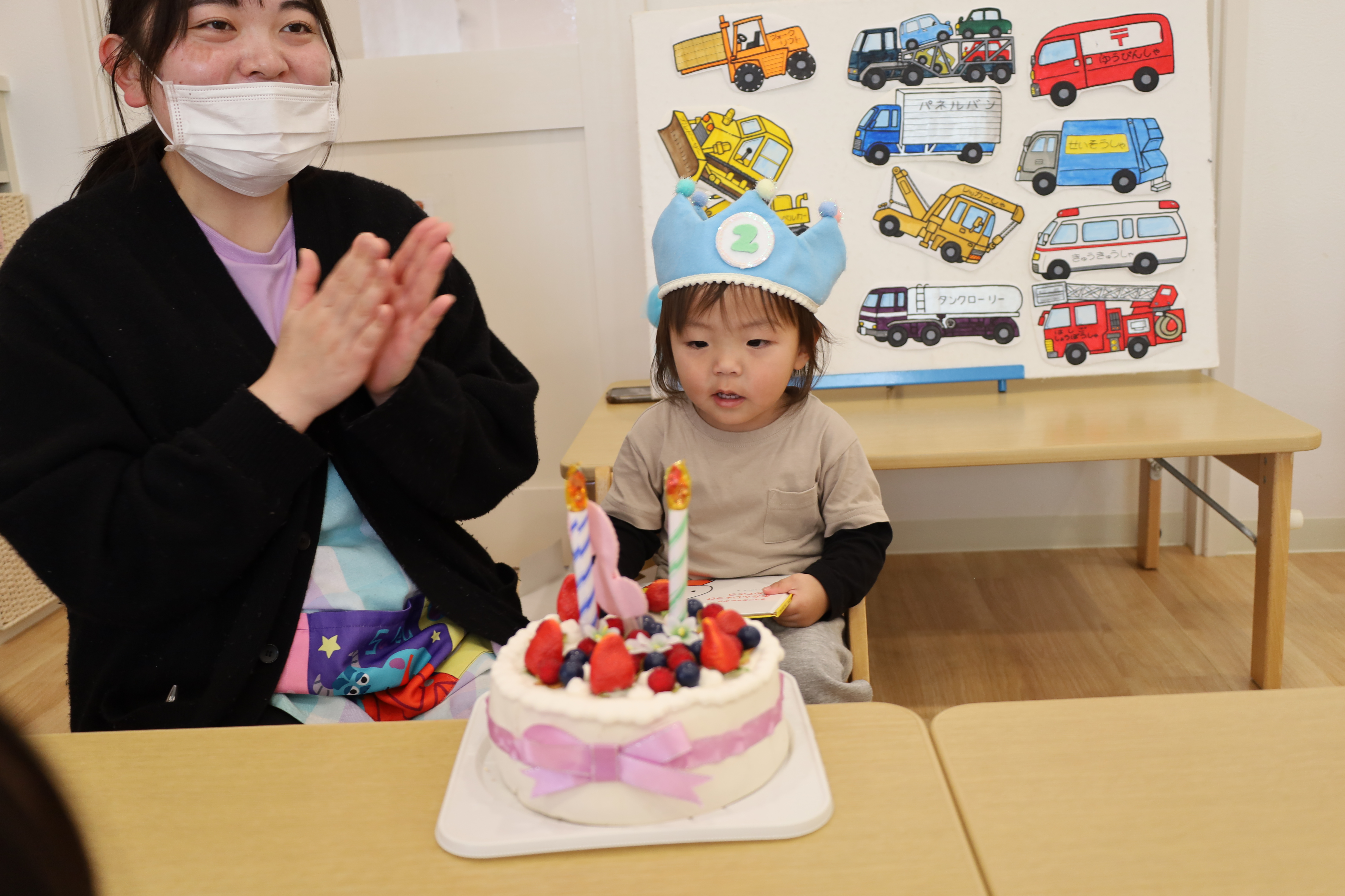 2026.01.09 はなえみhoujikai 2026/1/9 おたんじょうびおめでとう! ツイート シェア はてブ 送る Pocket パネルシアターが始まったよ。 ♪のりものあつまれ~いろんなクルマ~♪ 大好きな働くクルマ! 何がでてくるかな・・・・? ボクの大好きなクルマ!! はしる走るはたらくクルマ~♪ ボクはコレが好き!! 明日2さいのおたんじょうびのお友だち。 ボクの好きなのはブルドーザー! バースデーブックの写真、かっこいいでしょ! ケーキにロウソクを2本立てて、 みんなでお祝い。 ♪ハッピーバースデデートゥユー♬ おめでとう!!いっぱい遊ぼうね! 1月9日 今日の給食 離乳食・後期 かゆ・鶏肉と冬野菜のくたくた煮・きゅうりのサラダ・味噌汁 幼児食 ご飯・鶏肉と冬野菜の生姜炒め・春雨サラダ・味噌汁(焼麩・ワカメ) 幼児食・午後おやつ 牛乳・ごまチーズ蒸しパン