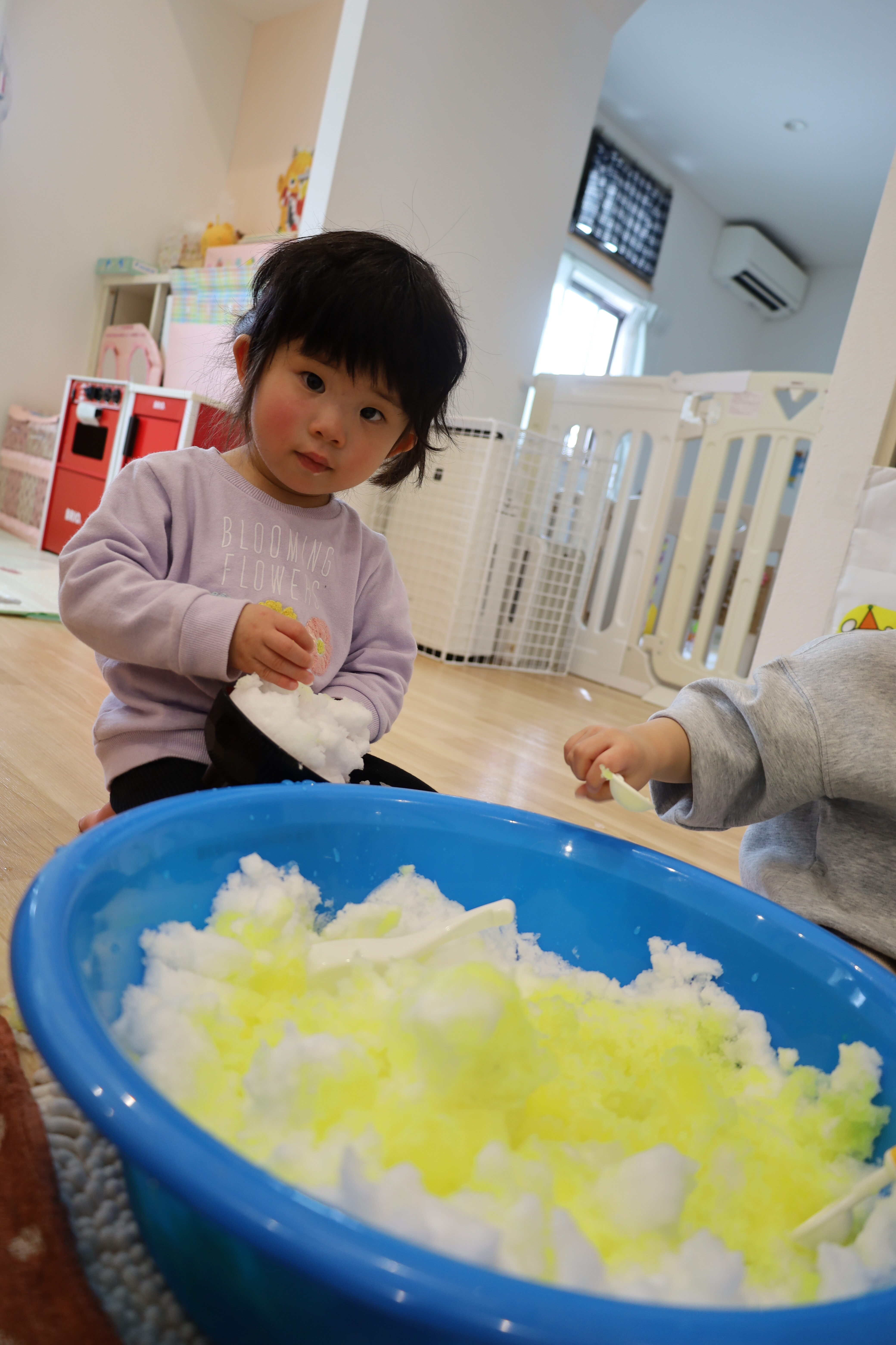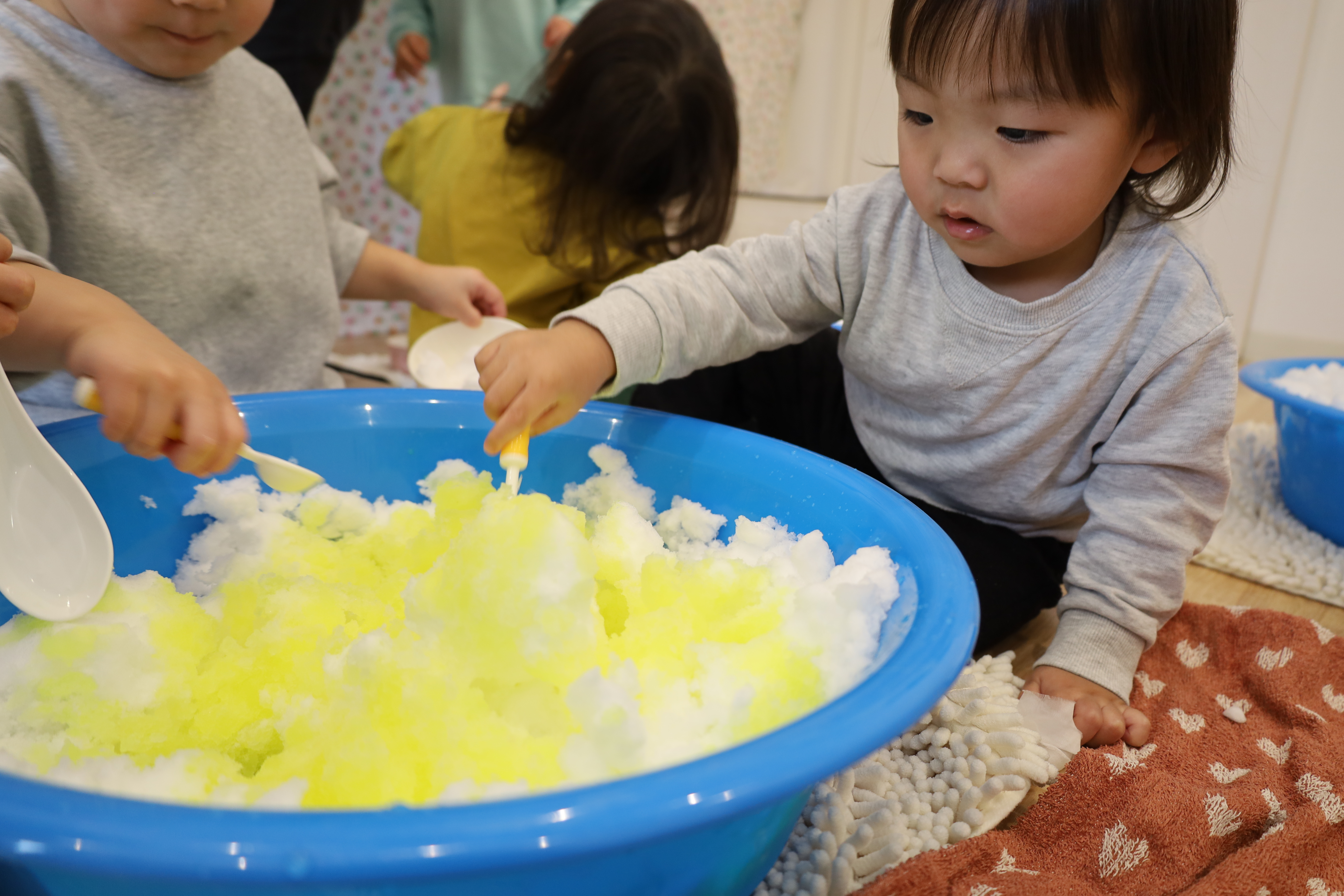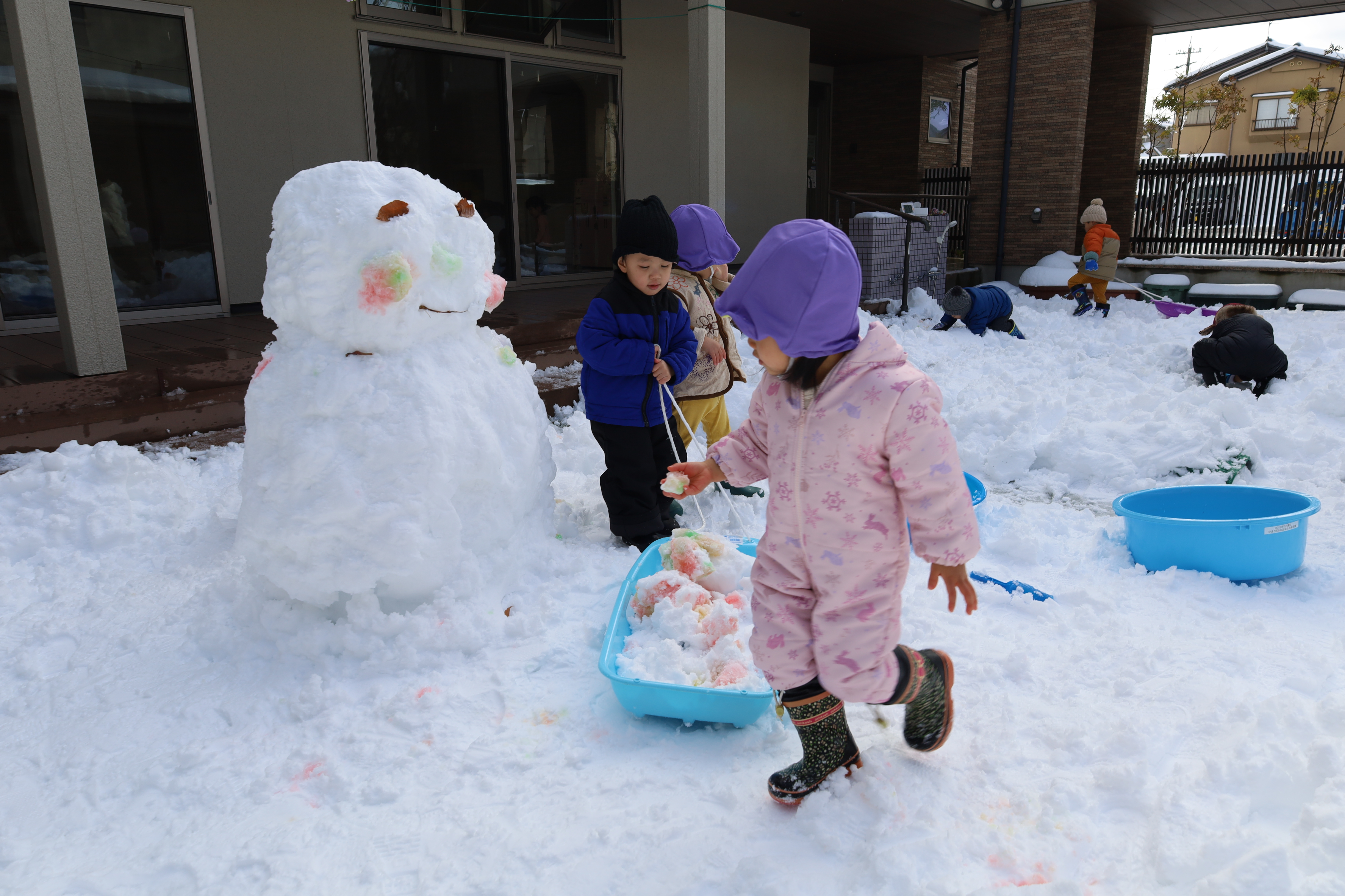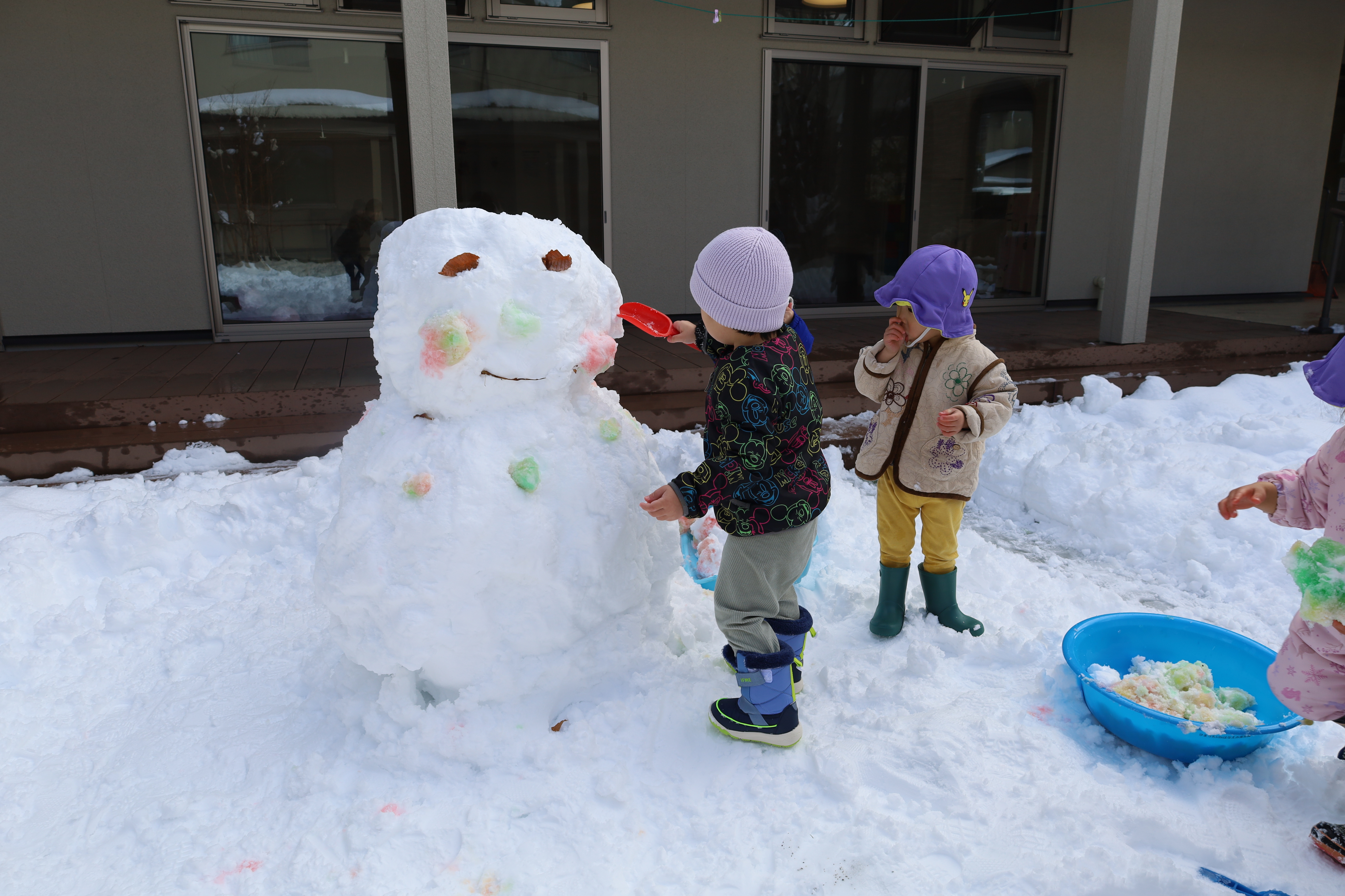 2026.01.23 はなえみhoujikai 2026/1/23 いろいろ雪 ツイート シェア はてブ 送る Pocket はなたね お部屋にタライいっぱいの雪を持ち込んで・・・ 山盛りの雪! ご飯みたい⁉ もっともっと、たくさんすくって・・。 すくって・・・。 ギュっと握って。 そこへ食紅で作った色水をかけると・・・・・ バナナ色? きれ~い!!かき氷みたいだね。 かき混ぜて・・・・。 早速すくって、 う~ん、おいし! どう?おいしそうでしょ! 雪が溶けるまで雪のままごとを楽しみました。 園庭であそんでいたみのりさんに色水をおすそ分け。 みのりぐみさんでつくった大きなゆきだるまにお化粧!! 削って、形を整えて・・・・ 可愛くなったね。 きれいな雪玉もたくさんできました。 バケツの帽子をかぶせて・・・・。 帽子、落っことしたらダメだよ! 1月23日 今日の給食 離乳食・後期 かゆ・鶏肉と野菜のやわらか煮・きゅうりのサラダ・フルーツ(バナナ) 幼児食 ツナのあおさおにぎり・鶏肉と野菜の生姜炒め・春雨サラダ・フルーツ(バナナ) 幼児食・午後おやつ チーズごま蒸しパン・牛乳