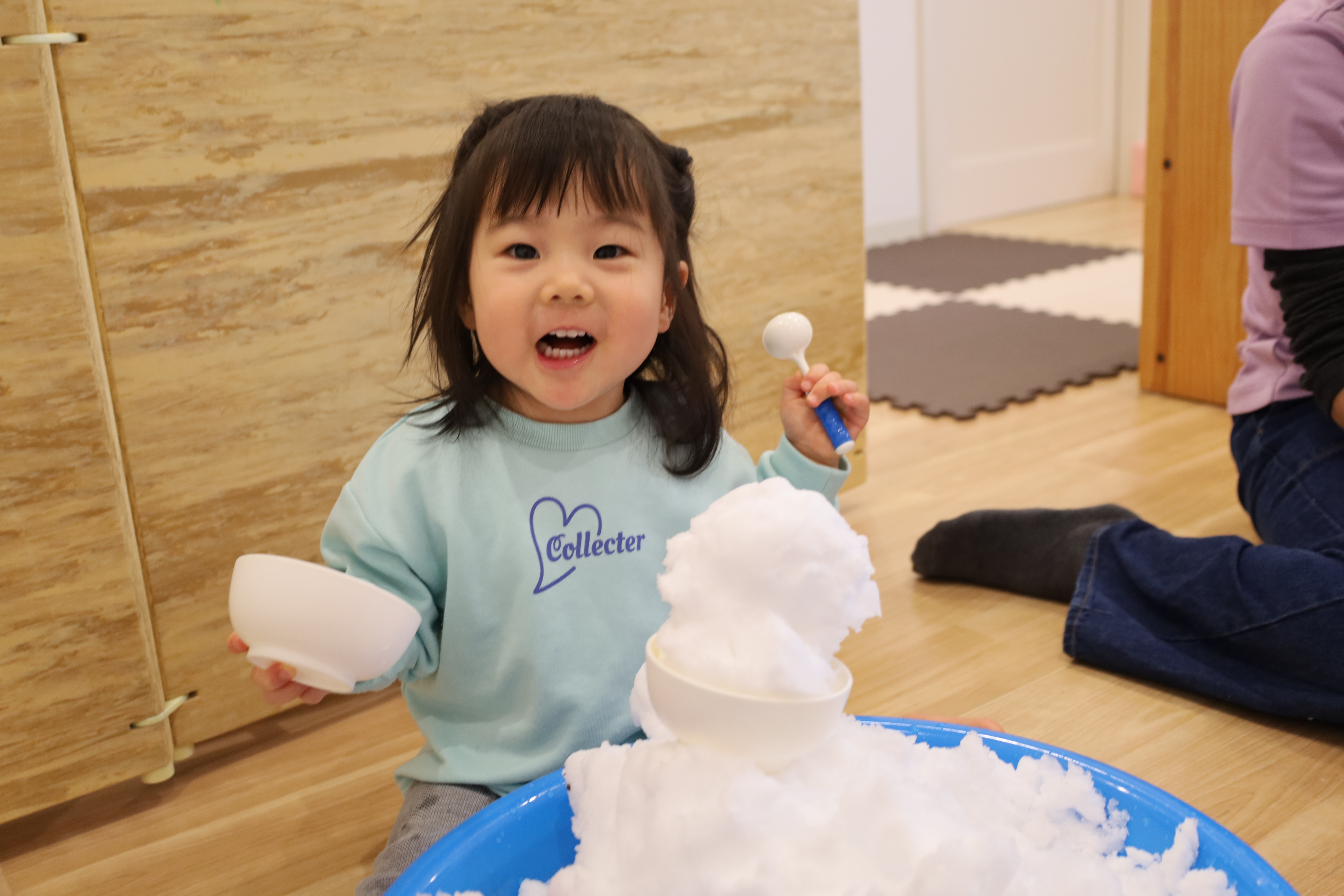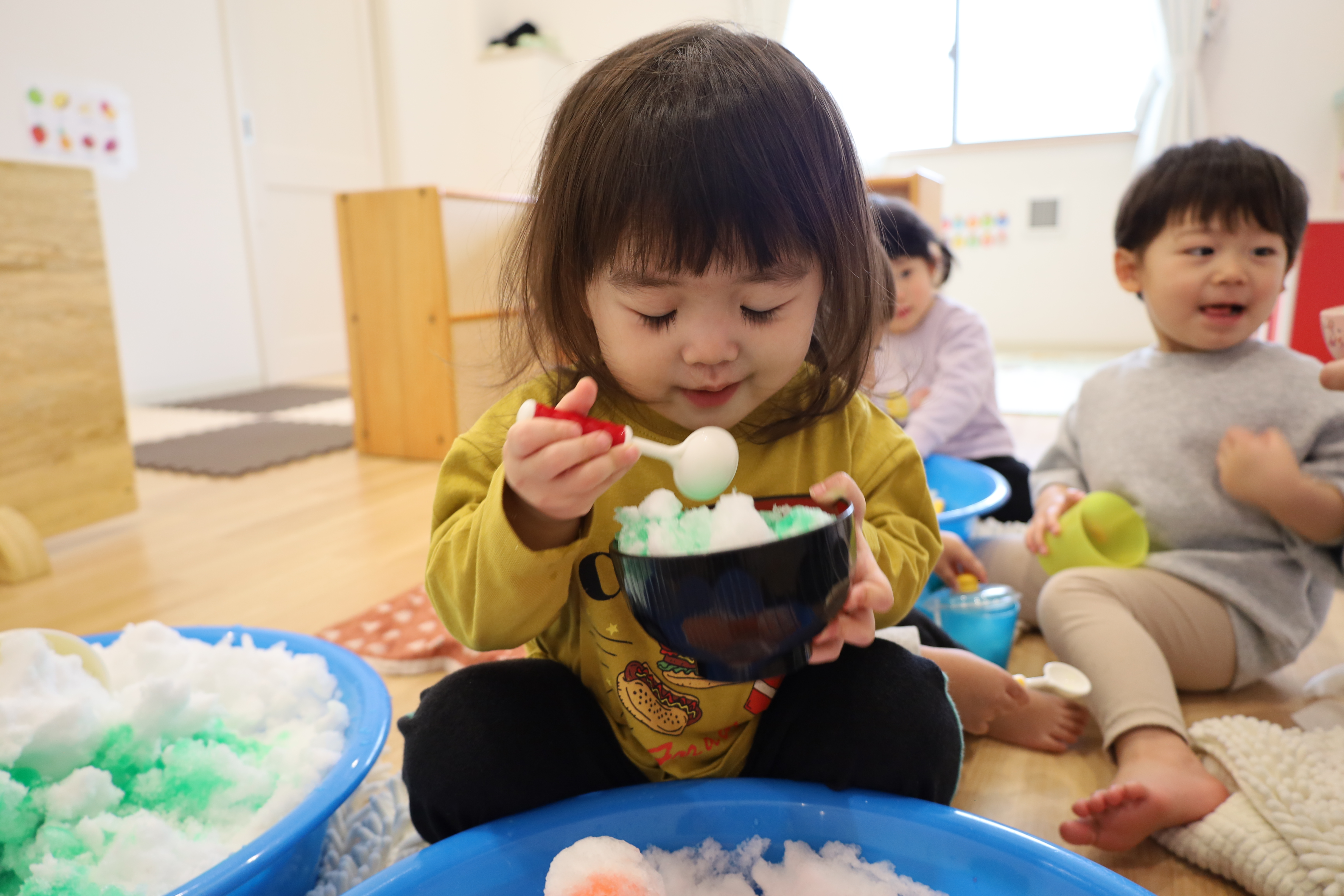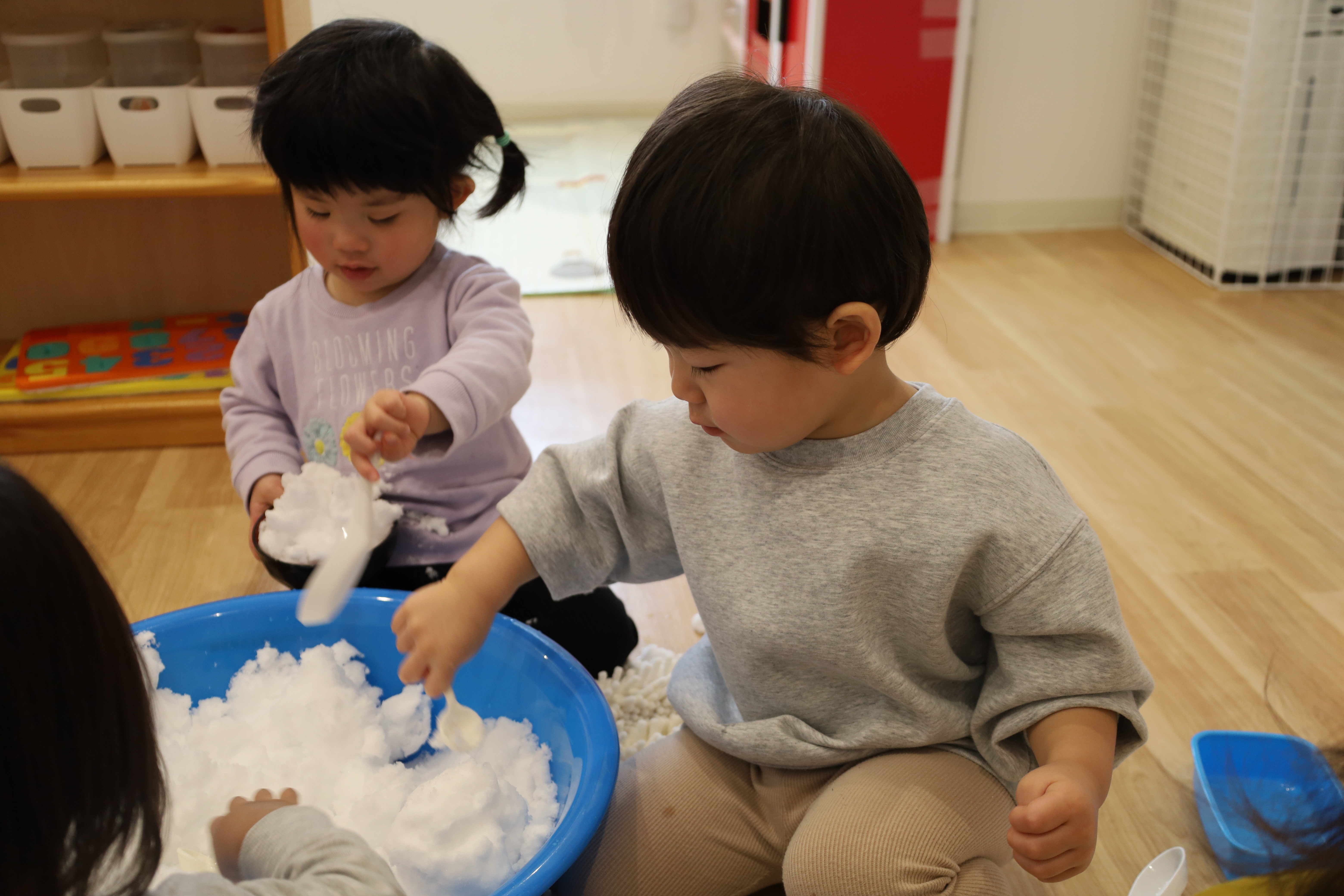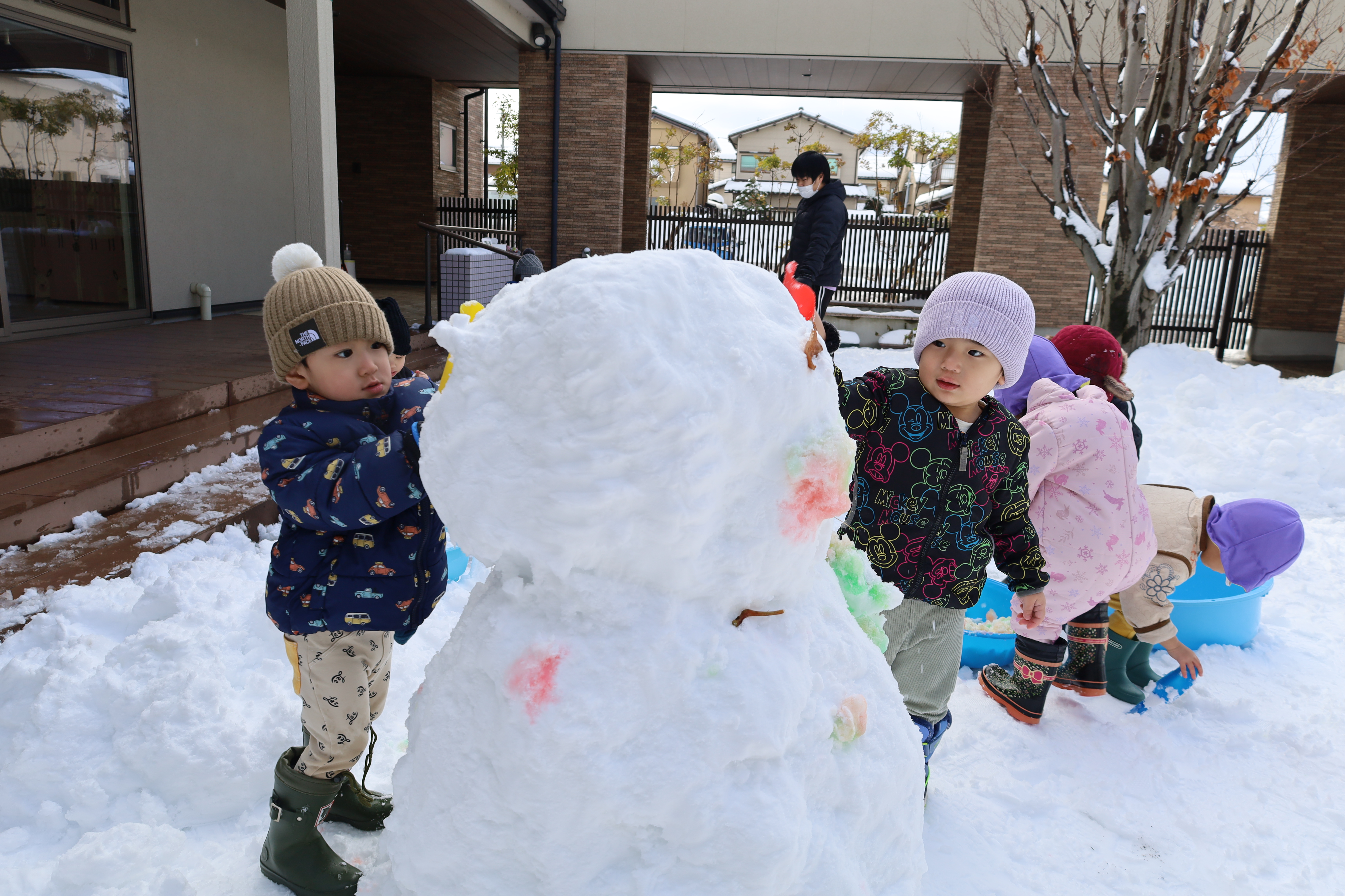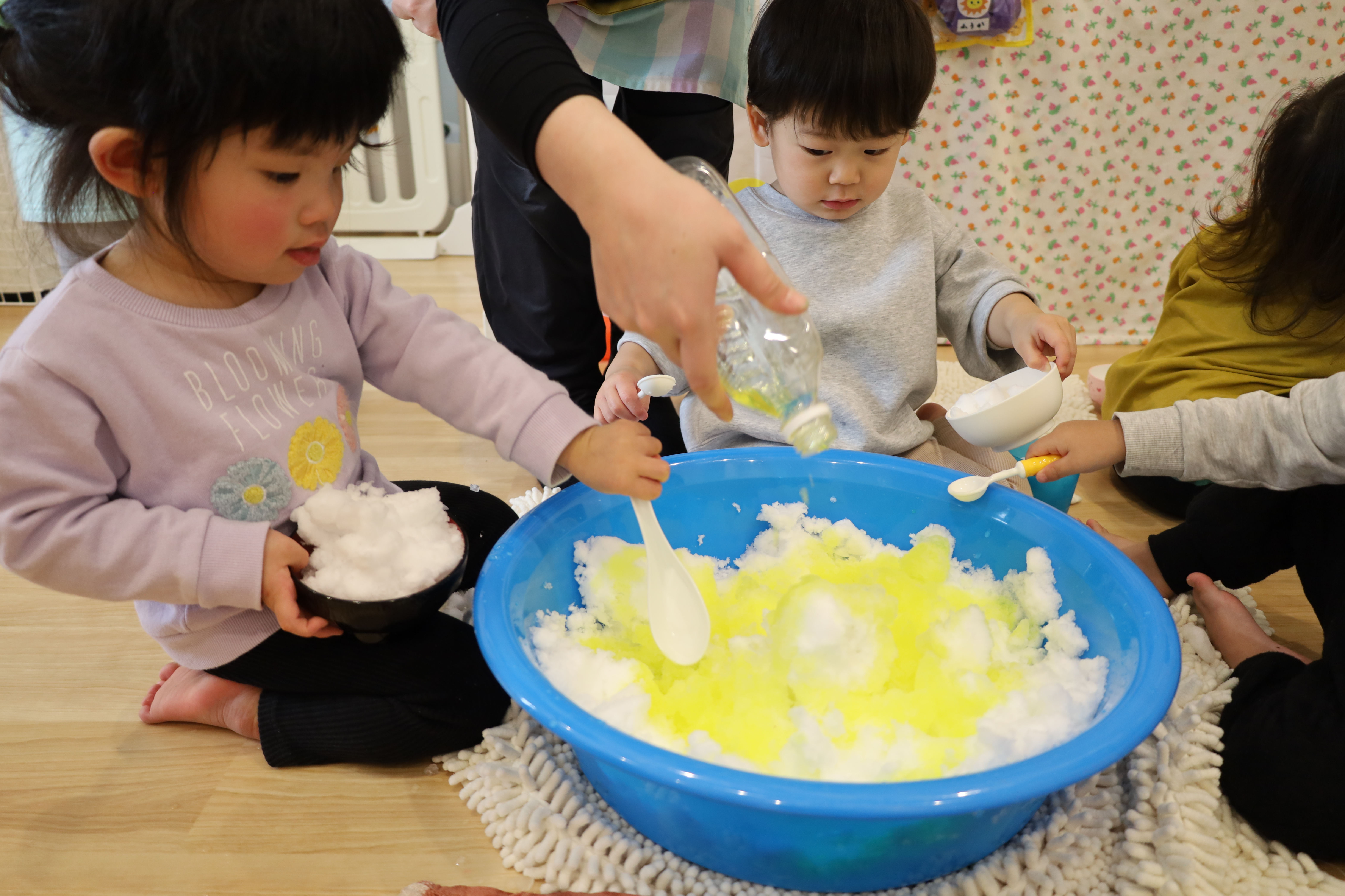 2026.01.23 はなえみhoujikai 2026/1/23 いろいろ雪 ツイート シェア はてブ 送る Pocket はなたね お部屋にタライいっぱいの雪を持ち込んで・・・ 山盛りの雪! ご飯みたい⁉ もっともっと、たくさんすくって・・。 すくって・・・。 ギュっと握って。 そこへ食紅で作った色水をかけると・・・・・ バナナ色? きれ~い!!かき氷みたいだね。 かき混ぜて・・・・。 早速すくって、 う~ん、おいし! どう?おいしそうでしょ! 雪が溶けるまで雪のままごとを楽しみました。 園庭であそんでいたみのりさんに色水をおすそ分け。 みのりぐみさんでつくった大きなゆきだるまにお化粧!! 削って、形を整えて・・・・ 可愛くなったね。 きれいな雪玉もたくさんできました。 バケツの帽子をかぶせて・・・・。 帽子、落っことしたらダメだよ! 1月23日 今日の給食 離乳食・後期 かゆ・鶏肉と野菜のやわらか煮・きゅうりのサラダ・フルーツ(バナナ) 幼児食 ツナのあおさおにぎり・鶏肉と野菜の生姜炒め・春雨サラダ・フルーツ(バナナ) 幼児食・午後おやつ チーズごま蒸しパン・牛乳