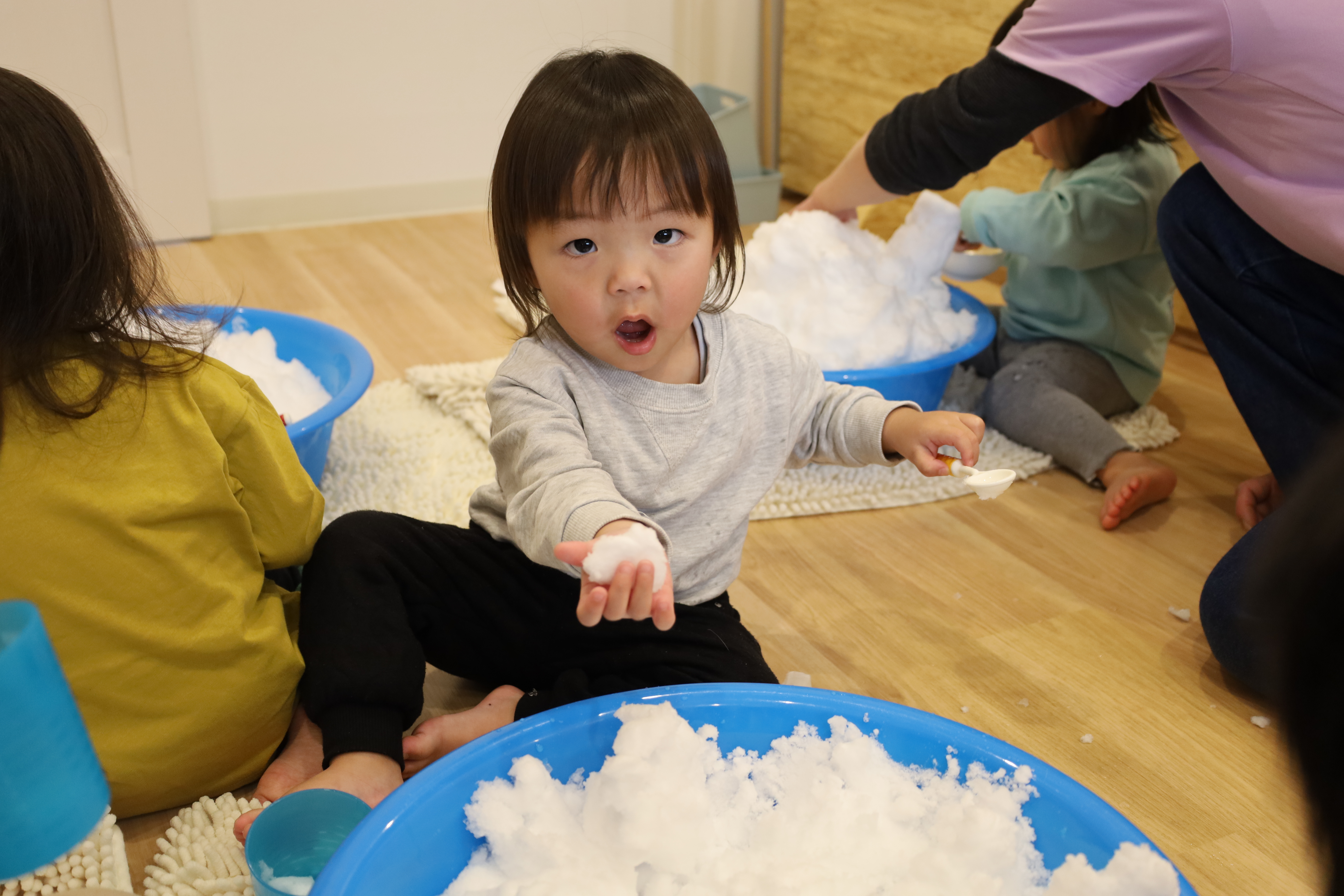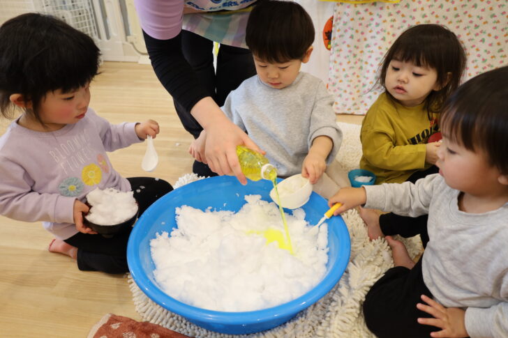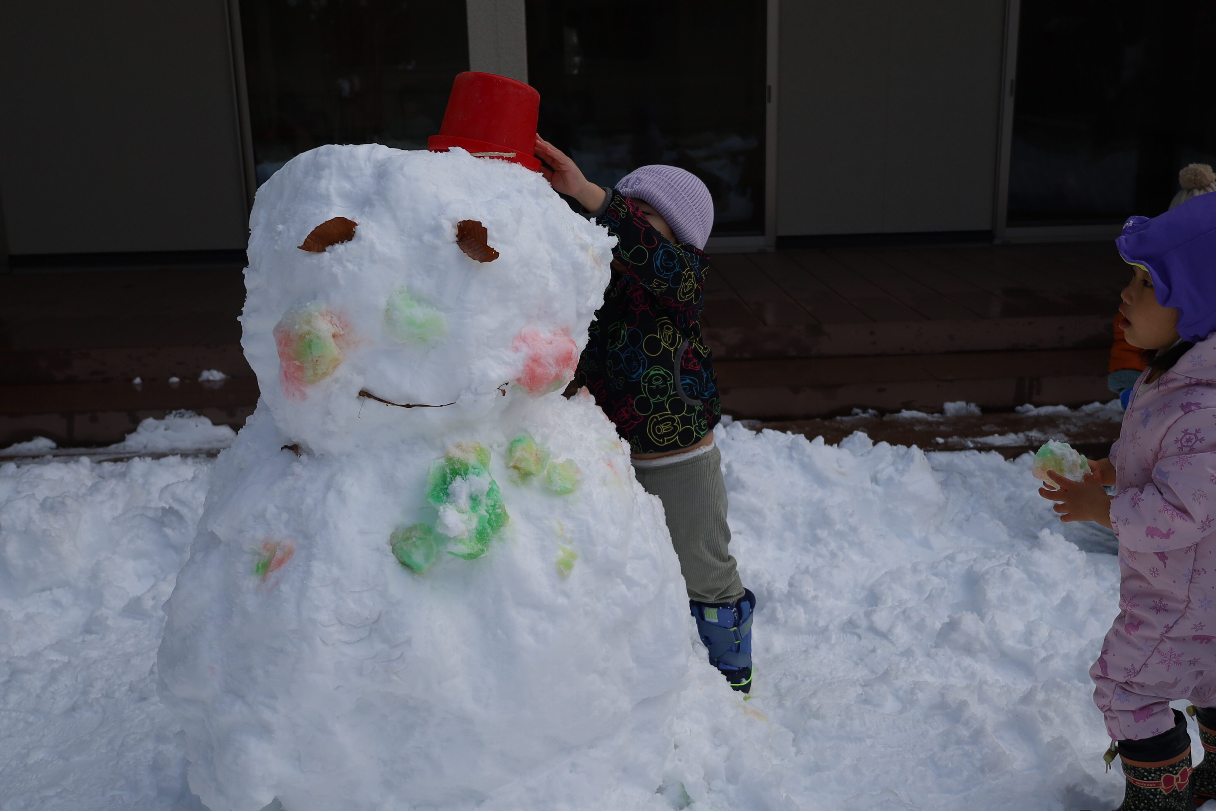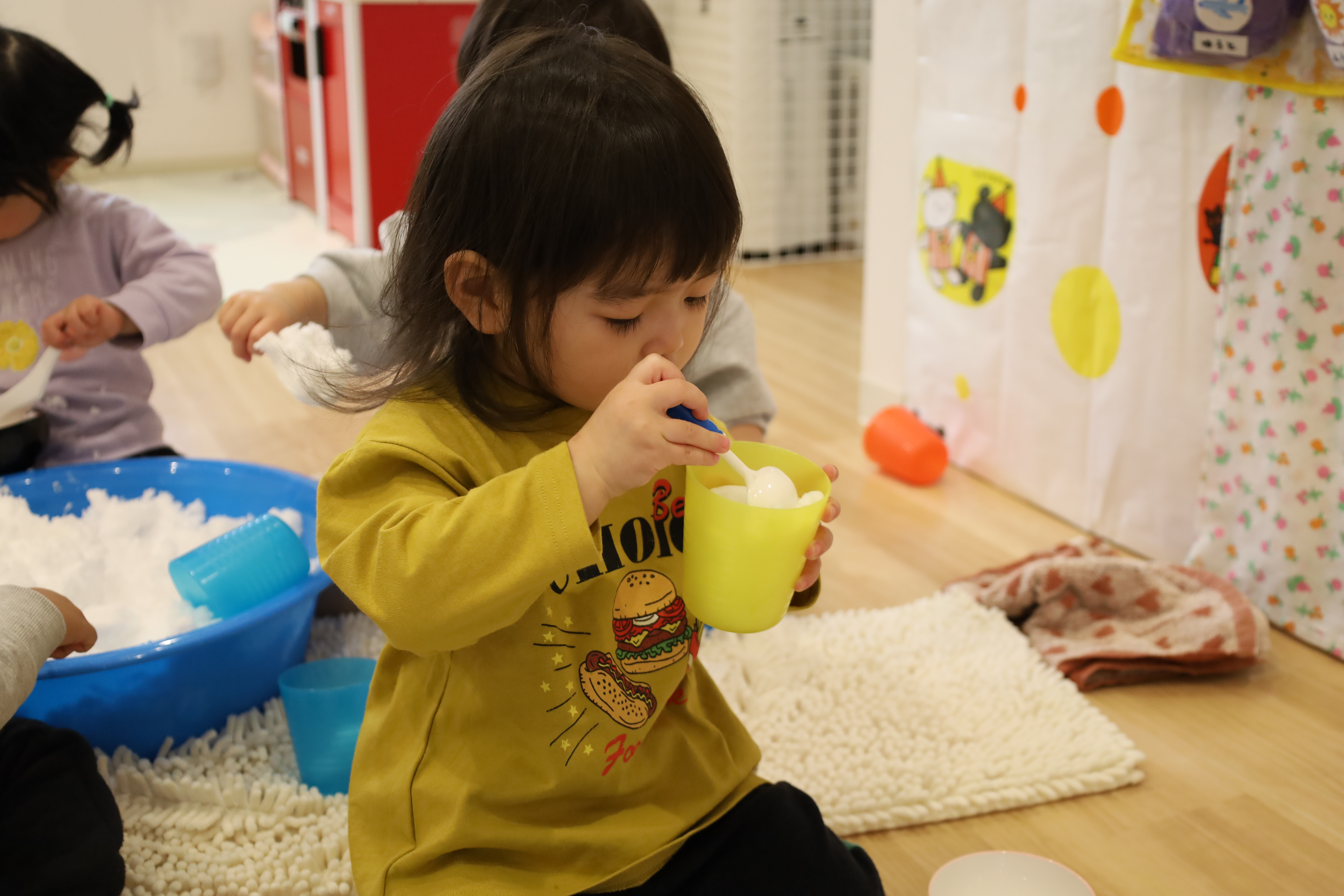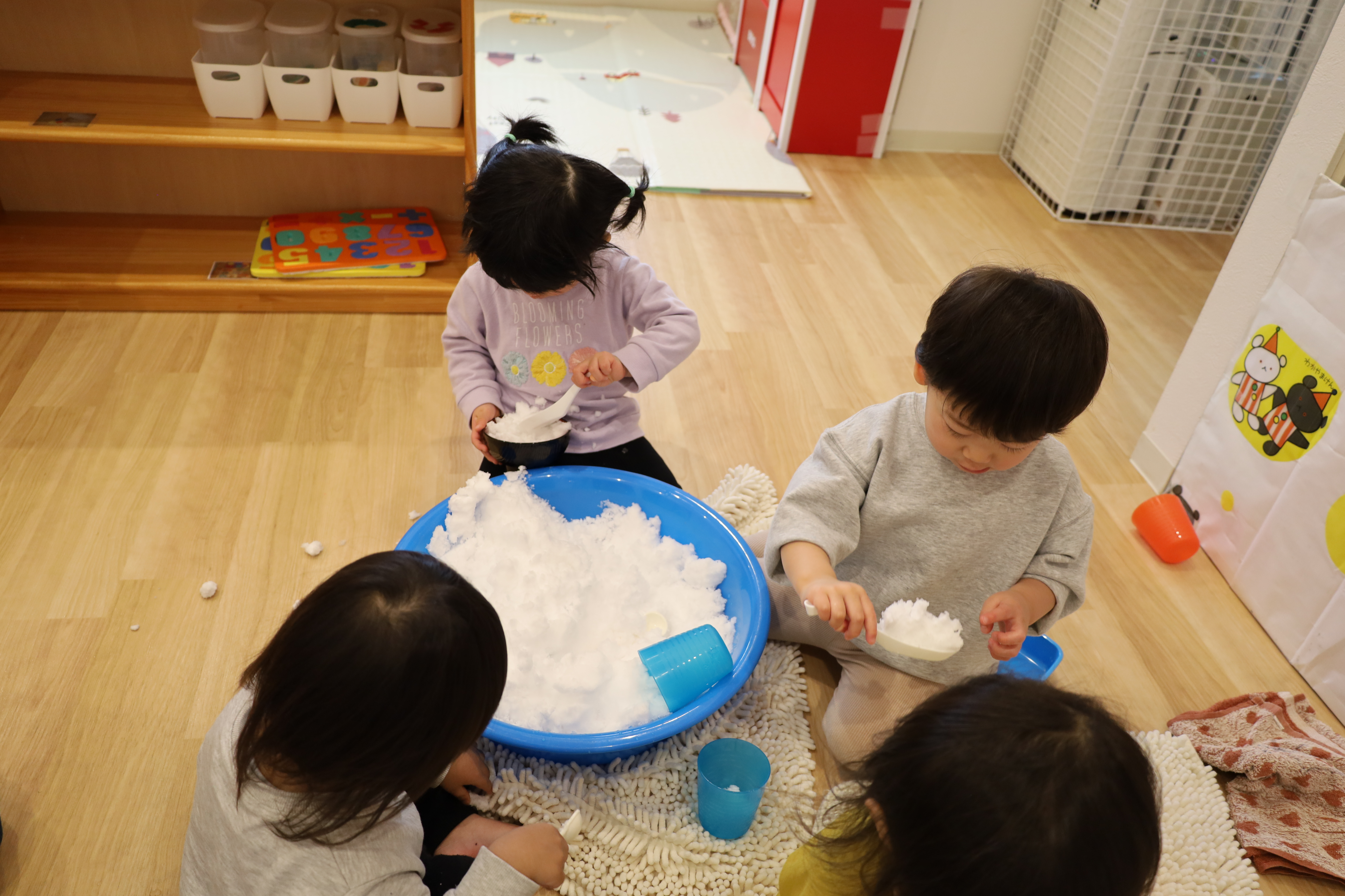 2026.01.23 はなえみhoujikai 2026/1/23 いろいろ雪 ツイート シェア はてブ 送る Pocket はなたね お部屋にタライいっぱいの雪を持ち込んで・・・ 山盛りの雪! ご飯みたい⁉ もっともっと、たくさんすくって・・。 すくって・・・。 ギュっと握って。 そこへ食紅で作った色水をかけると・・・・・ バナナ色? きれ~い!!かき氷みたいだね。 かき混ぜて・・・・。 早速すくって、 う~ん、おいし! どう?おいしそうでしょ! 雪が溶けるまで雪のままごとを楽しみました。 園庭であそんでいたみのりさんに色水をおすそ分け。 みのりぐみさんでつくった大きなゆきだるまにお化粧!! 削って、形を整えて・・・・ 可愛くなったね。 きれいな雪玉もたくさんできました。 バケツの帽子をかぶせて・・・・。 帽子、落っことしたらダメだよ! 1月23日 今日の給食 離乳食・後期 かゆ・鶏肉と野菜のやわらか煮・きゅうりのサラダ・フルーツ(バナナ) 幼児食 ツナのあおさおにぎり・鶏肉と野菜の生姜炒め・春雨サラダ・フルーツ(バナナ) 幼児食・午後おやつ チーズごま蒸しパン・牛乳