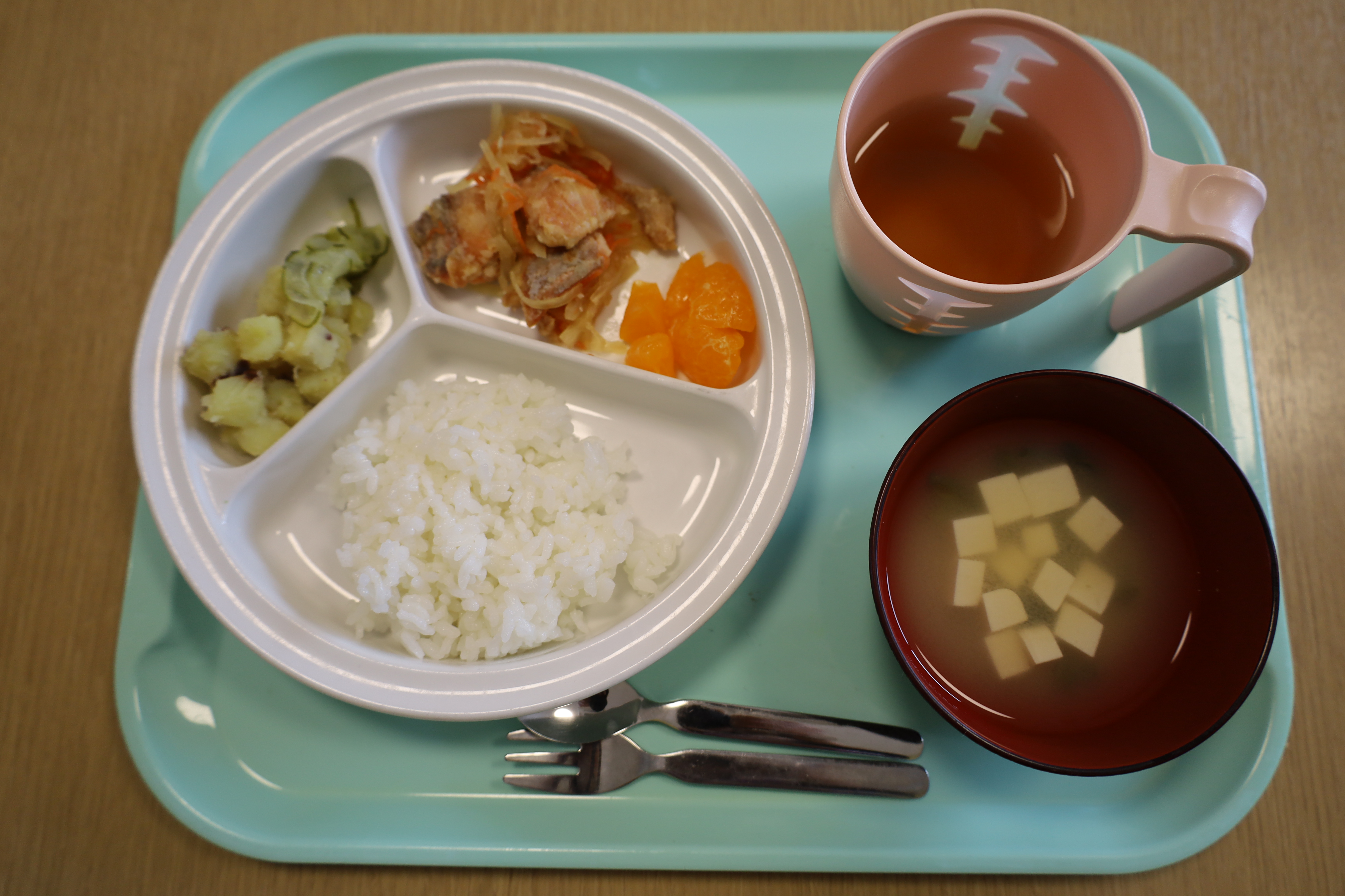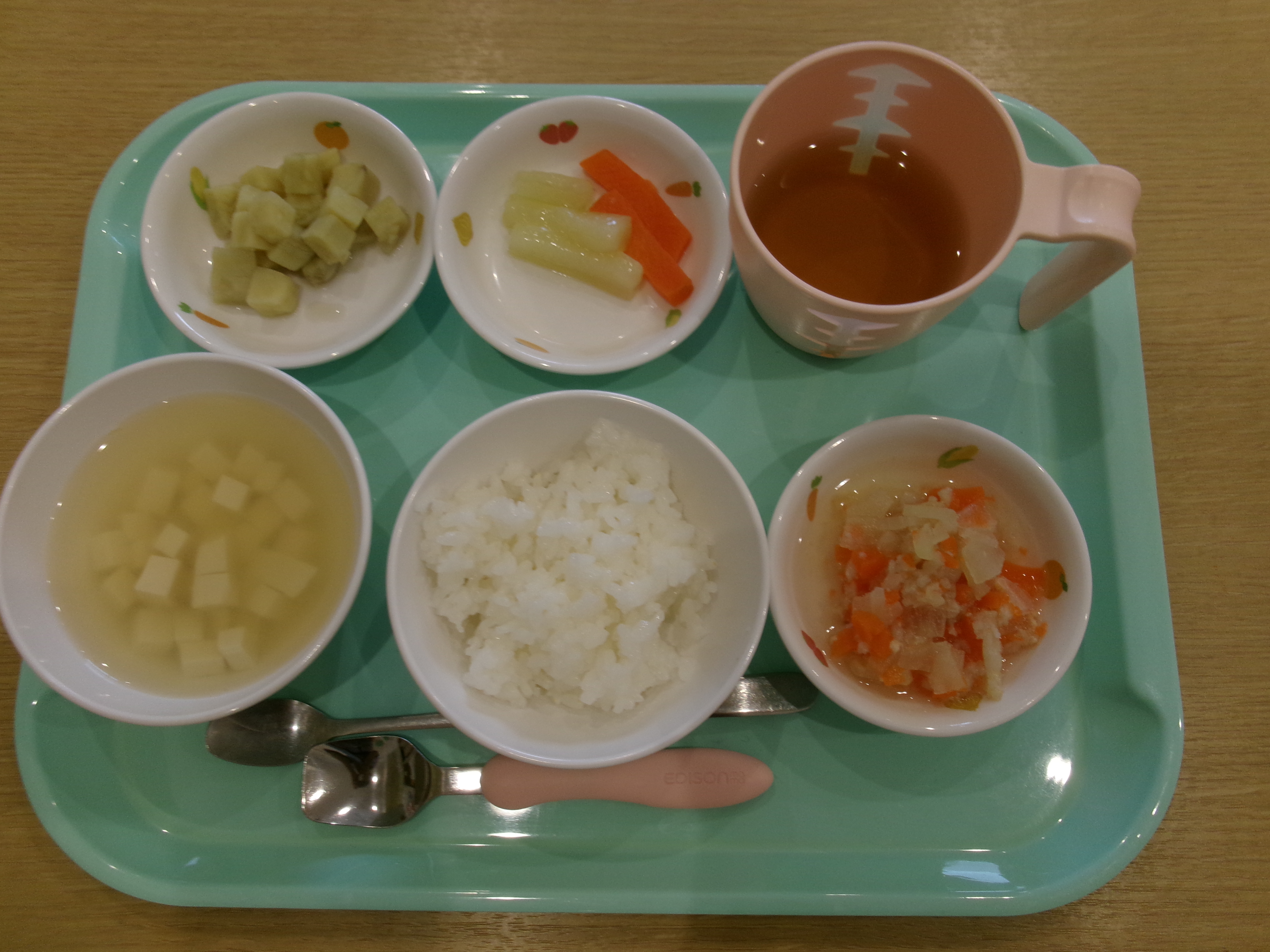 2026.01.29 はなえみhoujikai 2026/1/29 今日の給食 ツイート シェア はてブ 送る Pocket ※本日の活動のようすのブログはお休みします。 離乳食・後期 かゆ・助宗タラと野菜のだし煮・さつまいもとキュウリのサラダ・味噌汁 フルーツ(みかん) 幼児食 ご飯・鮭と野菜の南蛮漬け・さつま芋サラダ・味噌汁(豆腐・万能ねぎ)フルーツ(みかん) 幼児食・午後おやつ 牛乳・いちごジャムおから蒸しパン