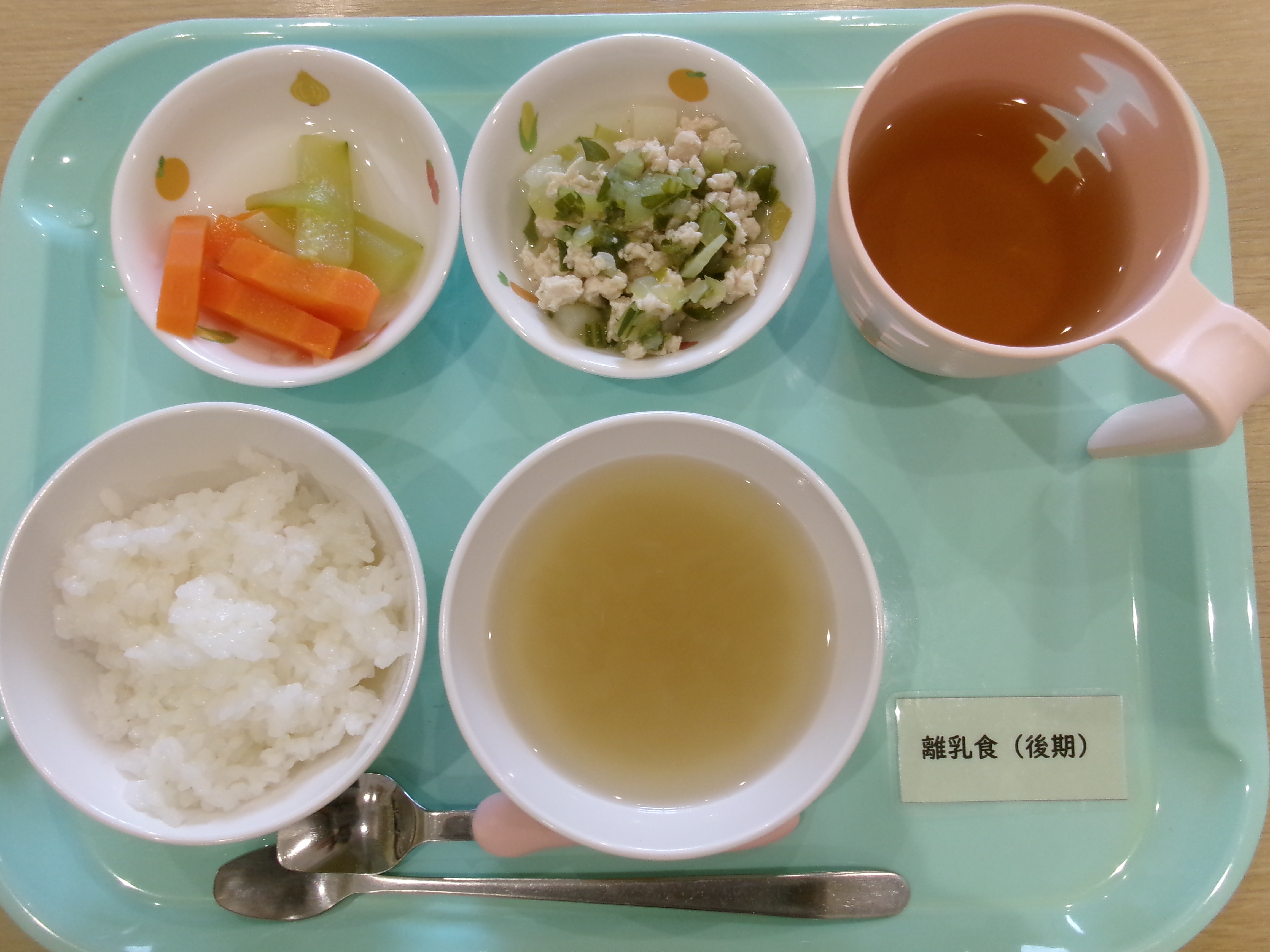 かゆ・鶏肉と野菜のほくほく煮・きゅうりと人参のサラダ・味噌汁