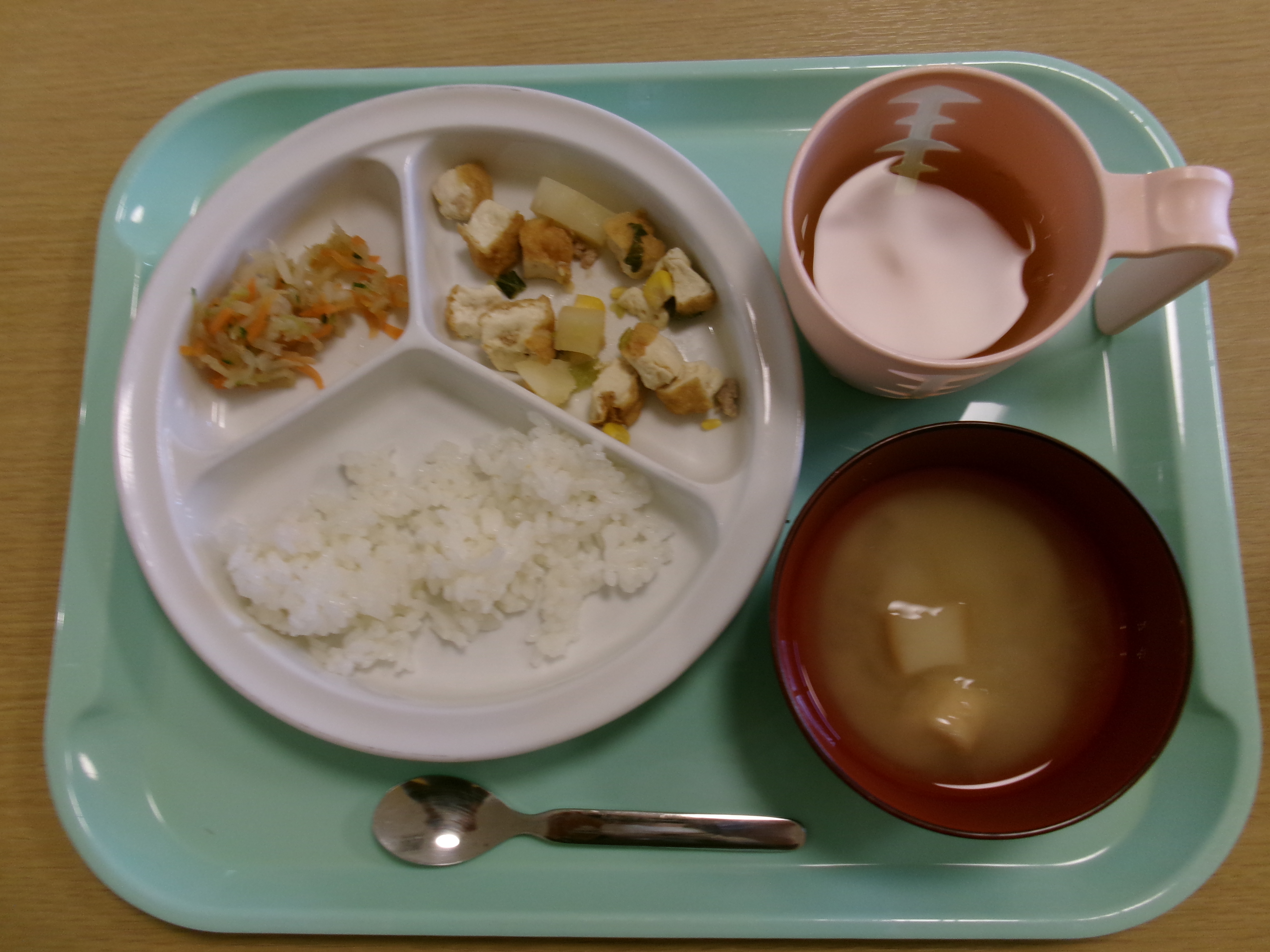 ご飯・厚揚げと野菜のさっぱり炒め・切干大根ときゅうりの和え物・味噌汁(大根・もやし)