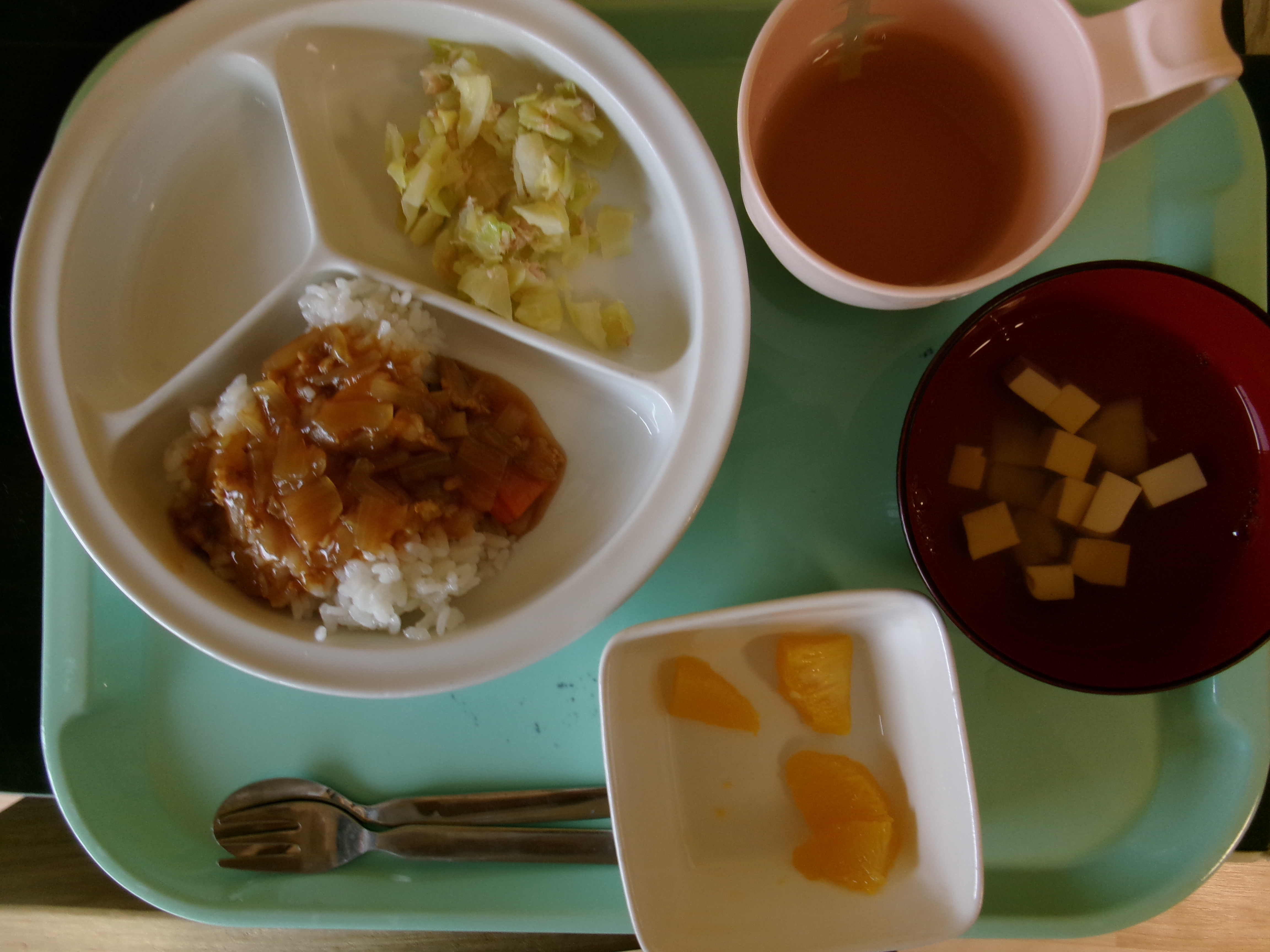 チキンハヤシライス・キャベツのツナサラダ・スープ(豆腐・じゃが芋)フルーツ(オレンジ)