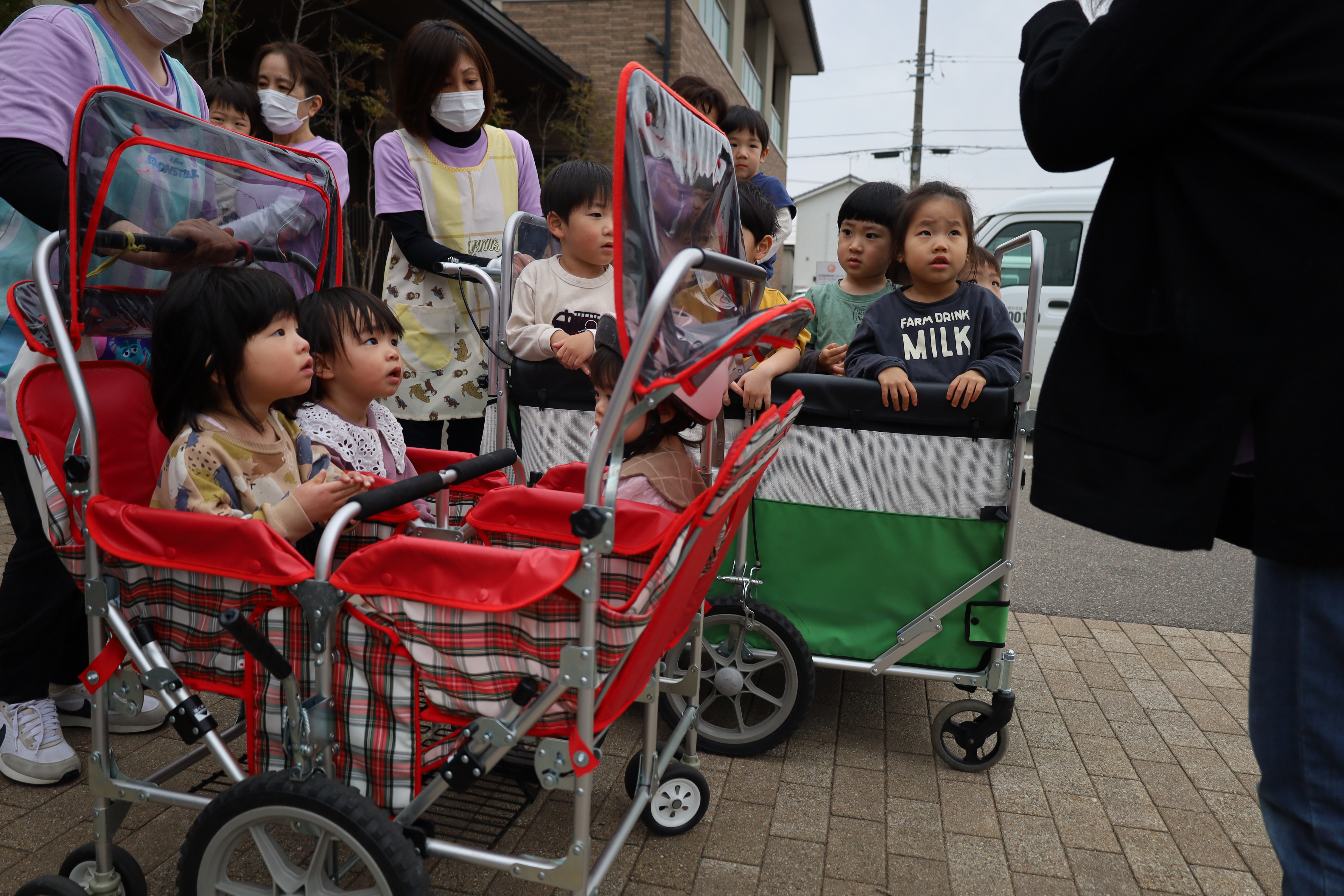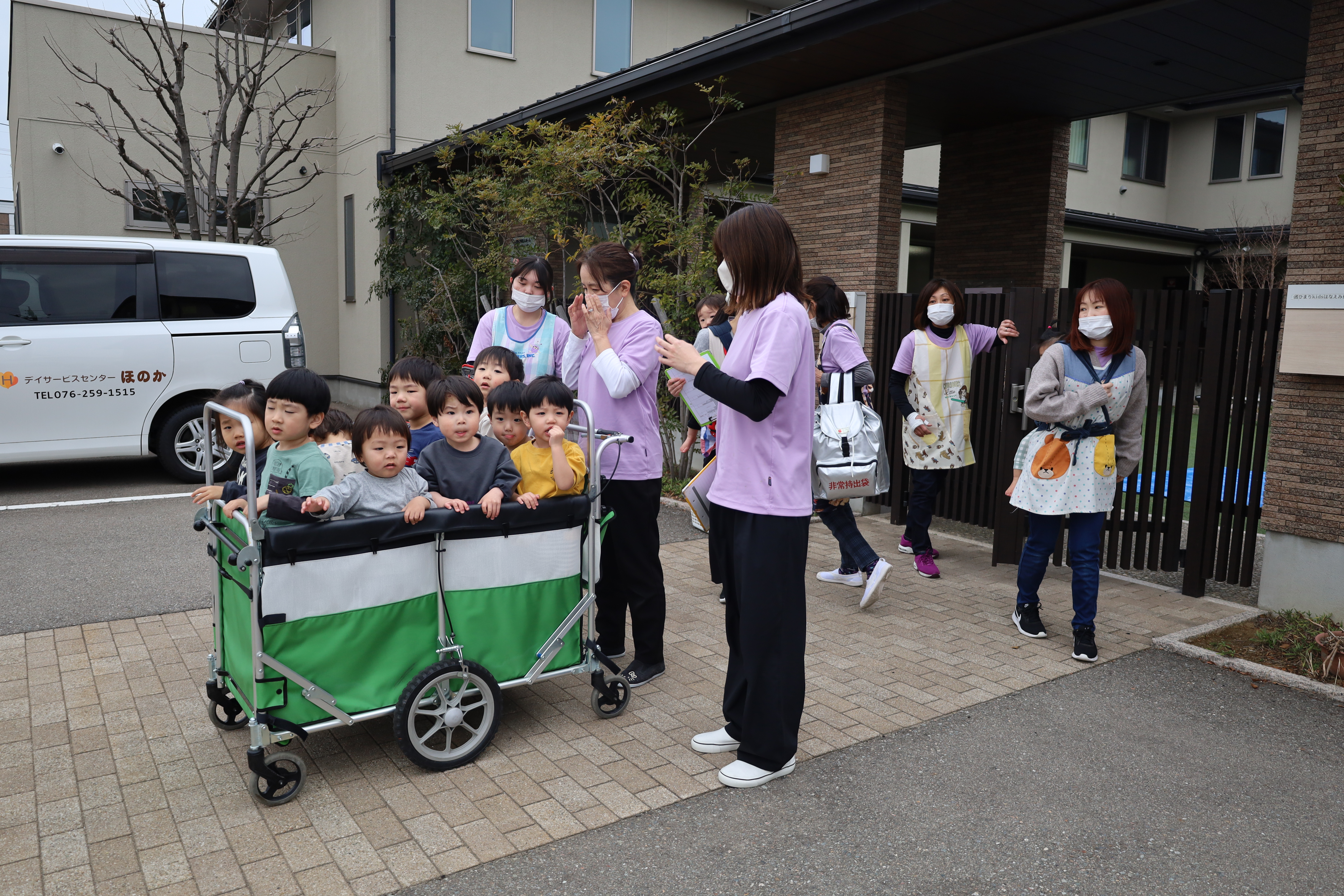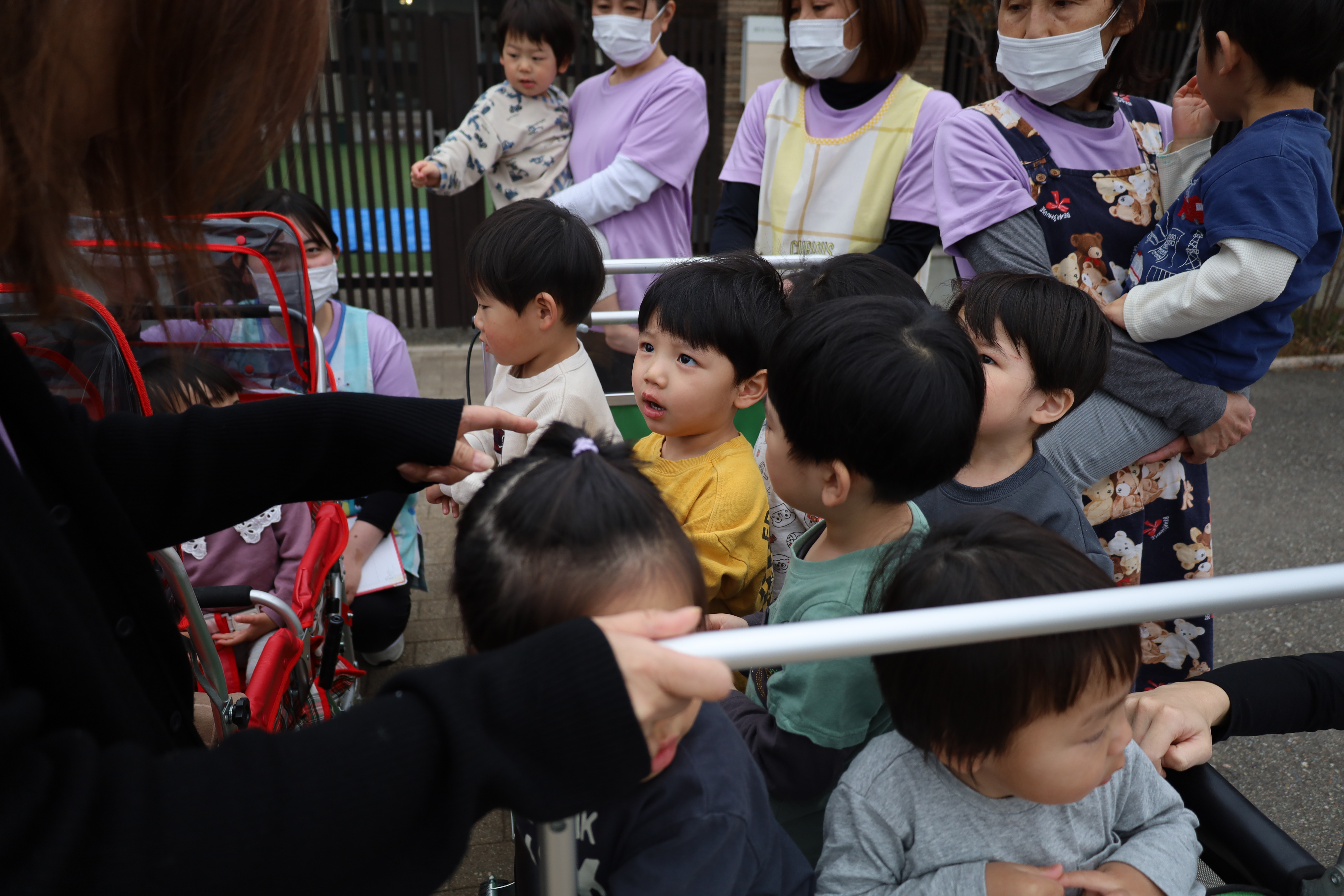 大きい子たちは避難車に乗って