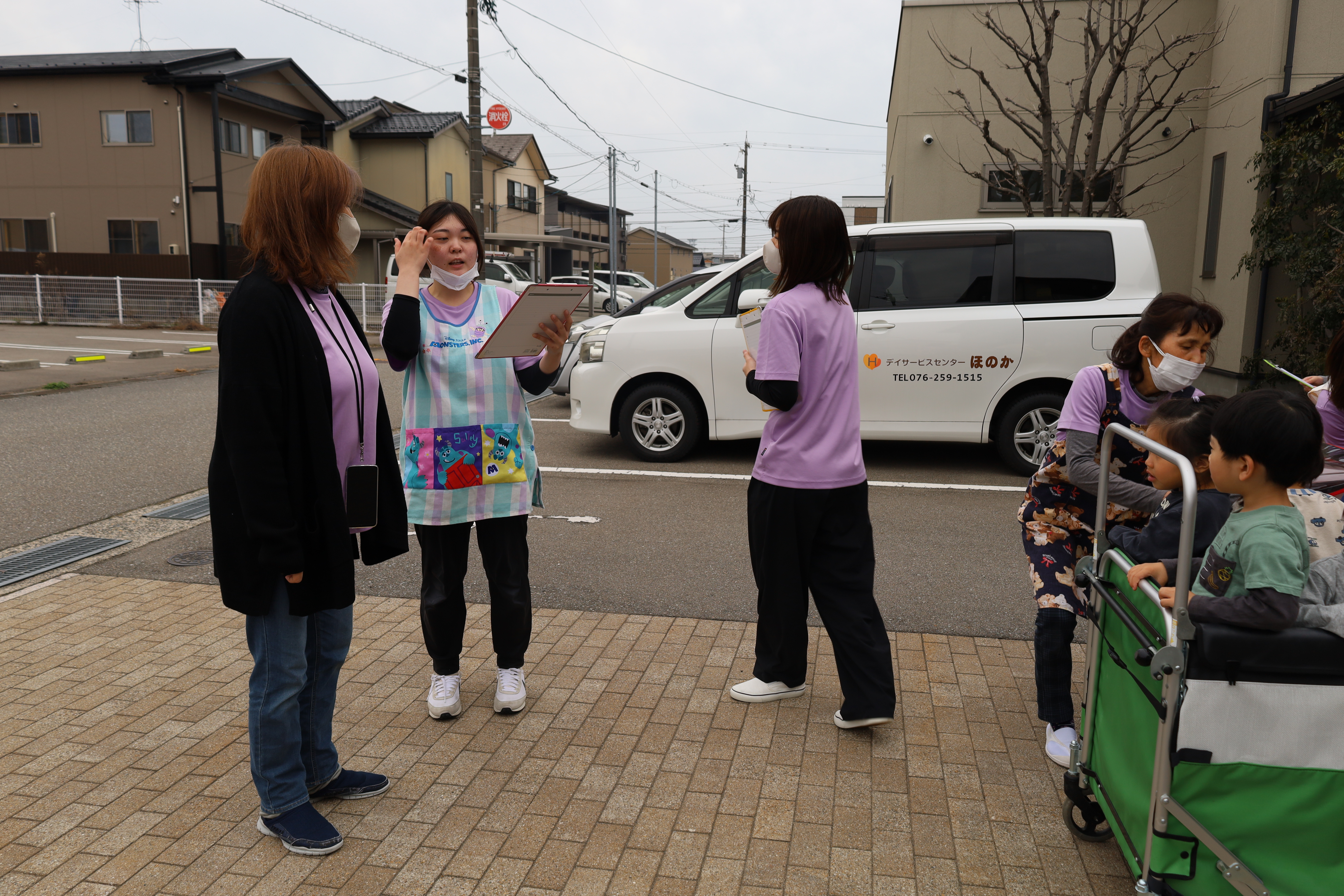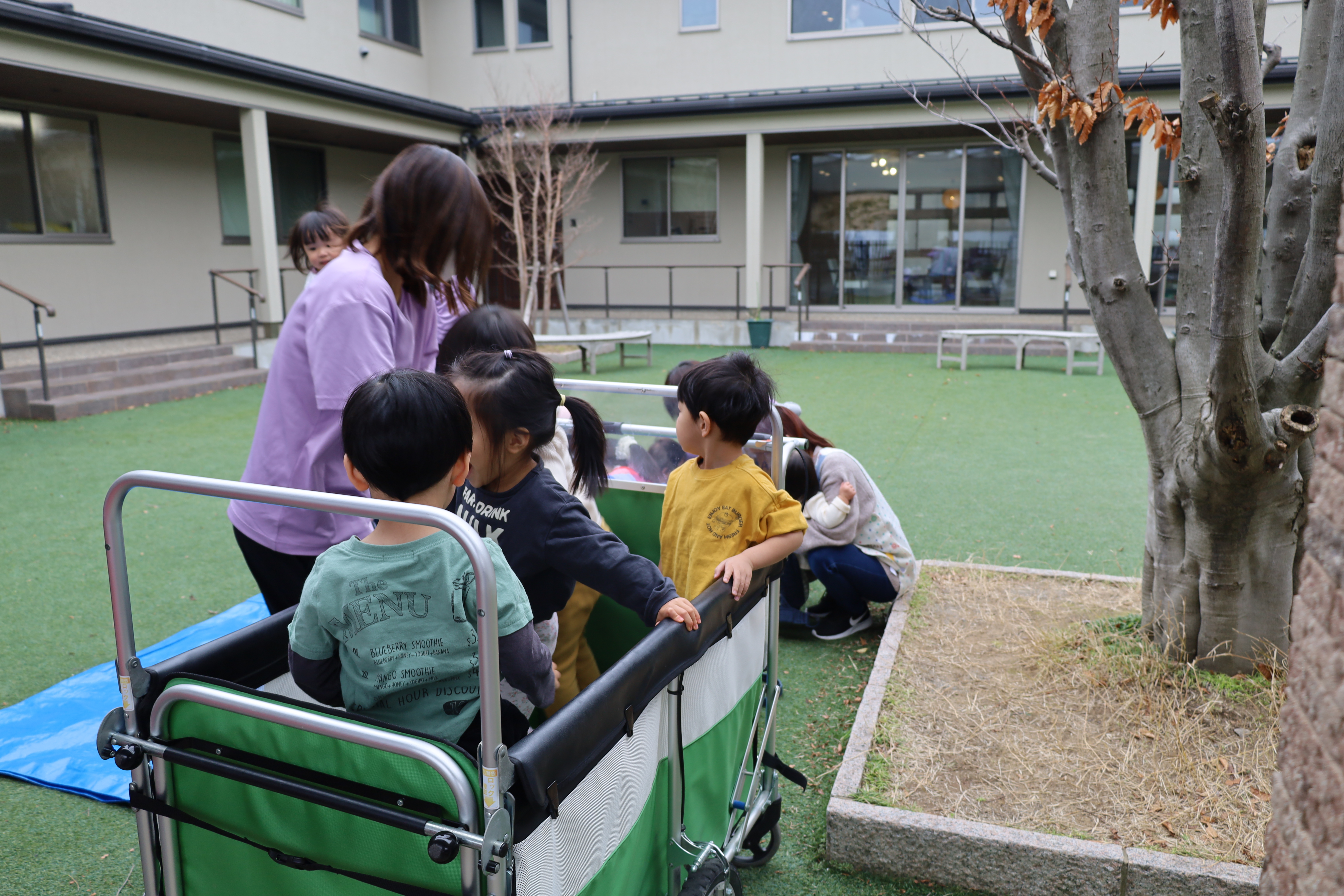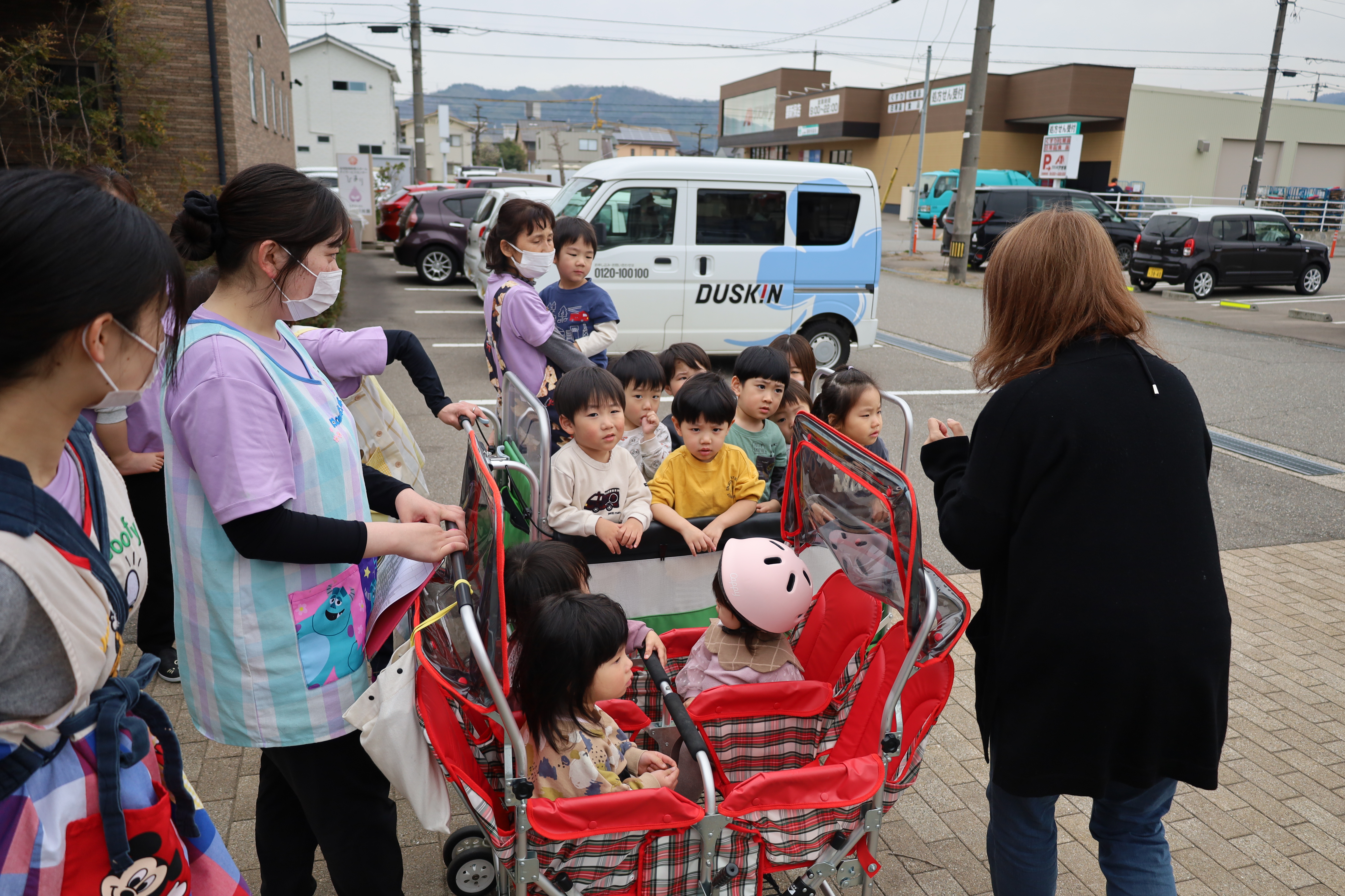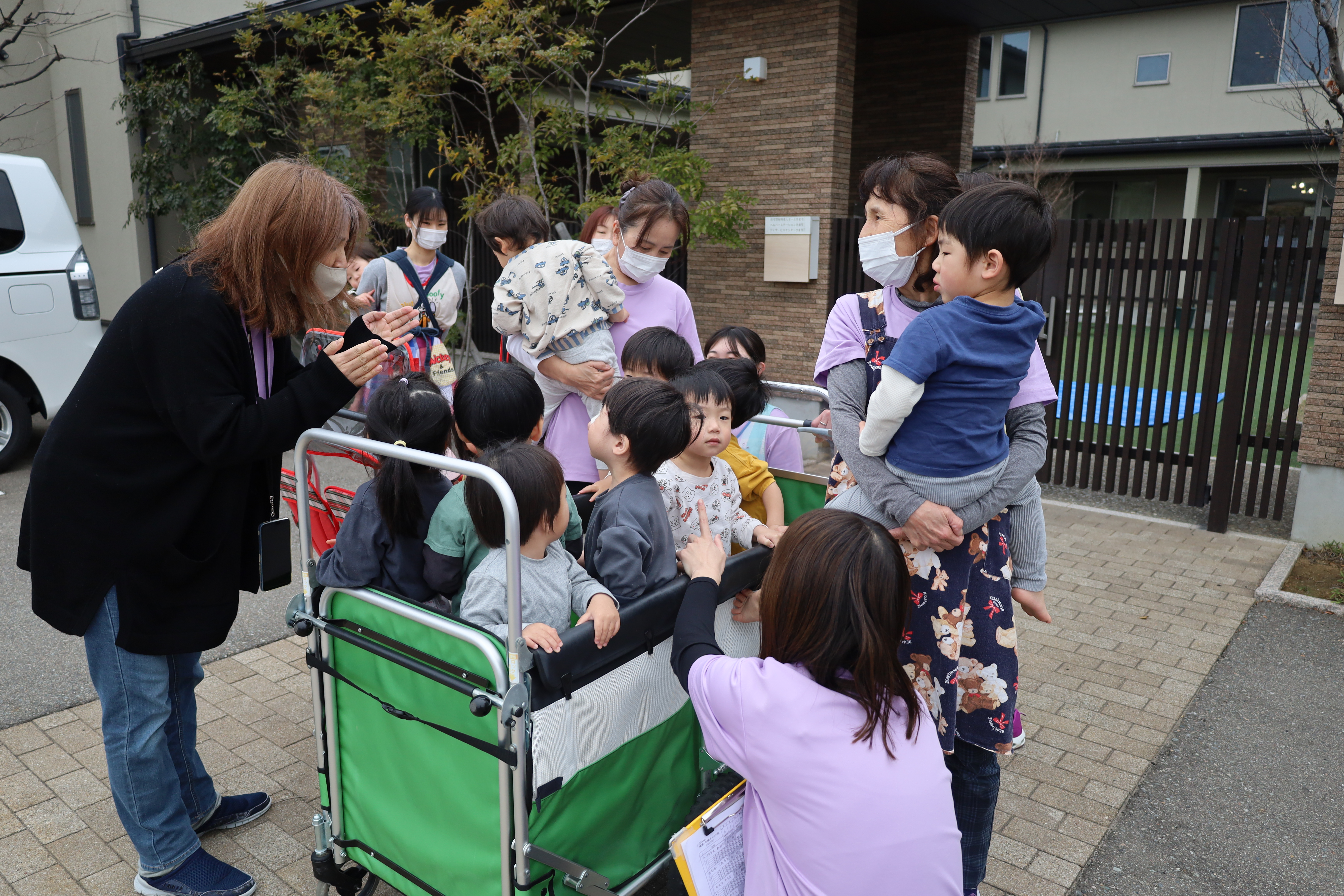 大きい子たちは避難車に乗って