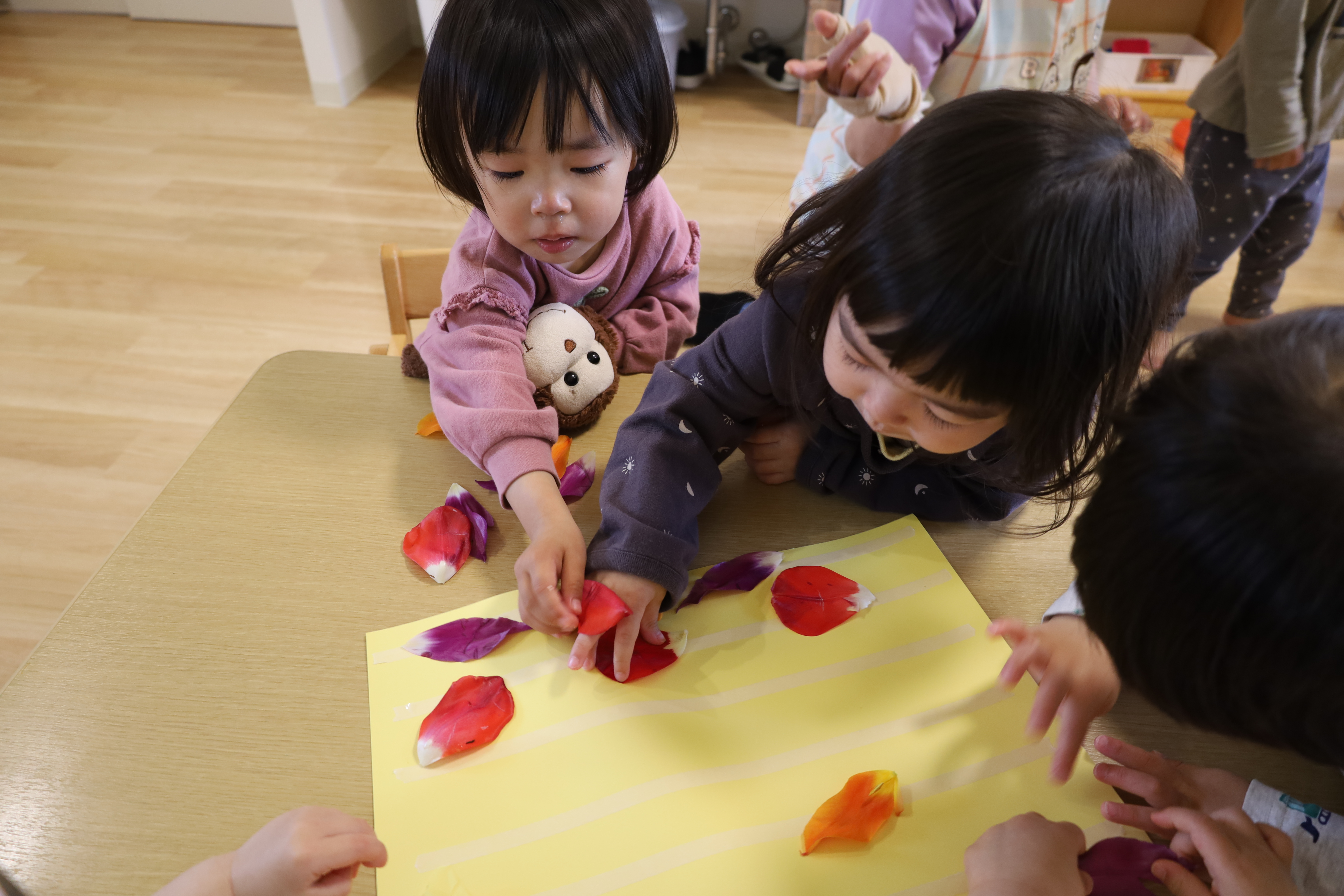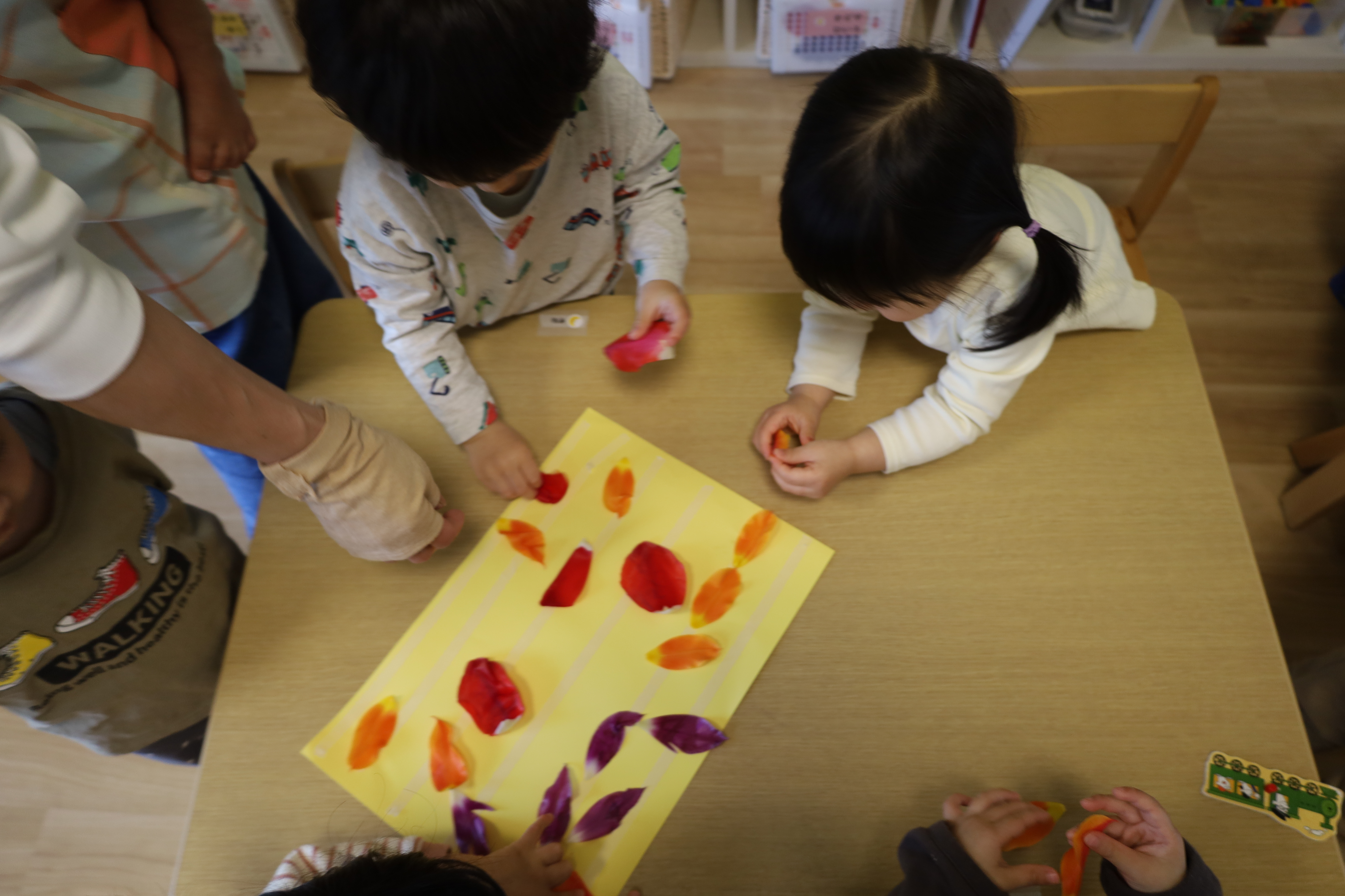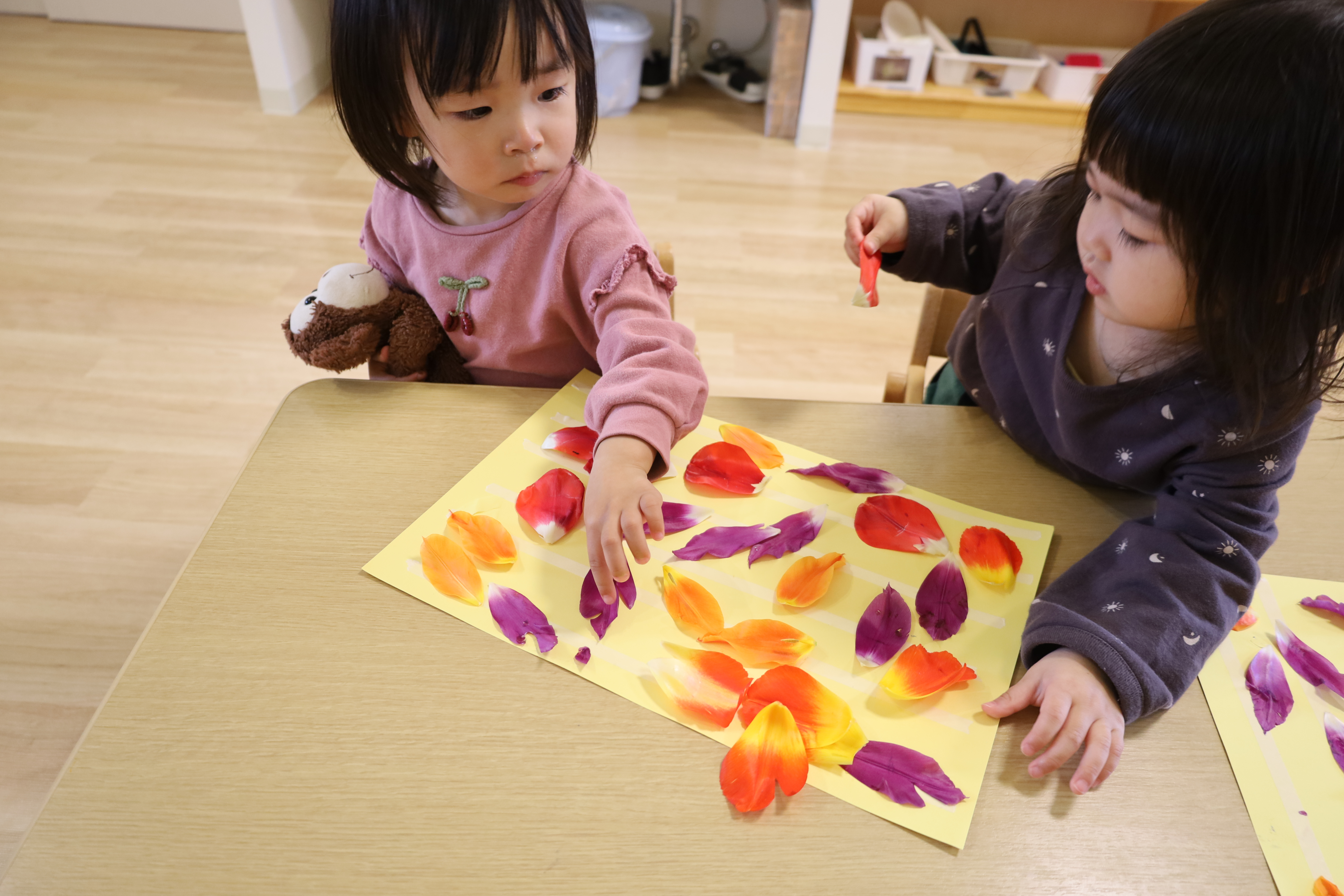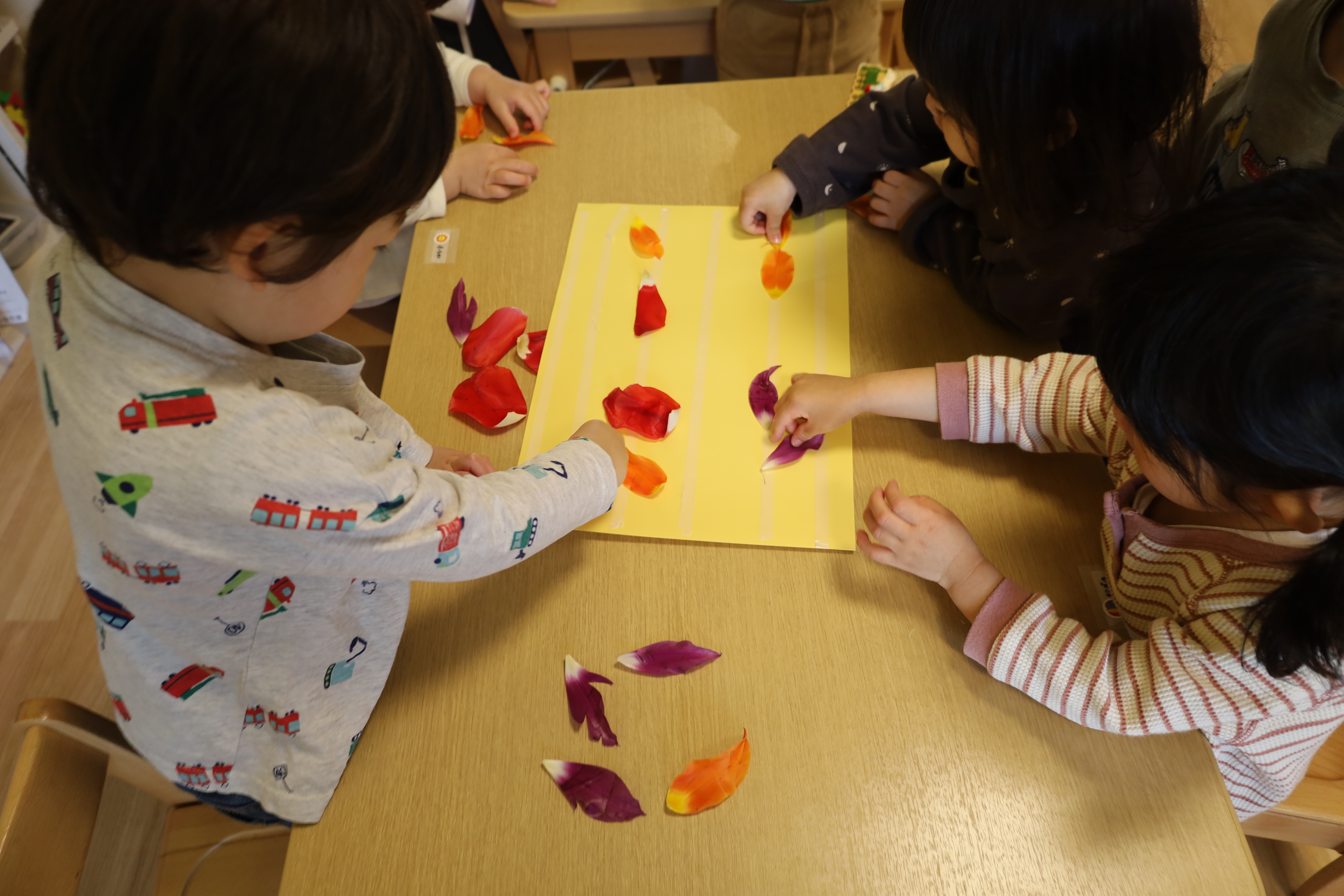 庭のチューリップの花びらを紙に貼ってみました。